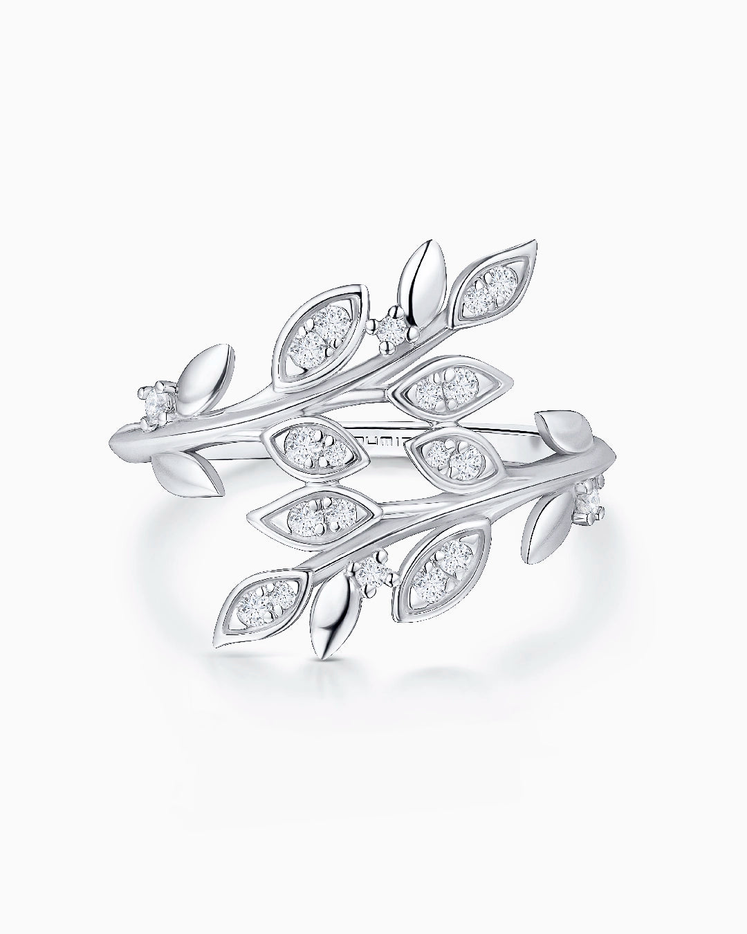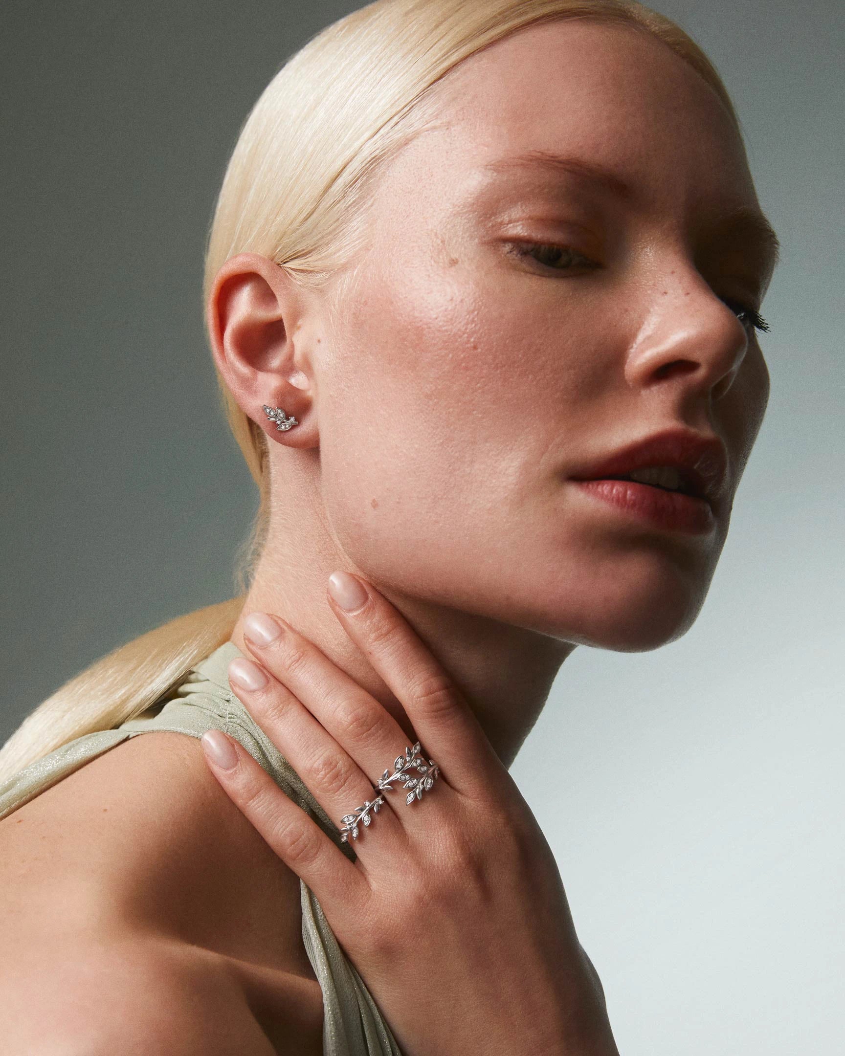 Anel de diamante aberto Dafne feito em ouro branco 18 quilates. Esta coleção é inspirada na metamorfose da ninfa Daphne em louro, símbolo de renascimento e esperança. Além disso, como protetora das florestas, Daphne representa um estado idílico de harmonia na natureza. Para refletir esse sentimento, bem como a força vital do louro, nossos designers criaram um motivo botânico que alterna folhas de diferentes tamanhos, algumas lisas e outras cravejadas de diamantes naturais. A justaposição de texturas resultante dessa combinação dá vida a uma joia de caráter cativante e envolvente, um lembrete de que a natureza é a musa suprema. Deixe-se surpreender por Dafne e encontre o toque bucólico perfeito para elevar qualquer estilo.