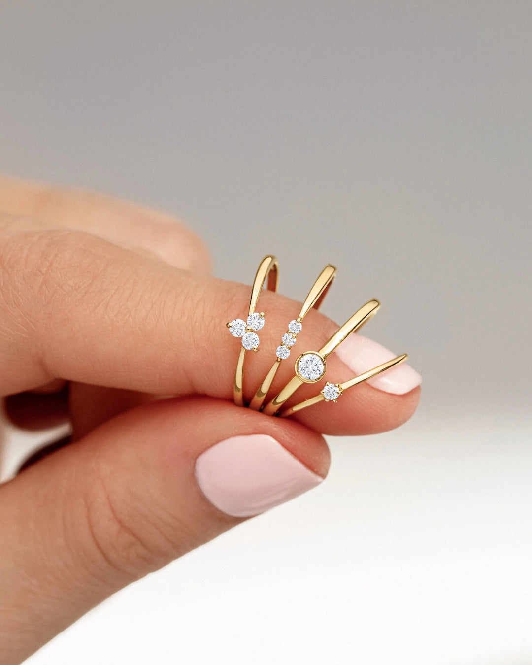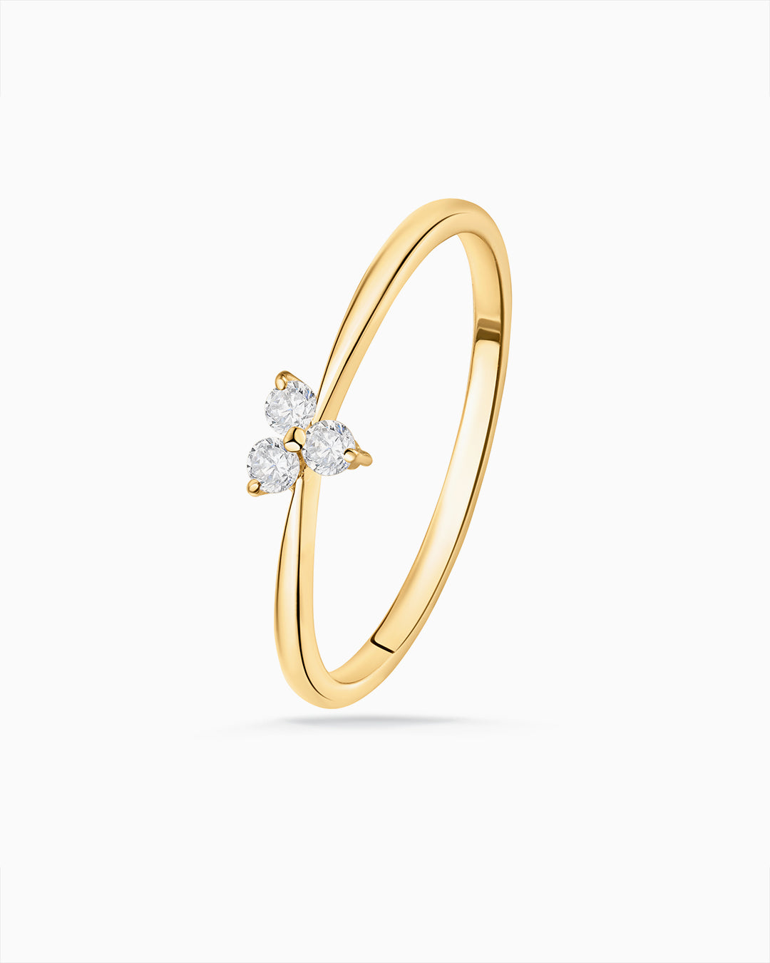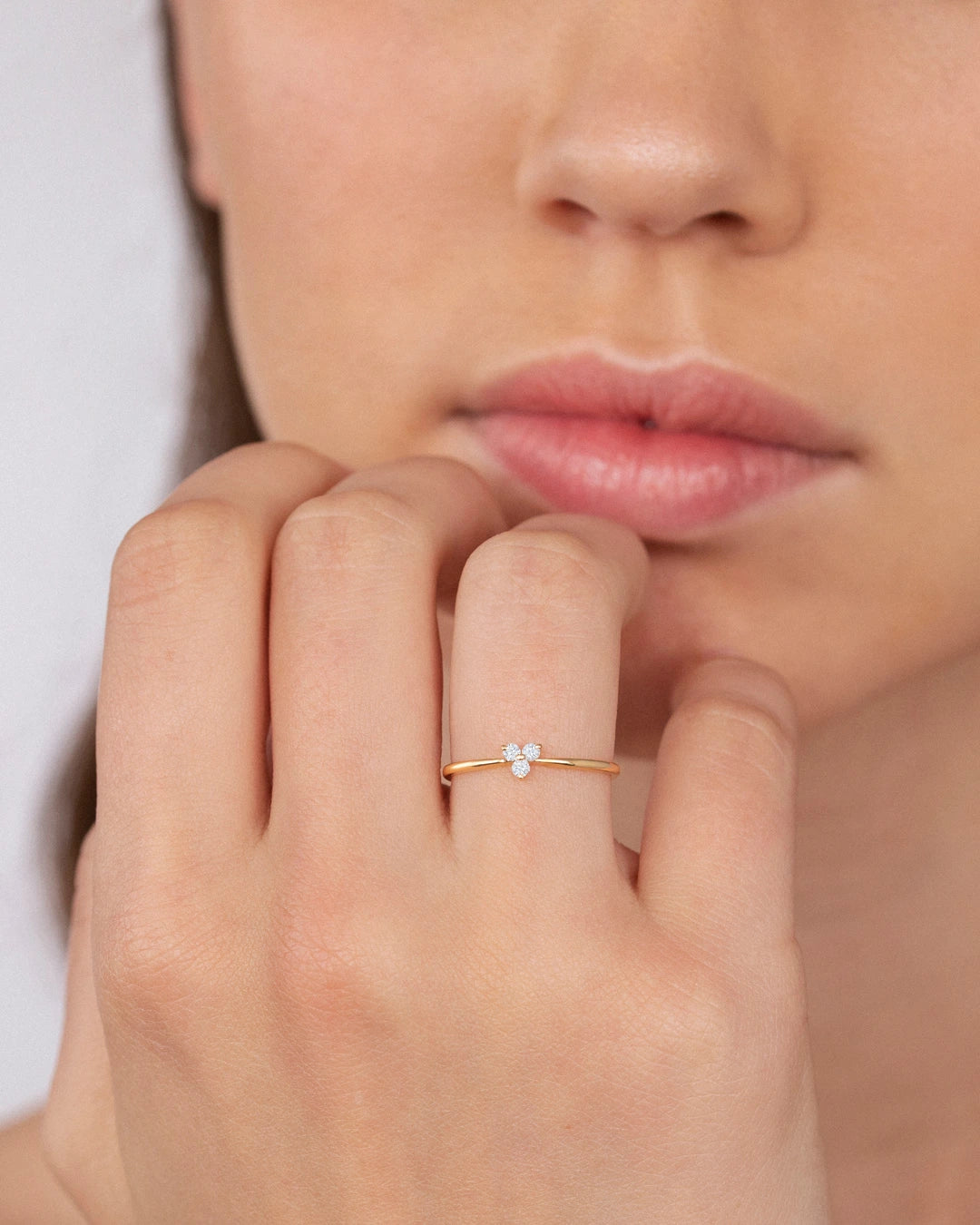 Anel de trevo com diamantes engastados em ouro amarelo 18 quilates. Este anel é uma delicada declaração de amor e estilo que você pode carregar sempre com você. Disponível em ouro amarelo, rosa e branco 18K com diamantes. Uma joia básica, porém elegante, diamantes delicados se unem para criar um trevo de três folhas, dando forma a este maravilhoso amuleto que virou joia. Uma surpreendente exibição de luz que se materializa em um design que combina originalidade e elegância. Este anel delicado completa a coleção Clover, adicionando um toque sutil de luz e brilho. O anel de diamante Clover está disponível em três versões: ouro amarelo, rosa e branco de 18 quilates.