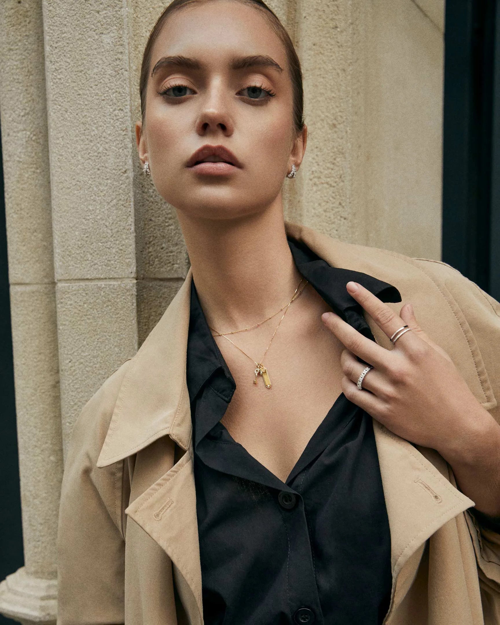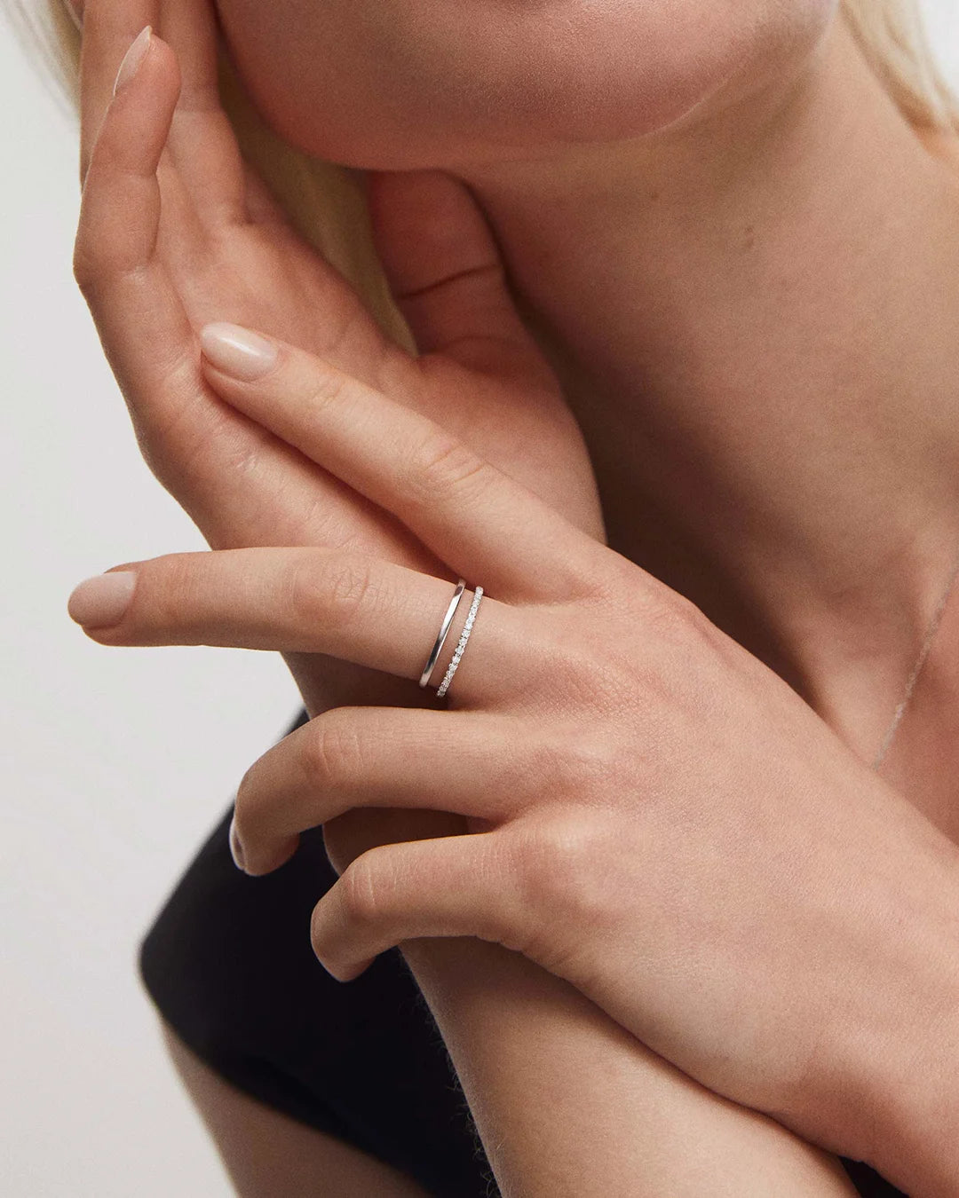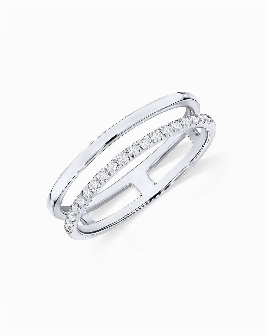 Anel Selene em ouro branco 18 quilates e diamantes. Selene, a deusa grega da lua, é a personificação do equilíbrio entre a luz e a escuridão. Da mesma forma, o design dualista desta coleção se distingue por um arco com acabamento em diamante e um arco liso, aparentemente separados, mas unidos em perfeita harmonia. Essa justaposição de elementos leves e foscos reflete a beleza de um suposto contraste que, na realidade, representa dois lados de um todo. Além do seu valor simbólico, este anel é uma escolha perfeita para quem procura uma joia sofisticada e moderna para uso diário. Sua essência contemporânea e brilho delicado acrescentam um toque único de distinção a qualquer estilo. Descubra o caráter radiante de Selene e deslumbre-se com sua natureza vanguardista.