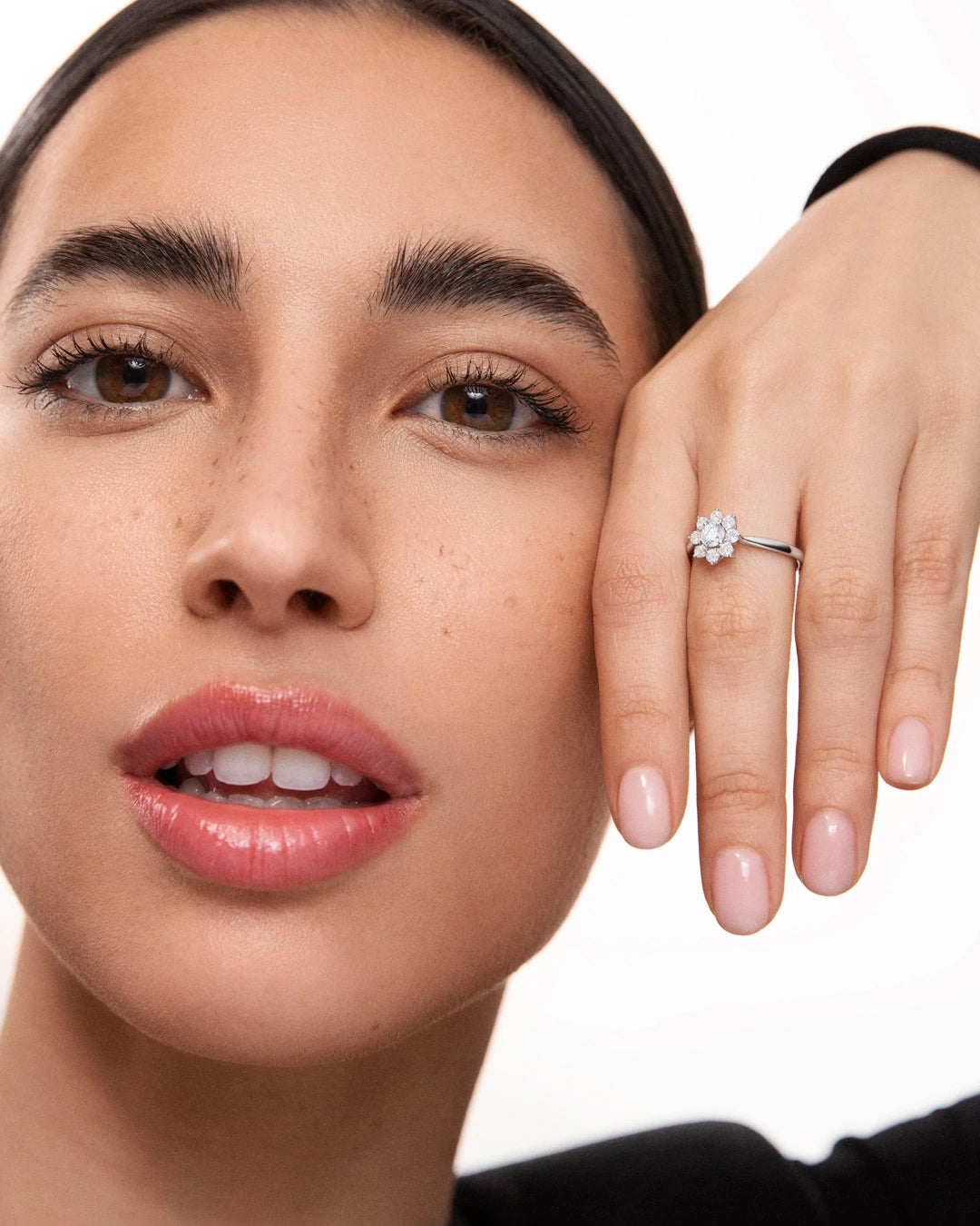 Anel solitário Rosette com diamante central montado em ouro branco 18 K. O anel Rosette Solitaire é a estrela da nossa coleção mais especial. Seu design é inspirado nas delicadas gotas de água que refletem a luz do amanhecer em um jardim de rosas. O brilho da manhã e as delicadas formas das pétalas acrescentam personalidade a uma coleção que celebra a beleza da natureza. Um anel tão original quanto elegante, formado por uma maravilhosa roseta central que evoca o formato de pétalas de rosa. Uma peça de joalheria fina cujos diamantes proporcionam um brilho único, tornando-o um anel ideal para qualquer ocasião. Perfeito para combinar com as outras peças da coleção Rosette. O anel Rosette Solitaire está disponível em duas versões adicionais de 0,34 e 0,48 quilates.