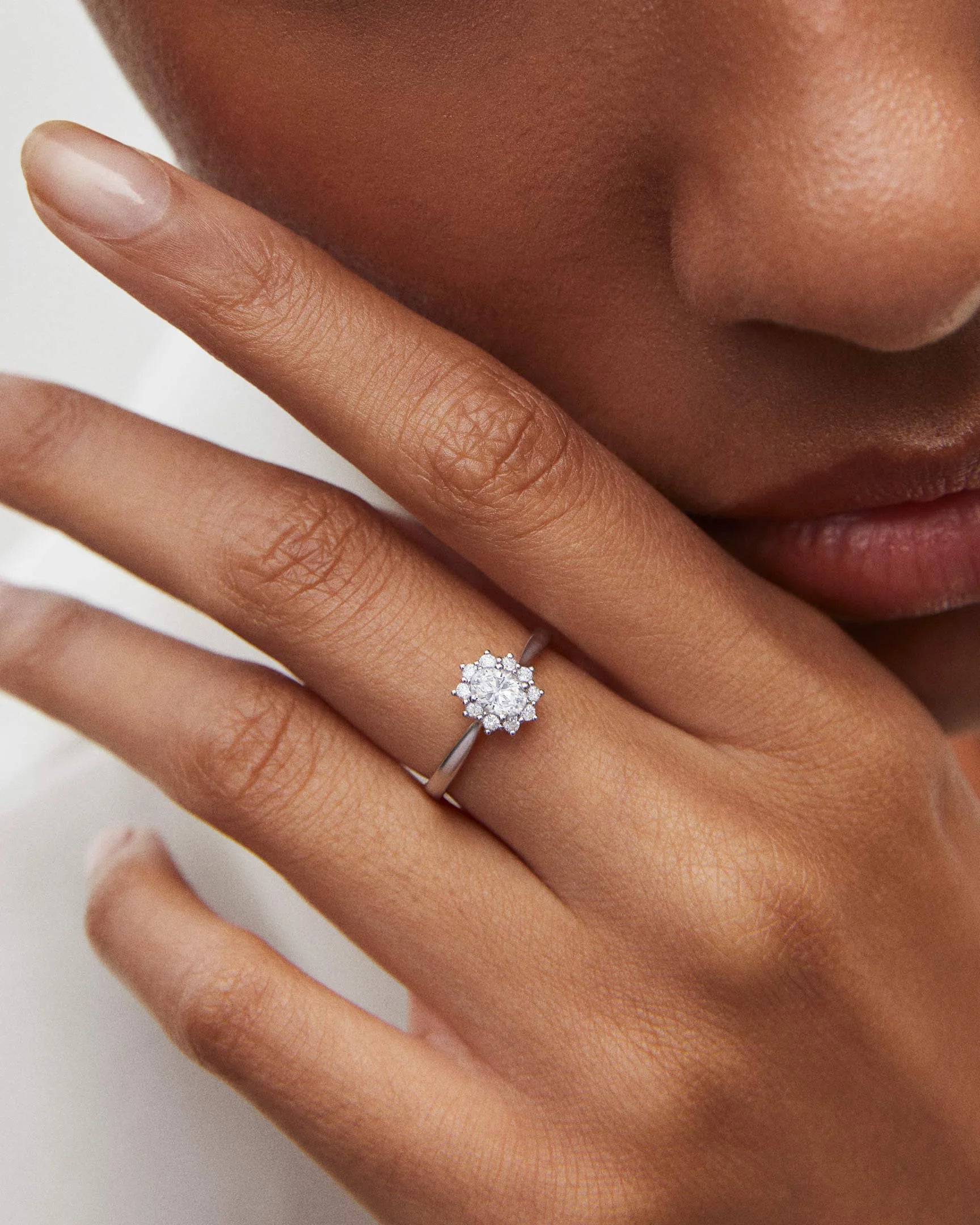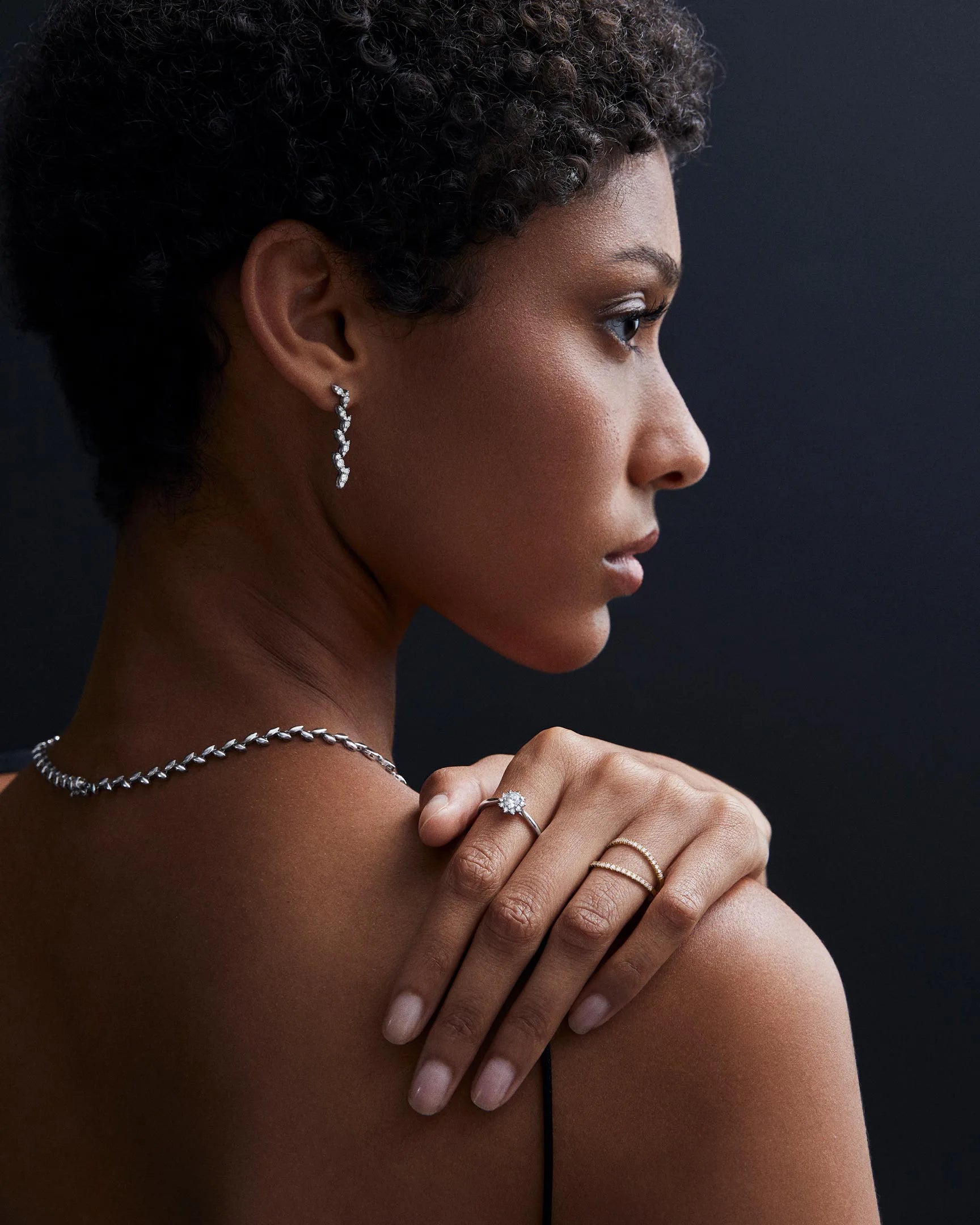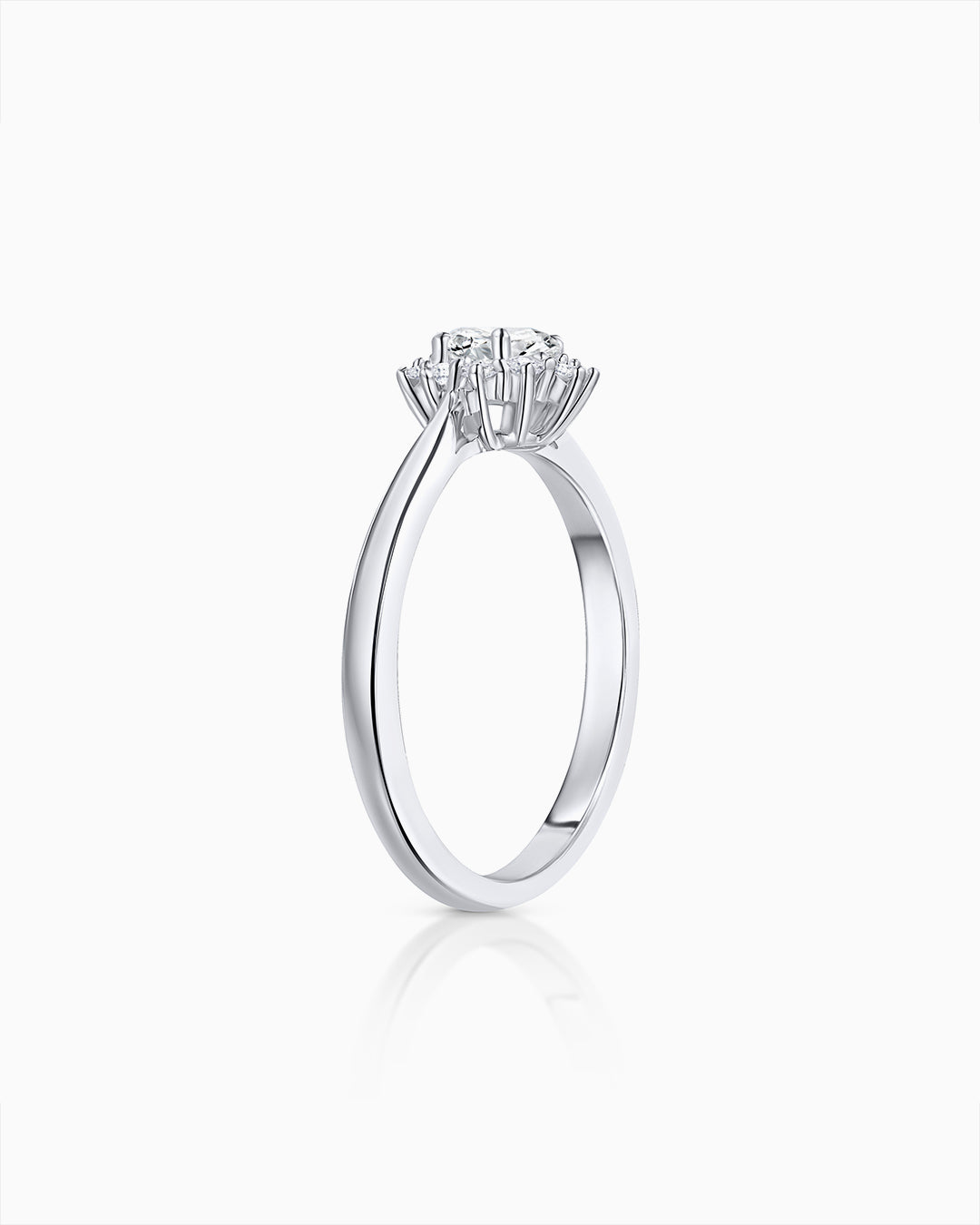 Anel Irem Diamonds com um diamante oval central e uma borda de diamantes em uma configuração de ouro branco 18 quilates. A coleção Irem é inspirada nas qualidades sensoriais de um jardim paradisíaco, simbolizando o encontro entre a natureza e o divino. Tesouros naturais e frutos da criatividade humana se refletem na delicadeza do design de cada peça, assim como na pureza das pedras preciosas que as adornam. O anel Irem Diamonds combina o caráter contemporâneo do ouro branco 18 kt com o brilho da impressionante estrela de diamante, totalizando 0,30 quilates. Além disso, a requintada borda de diamante que o envolve realça a beleza de seu corte oval, criando um fascinante jogo de luz e formas. O resultado é uma joia que inebriante os sentidos, transmitindo uma profunda conexão entre o tangível e o sublime. Uma escolha excepcional pensada para celebrar os momentos mais especiais.O anel de diamantes IremEstá disponível em duas versões adicionais de 0,68 e 1,18 quilates de diamantes, em três versões com uma esmeralda central e três com uma safira central.