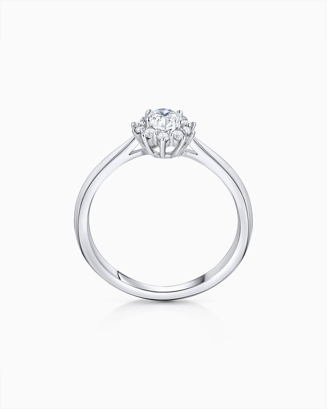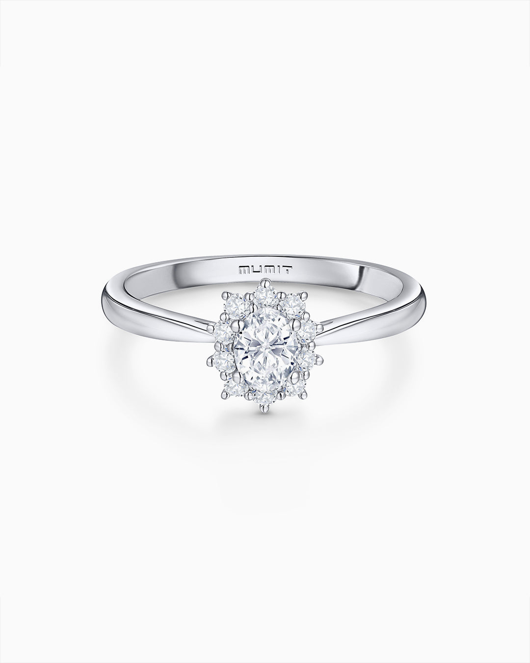Anel Irem Diamonds com um diamante oval central e uma borda de diamantes em uma configuração de o...