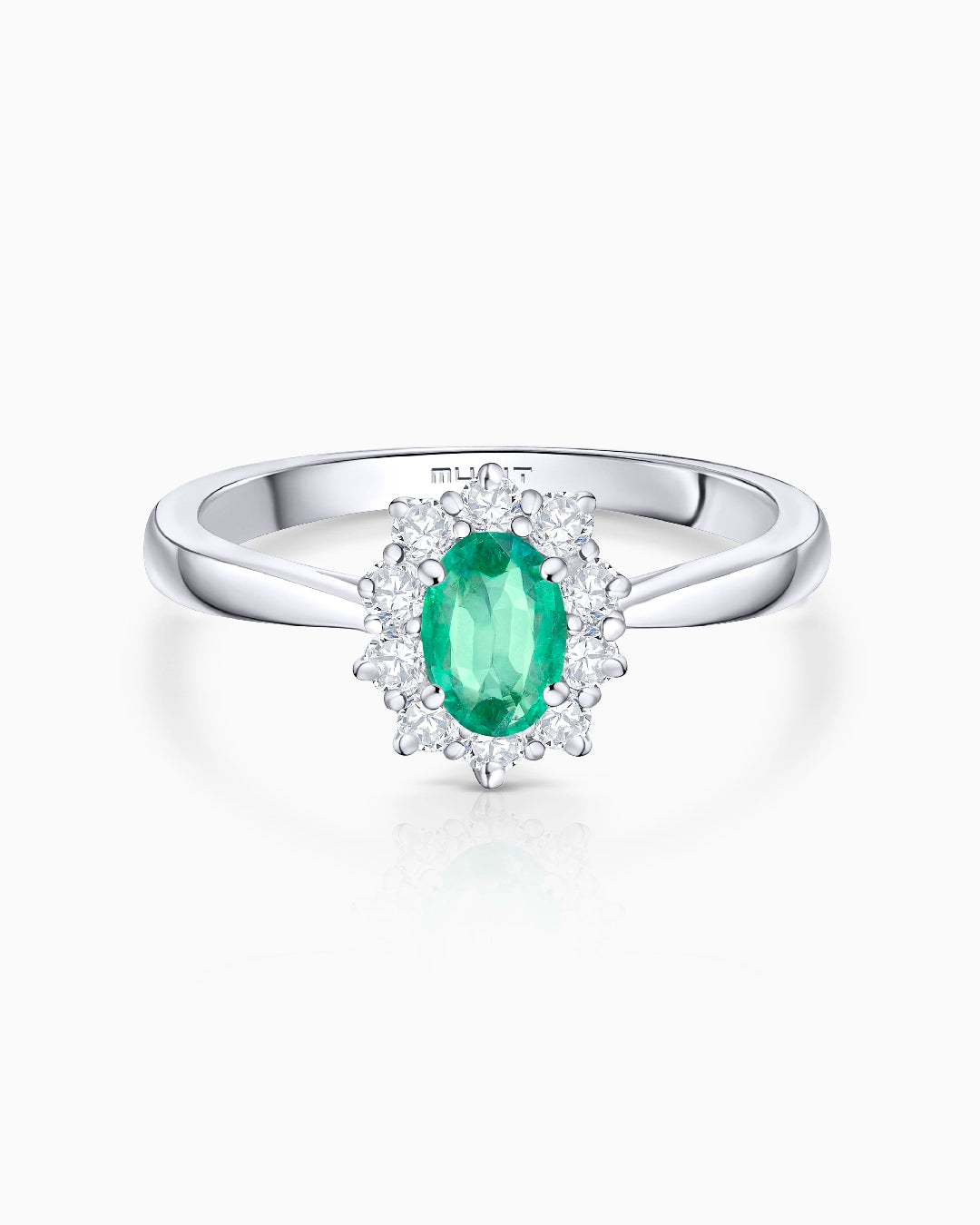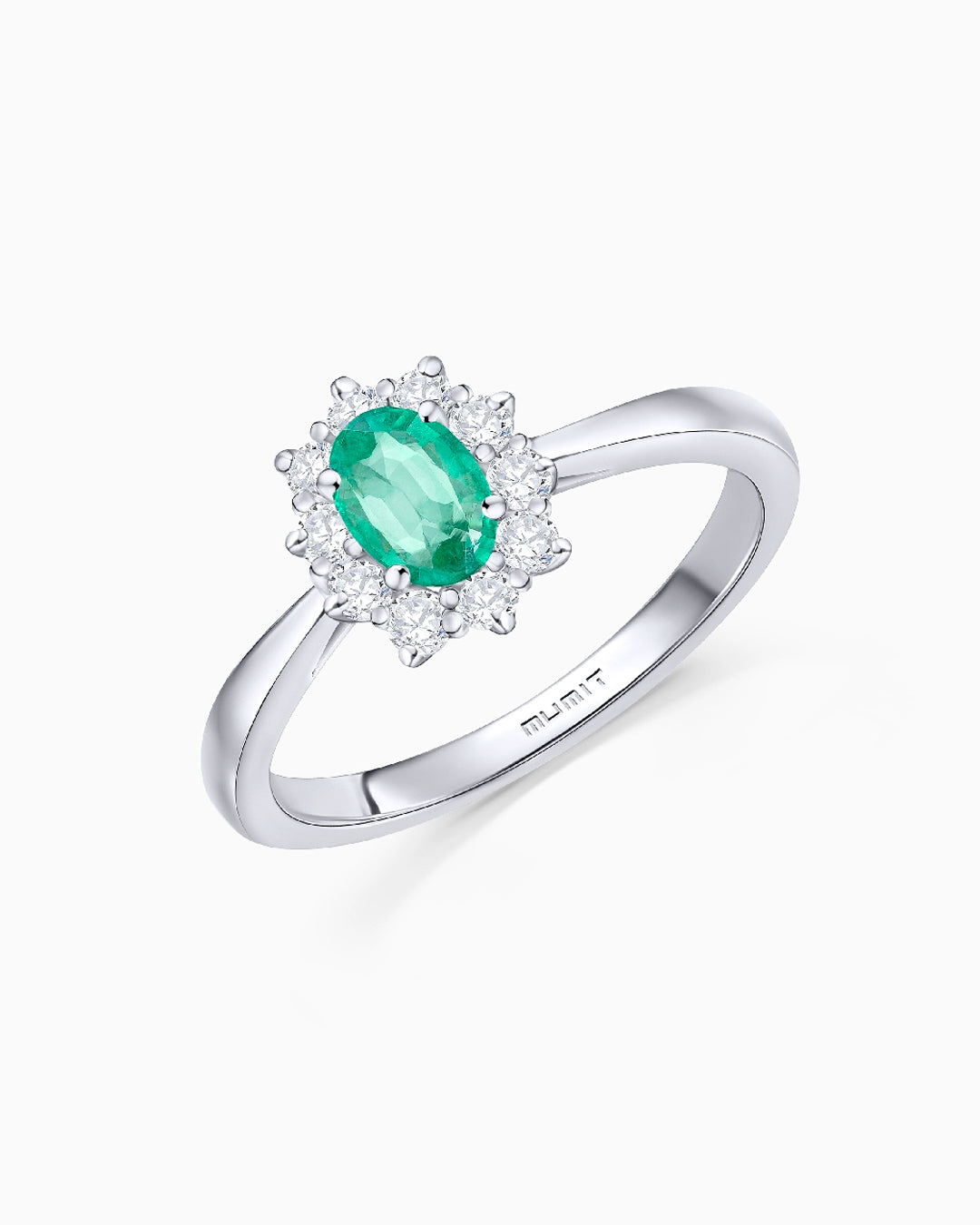 Anel Irem com uma esmeralda oval central e uma borda de diamantes em um engaste de ouro branco 18K. Irem, inspirado na essência de um jardim celestial. Tesouros naturais e frutos da criatividade humana são encontrados na pureza da composição da coleção Irem. Uma coleção através da qual o universo Mumit se torna uma paisagem cheia de cores e brilhos. O anel Irem representa um jardim de esmeraldas por meio de sua pedra central, uma magnífica esmeralda oval de 0,60 quilates que contrasta com a delicada borda de diamante. Cada um dos diamantes que dão forma a este design sublime foi cuidadosamente escolhido pelo seu brilho, cor e pureza, dando origem a uma peça de joalheria fina. Um anel de coquetel original, ideal tanto para o dia quanto para a noite. O anel de esmeralda Irem está disponível em duas versões adicionais com maior peso em quilates e em três versões com uma safira central de diferentes pesos em quilates.