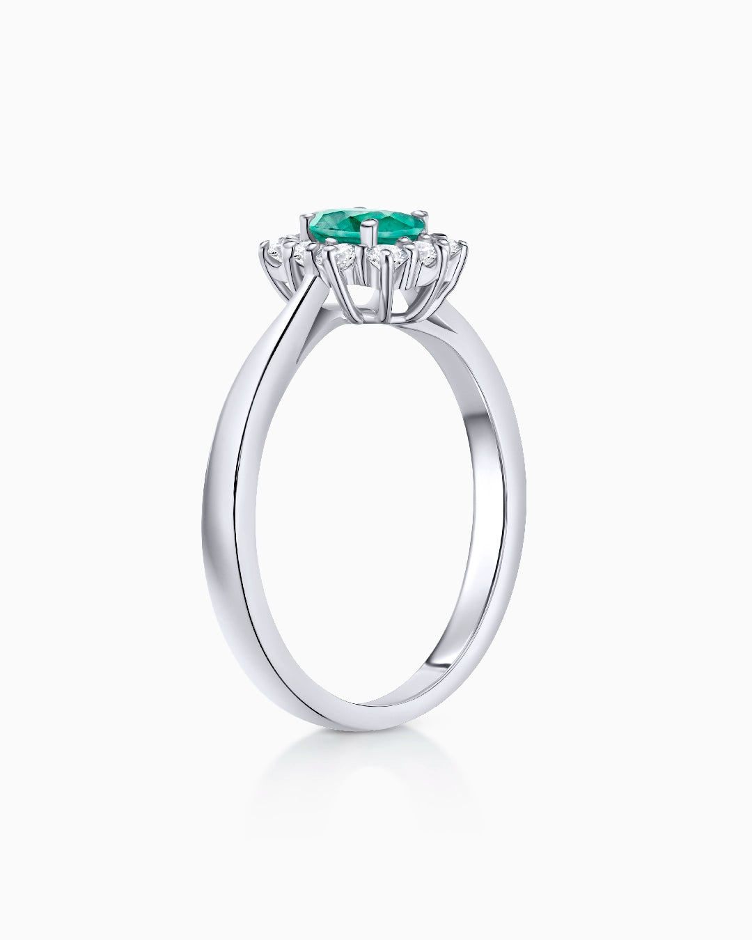 Anel Irem com uma esmeralda oval central e uma borda de diamantes em um engaste de ouro branco 18...