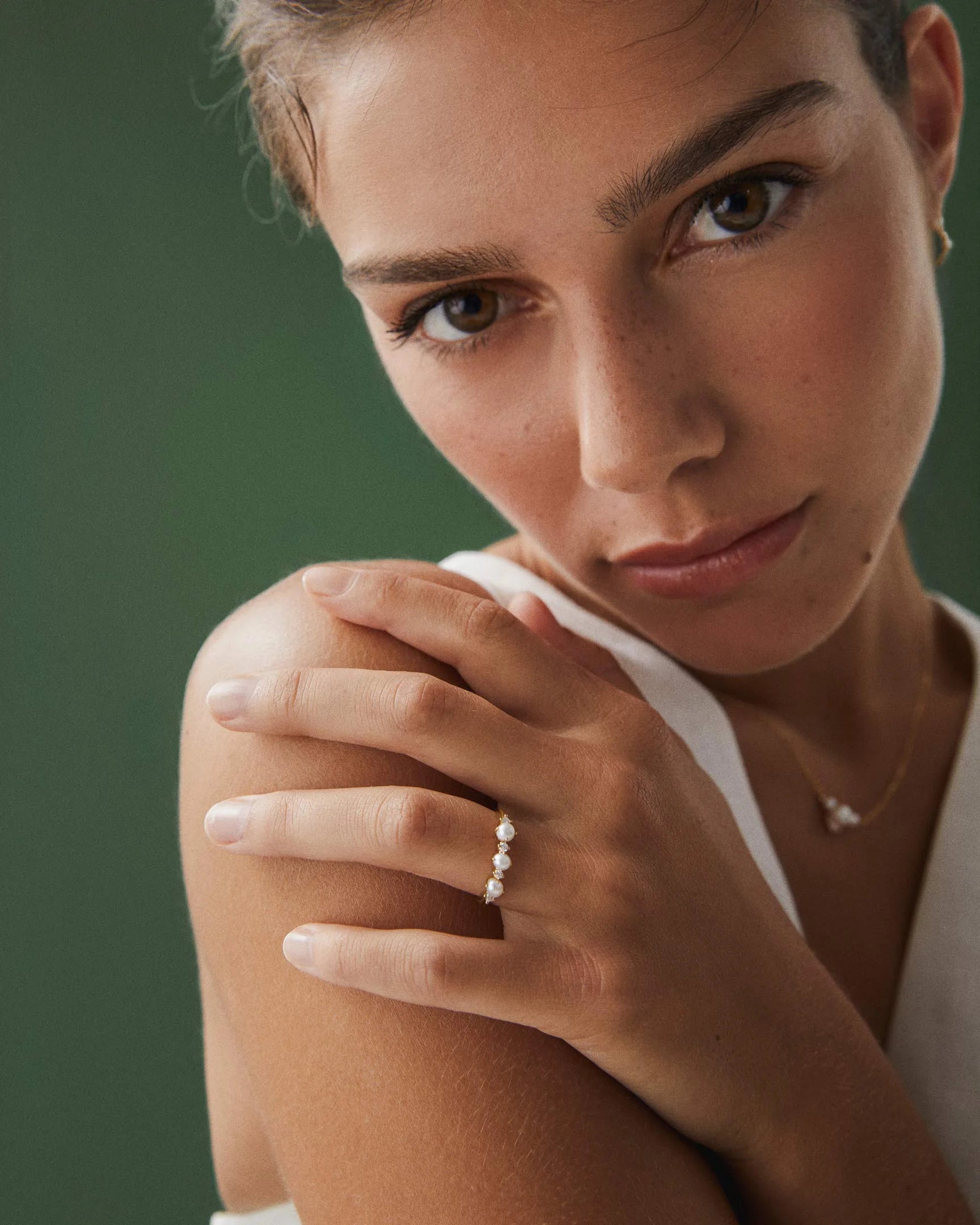 Anel Midnight Holly em formato de meia-trama feito em ouro amarelo 18 quilates com pérolas e diamantes. A coleção Holly recebeu o nome da personagem icônica interpretada por Audrey Hepburn em Bonequinha de Luxo. Charmosa e sofisticada, ela permaneceu gravada na memória coletiva por suas combinações deslumbrantes de pérolas com diamantes, refletidas no design das criações de Holly. Como um emblema dojet setNova-iorquina da época, as famosas festas do filme são um símbolo do estilo de vida cosmopolita e glamouroso da anfitriã. Da mesma forma, o anel de meia-trama Midnight Holly se distingue por suas linhas refinadas e uma seleção requintada de diamantes que realçam a beleza das pérolas, dando-lhe um espírito tão grandioso quanto o desses eventos fabulosos. Descubra a essência da distinção através do brilho iridescente de uma joia cult, perfeita para iluminar as noites mais elegantes.