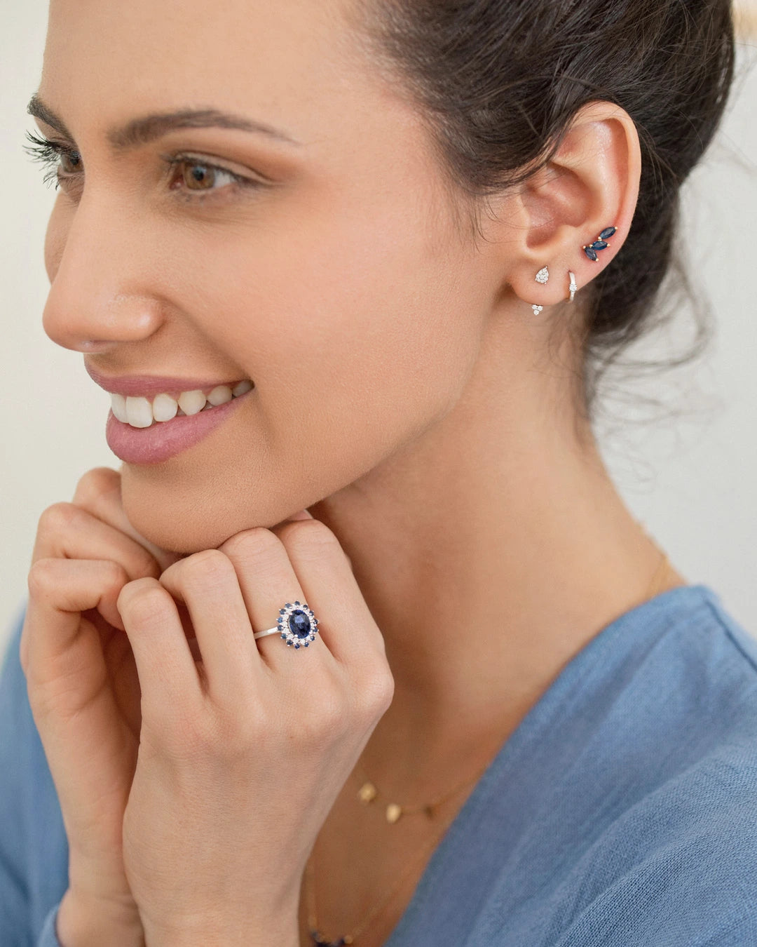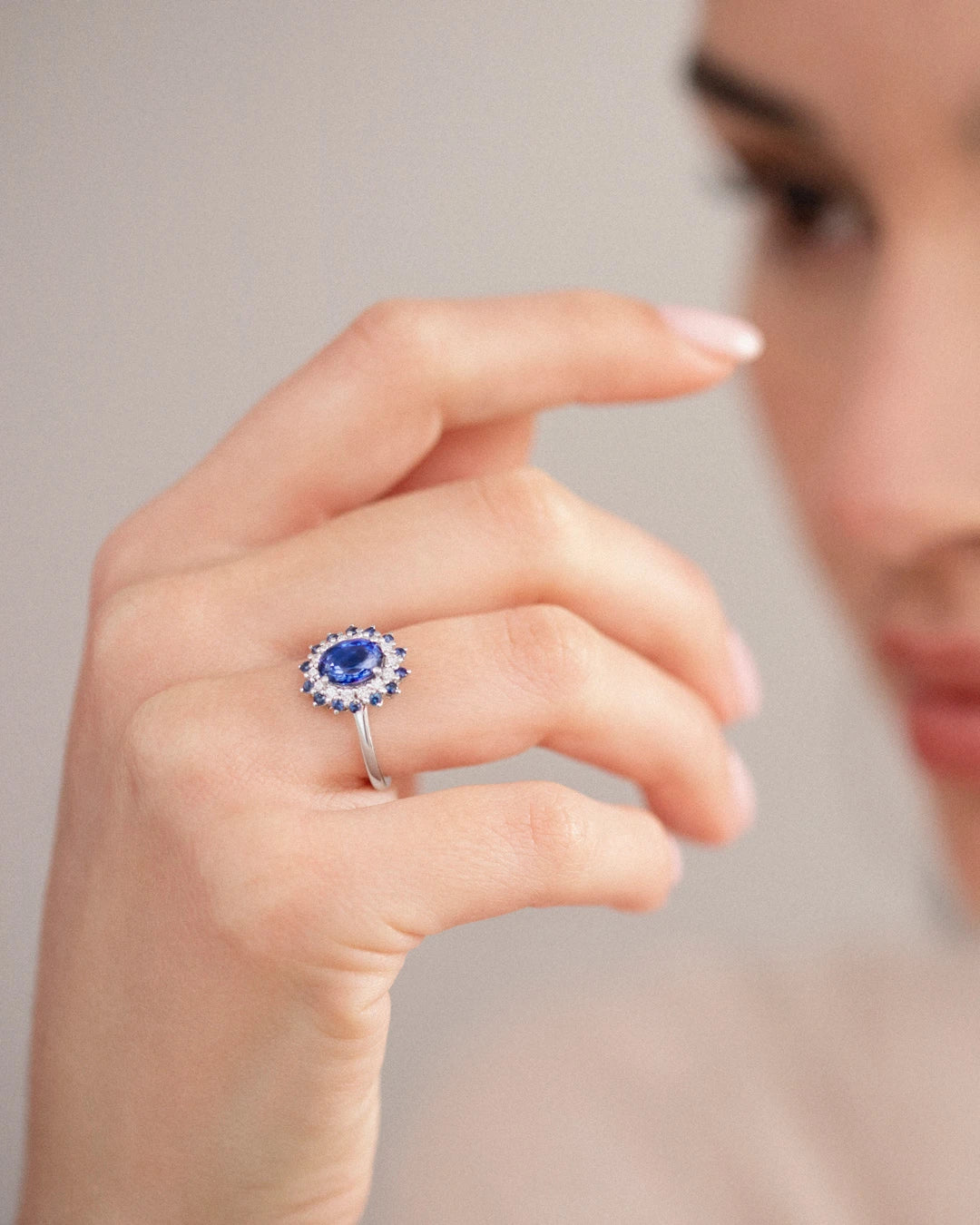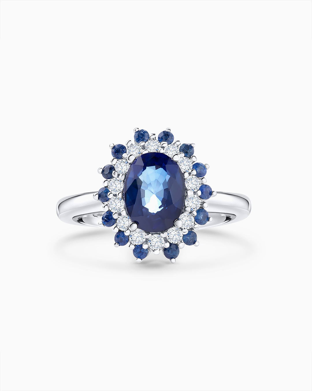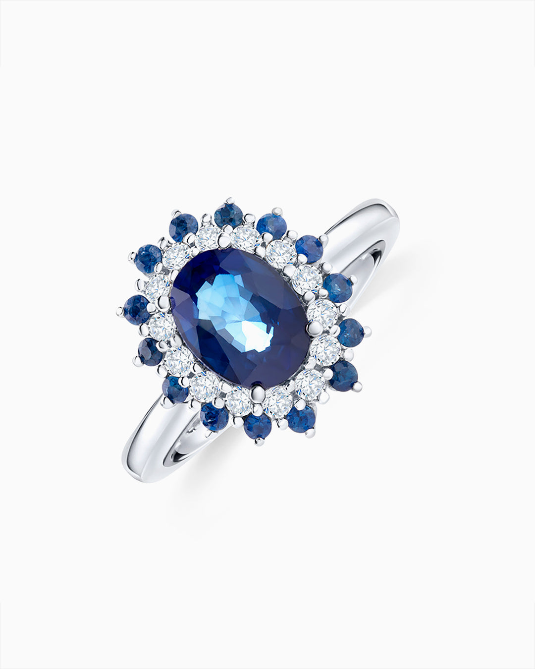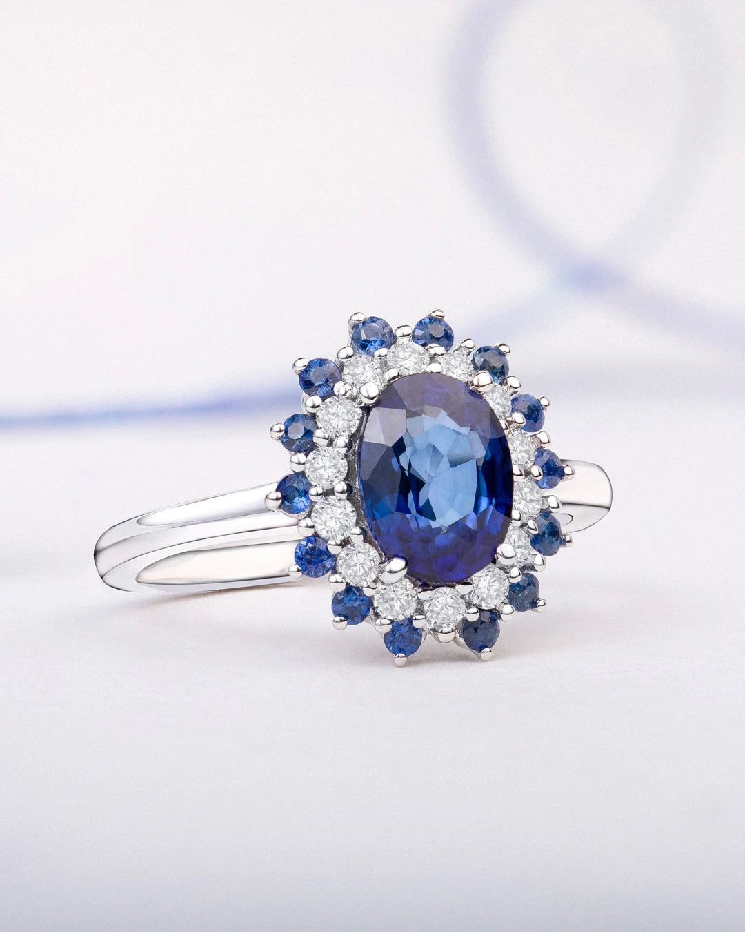 Anel Irina azul com safira central de corte oval e borda dupla de diamantes e safiras em um engas...