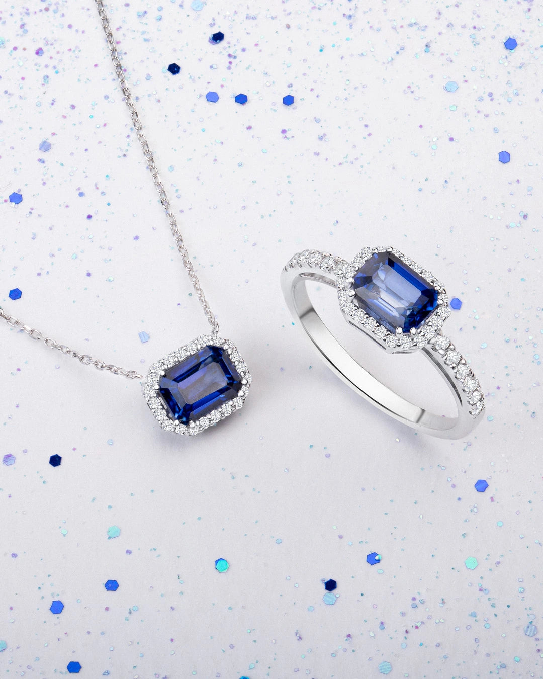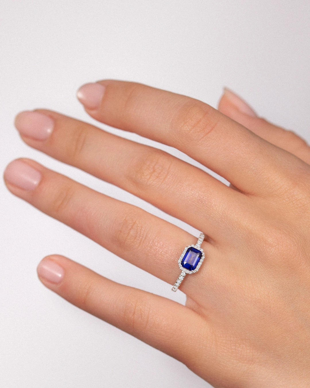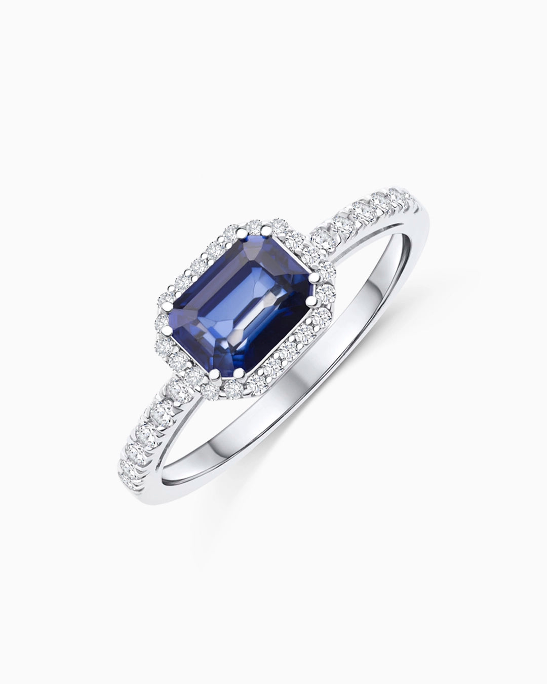 Anel Octo Diamonds com uma safira central especial com lapidação octogonal e diamantes em uma con...