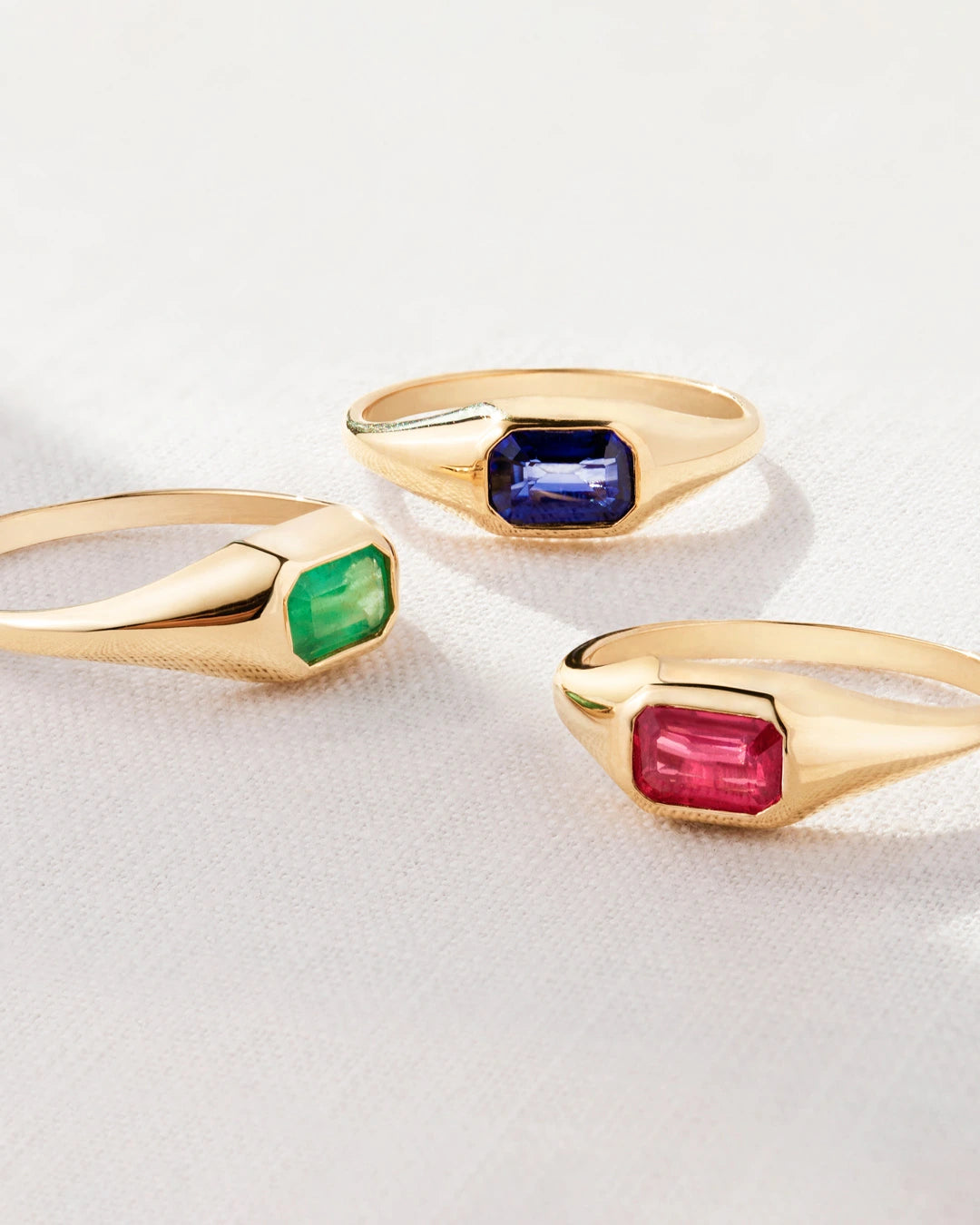 Anel de safira Seal Amar em ouro amarelo 18 K. A fusão de artesanato e modernidade dá origem a uma das joias mais esperadas. O anel de sinete Amar é uma joia única que representa o passado e o presente através do brilho da safira, do rubi ou da esmeralda. Suas linhas delicadas e refinadas culminam em uma safira central com lapidação esmeralda que transforma esta criação em uma joia que será a rainha do seu porta-joias. Na parte interna, possui uma treliça que protege a gema e confere um acabamento de joalheria de alta qualidade à peça. A coleção Amar se torna uma nova forma de declarar amor, por si, por ele, por ela... uma combinação perfeita de amor, modernidade e artesanato, ideal para brincar e completar seus looks mais especiais. Os anéis de sinete Amar estão disponíveis em ouro amarelo 18 quilates e em duas versões, com a gema em lapidação esmeralda ou oval e com rubi, esmeralda ou safira.