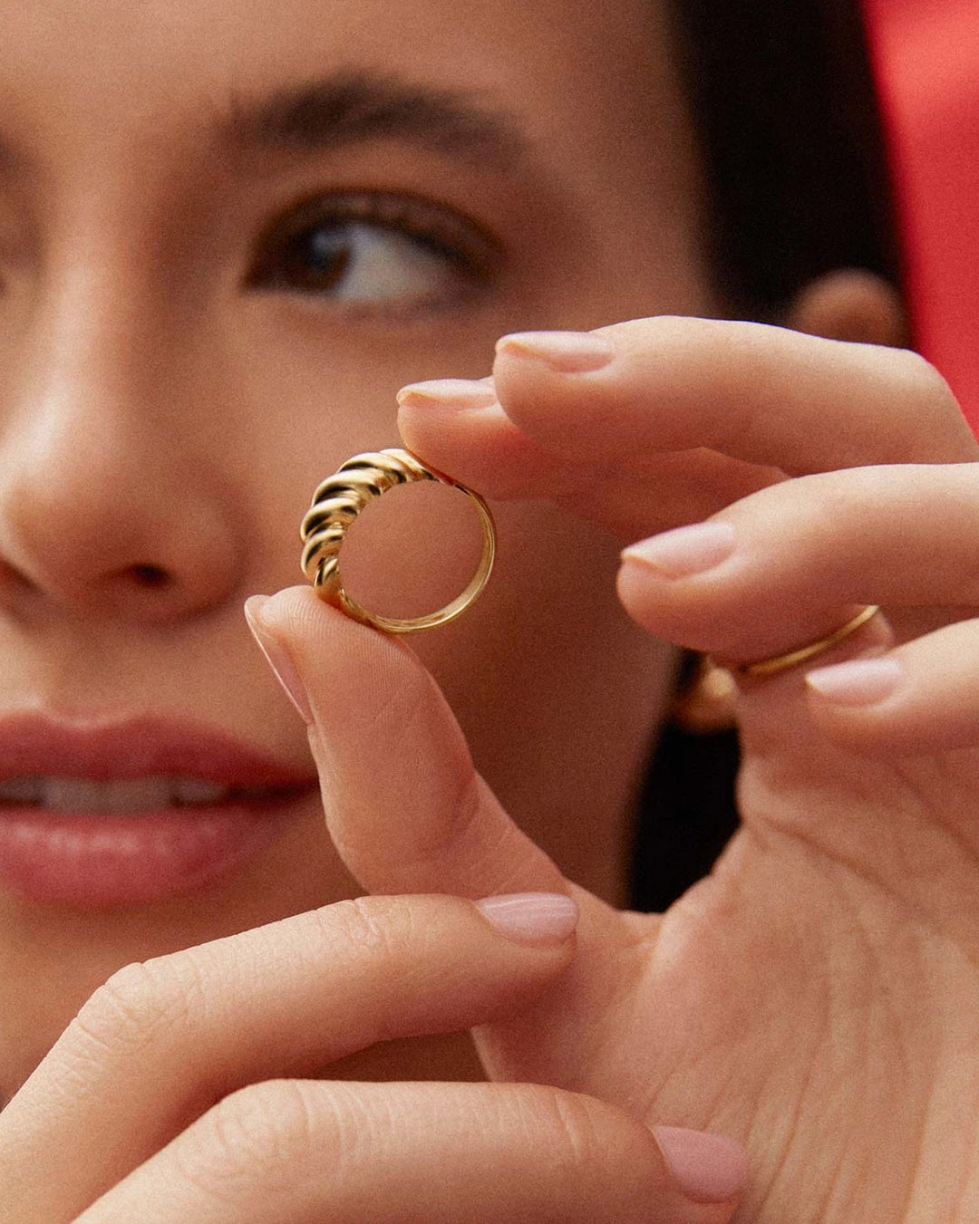 Anel Duomo Twist L feito em ouro amarelo 18 quilates. A coleção Duomo é inspirada na cúpula nervurada, um elemento arquitetônico imponente e de grande valor simbólico. Nossos designers queriam capturar a sensação de admiração que essas maravilhas estruturais provocam, bem como a profundidade de seu impacto cultural. Para isso, eles optaram pelo uso de linhas geométricas e uma silhueta retorcida, que refletem perfeitamente a sinergia entre arte, história e design. Como resultado, o anel Duomo Twist L representa impecavelmente o caráter inovador da Mumit e as proporções harmoniosas que distinguem nossas criações. Graças à sua personalidade marcante e versátil, ela oferece a possibilidade de elevar todos os seus looks. Combine-o com as diferentes versões de superfície lisa da mesma coleção para gerar um contraste de textura único e obter umolharuma tendência que se adapta a qualquer ocasião.