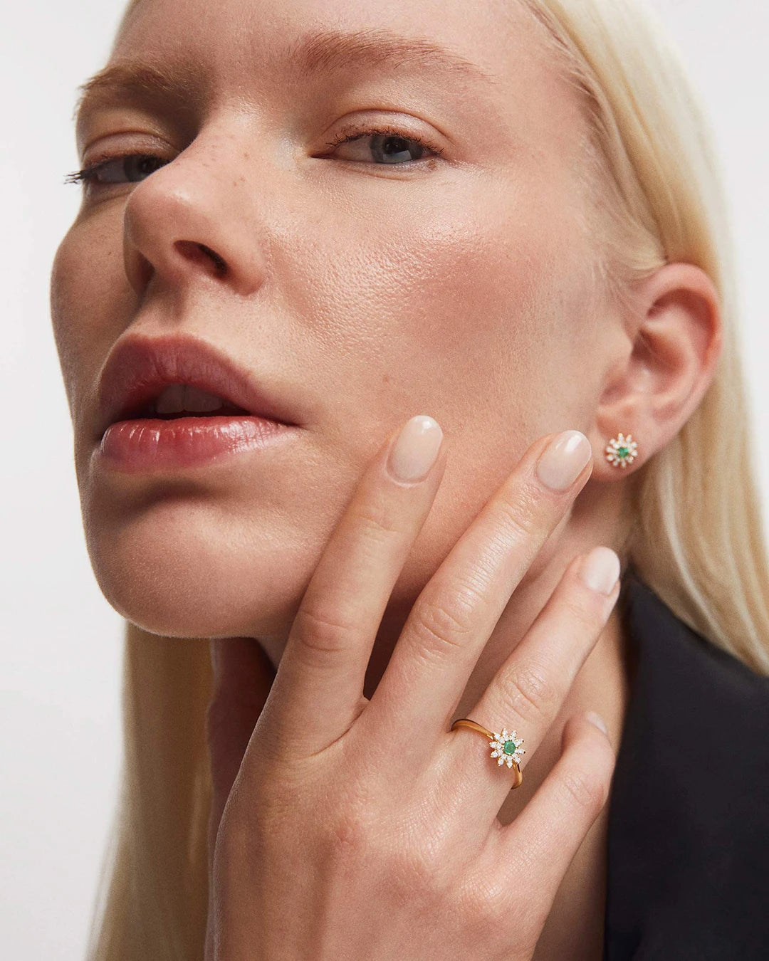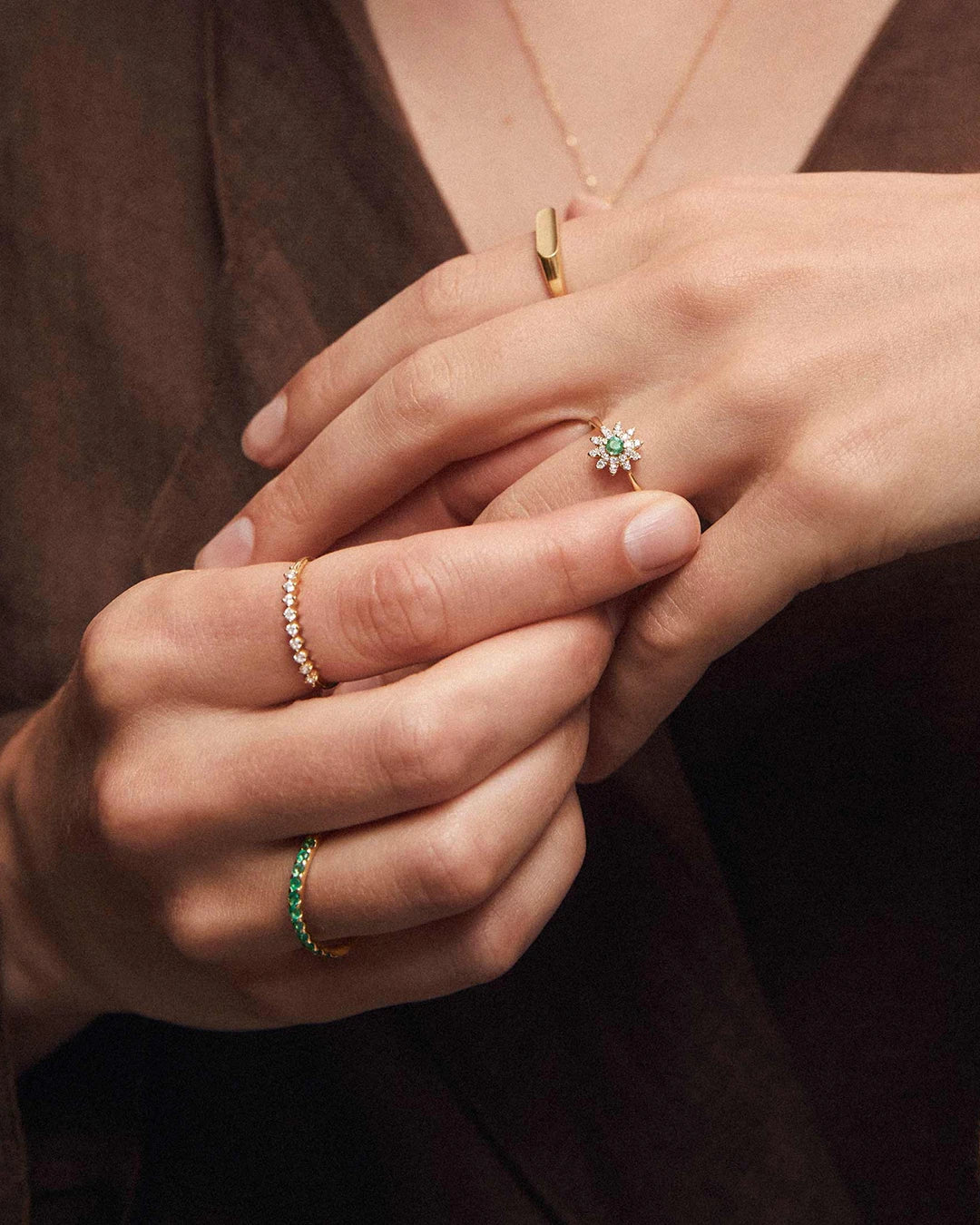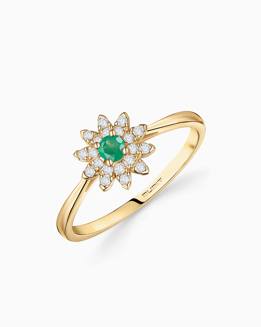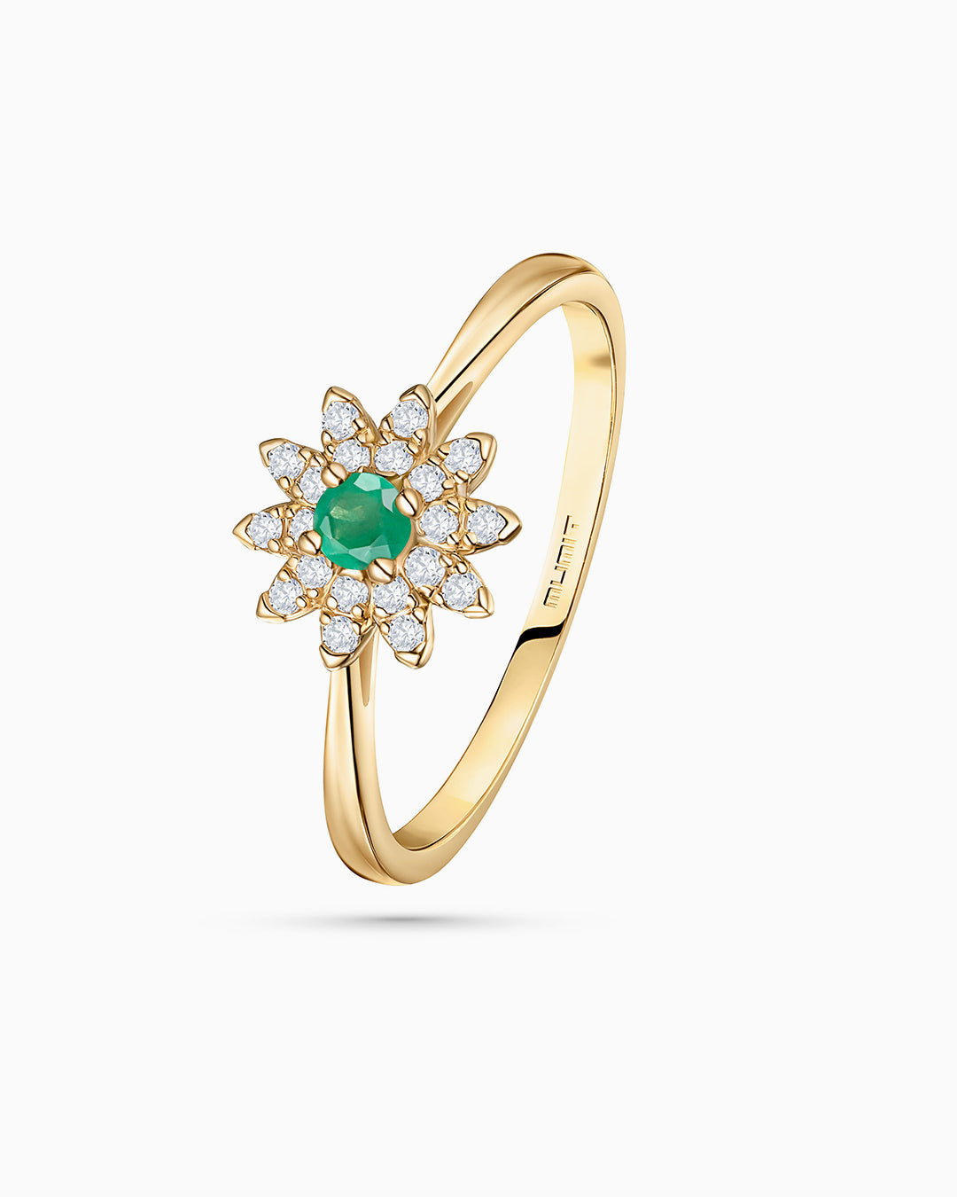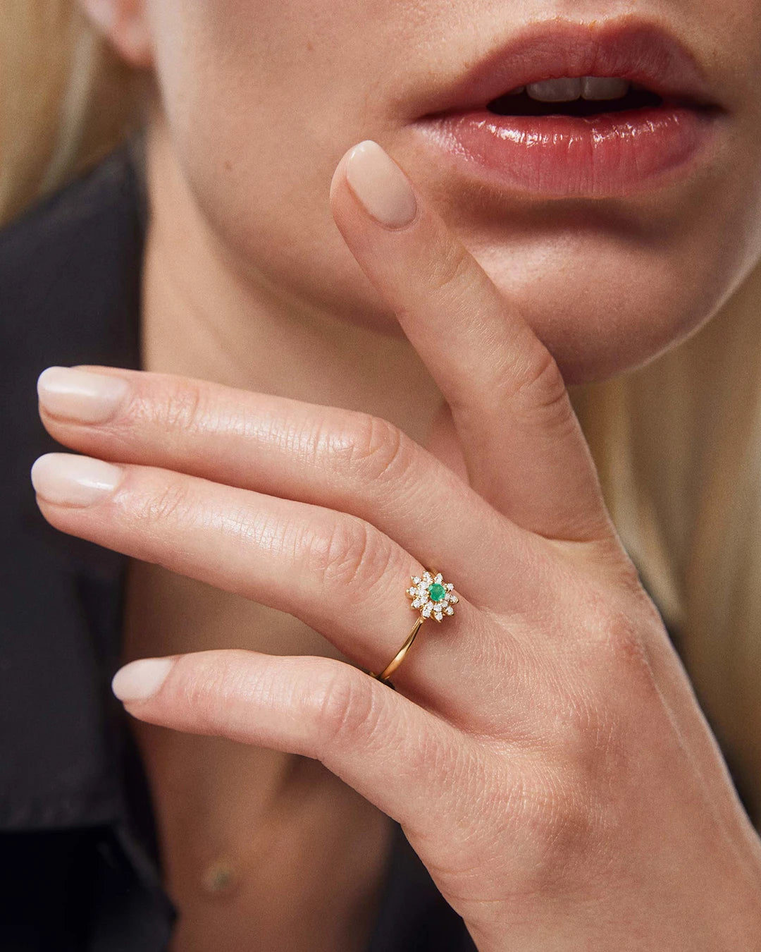 Anel de esmeralda e diamante de Florença feito em ouro amarelo 18 quilates. Florença recebeu esse nome em homenagem à famosa cidade italiana, famosa por sua tradição de ourivesaria que remonta aos tempos medievais. Esta coleção é inspirada nas joias que podem ser vistas em alguns dos retratos mais famosos da Galeria Uffizi, em Florença. Nelas, as damas renascentistas da cidade aparecem adornadas com desenhos florais e as mais finas pedras preciosas da época. Nossos designers queriam refletir a beleza e a tradição dessas joias emblemáticas de Florença por meio de um anel em formato de margarida. Você reconhecerá o toque fresco e original de Mumit na inversão das cores tradicionalmente associadas a essas delicadas flores: o amarelo do ouro é encontrado no caule, o branco dos diamantes é mantido nas pétalas, enquanto o verde vibrante da esmeralda se torna o centro. Descubra a magia da Toscana em flor e eleve qualquer look com uma joia que exala história e requinte.