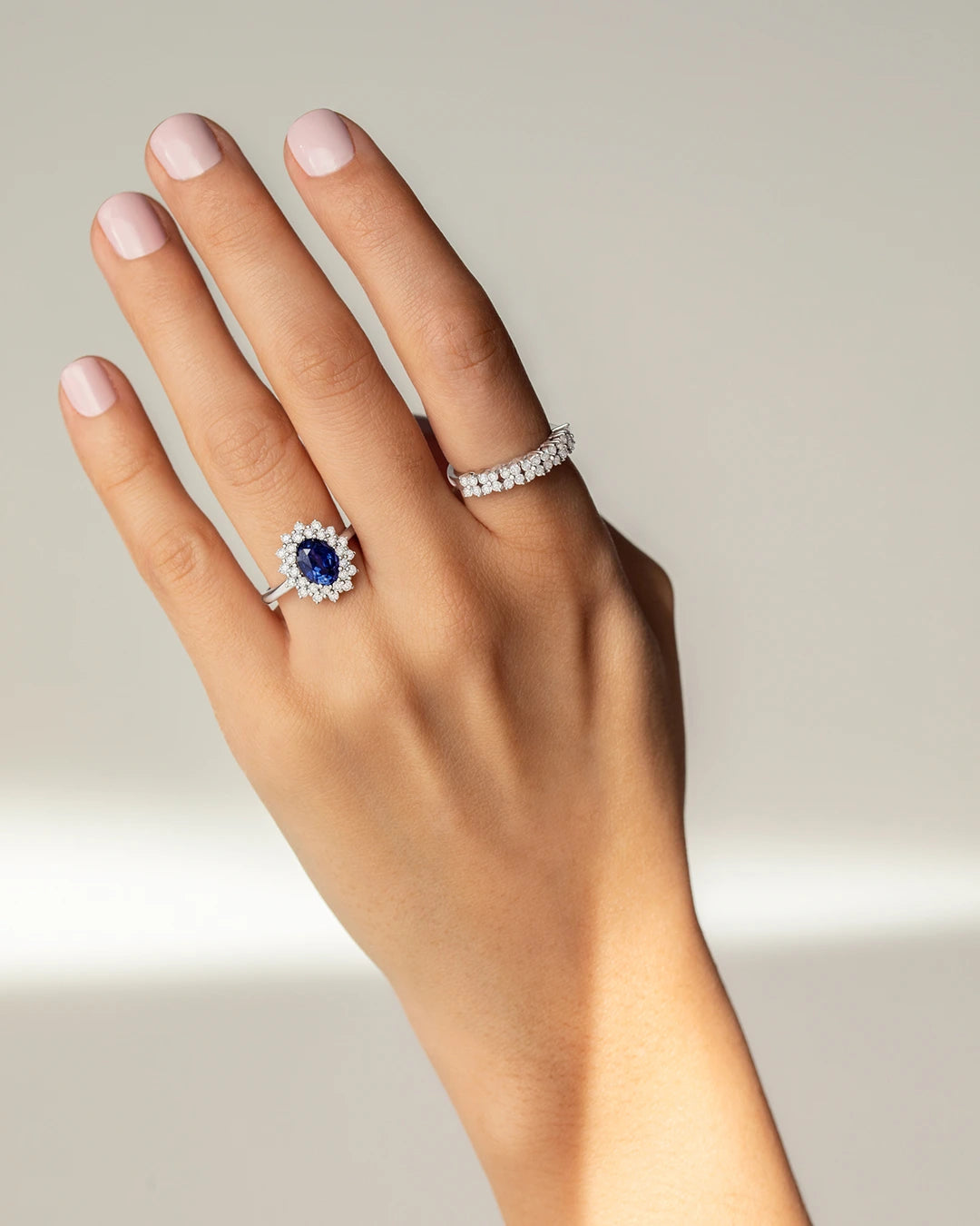 Anel Irina com safira central de lapidação oval e borda dupla de diamantes em engaste de ouro branco 18K. Os anéis Irina e Irina Blue são duas obras de arte em sua forma mais pura, dois anéis originais que são peças de joalheria com aquele toque de transgressão que caracteriza todos os designs Mumit. Sua pedra central, uma vibrante safira azul de lapidação oval, equilibra uma borda dupla de diamantes brilhantes, tornando esta joia uma verdadeira obra-prima. Cada um dos diamantes que dão forma a este design sublime foi cuidadosamente escolhido pelo seu brilho, cor e pureza, criando uma joia que é toda luz. Um anel de coquetel original, ideal para o dia ou para a noite. O anel Irina está disponível em duas versões, com borda dupla de diamantes e com borda dupla de diamantes e safiras.