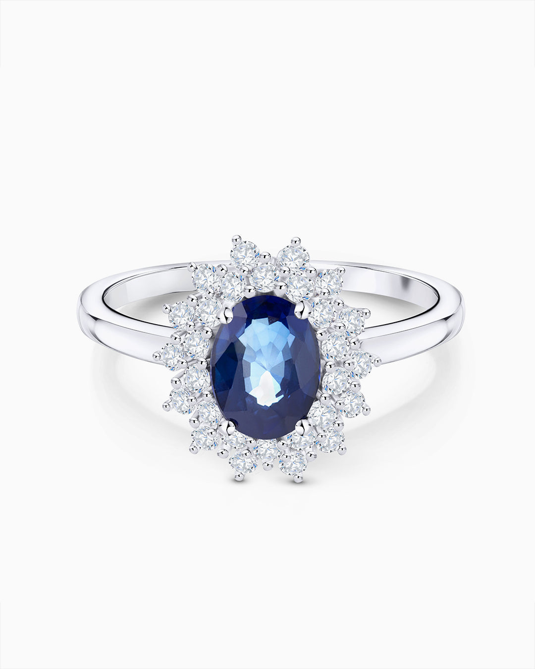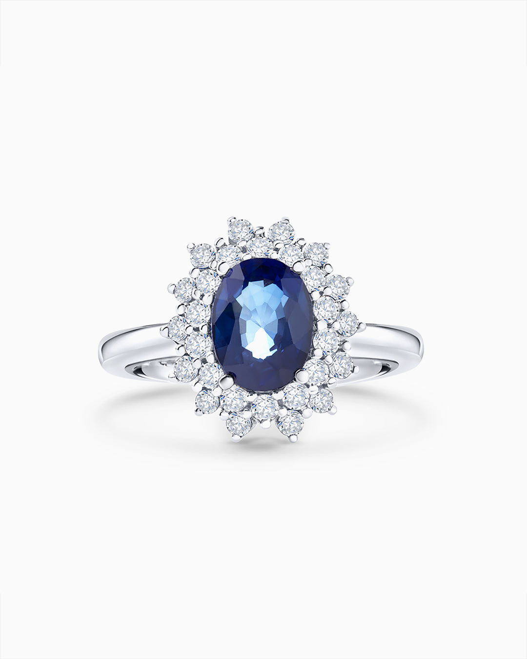 Anel Irina com safira central de lapidação oval e borda dupla de diamantes em engaste de ouro bra...