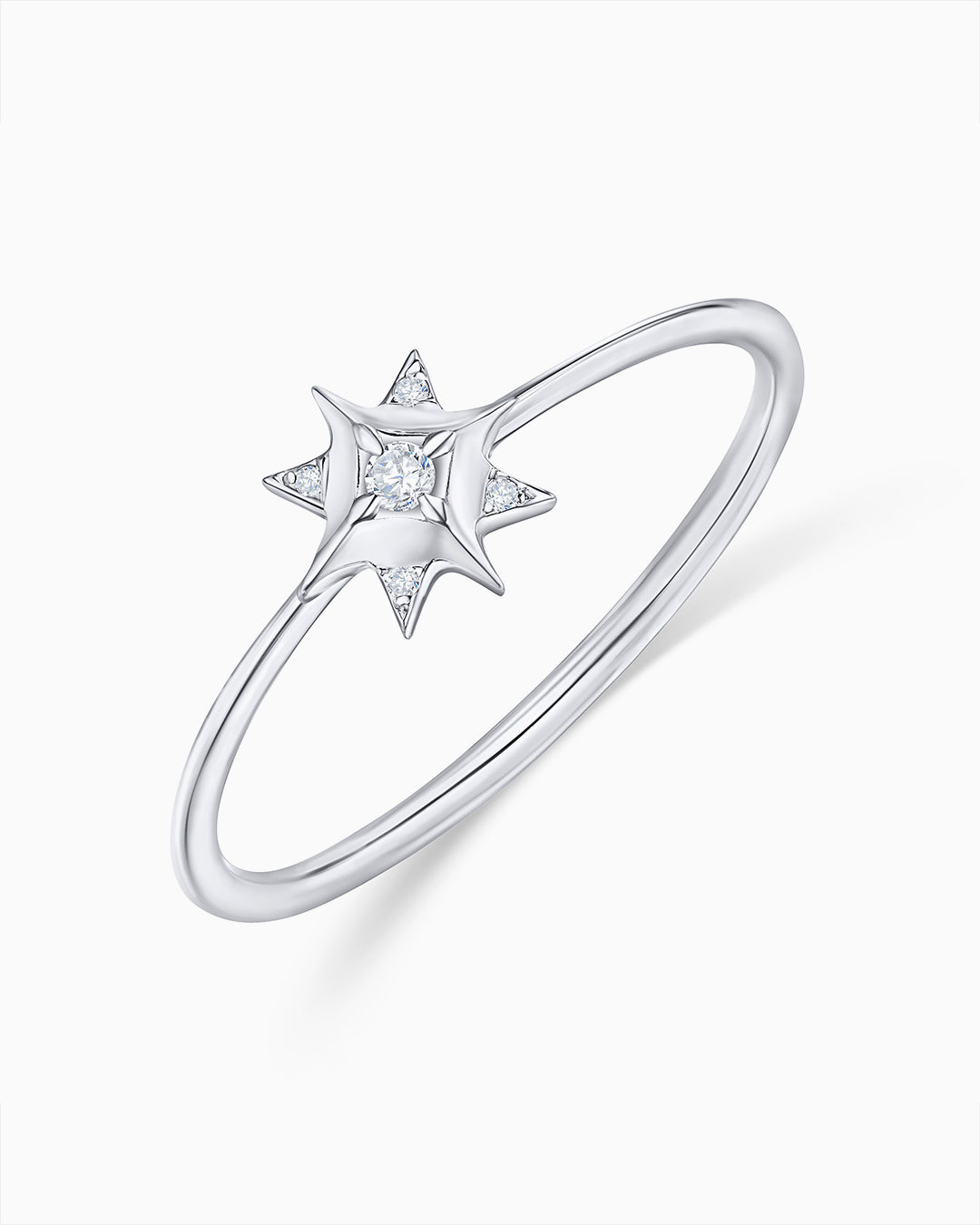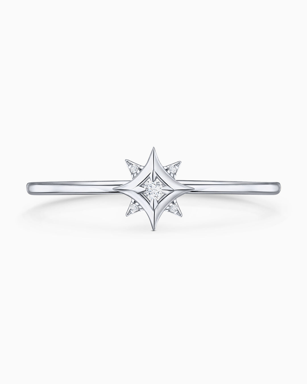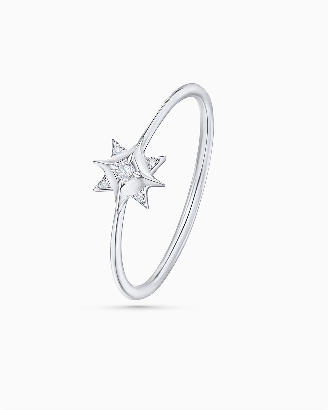 Anel de diamante Mimosa Compass Rose feito em ouro branco 18 quilates. Mimosa, uma coleção inspirada nas estrelas, seu brilho eterno que ilumina as noites mais escuras. Seu motivo, uma estrela que evoca a flor-de-lis e os quatro pontos cardeais característicos da Rosa dos Ventos, é representado por um diamante que culmina em um diamante central que representa a pessoa que o usa. Este delicado anel simboliza o início de uma jornada, tornando-se aquele guia necessário para sempre encontrar o caminho de volta. Para cada dia e para sempre, uma joia única. O anel Mimosa Compass Rose está disponível em três versões: ouro rosa 18kt, amarelo e branco.