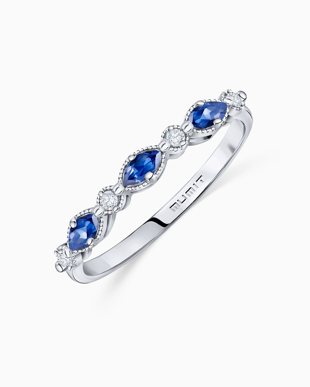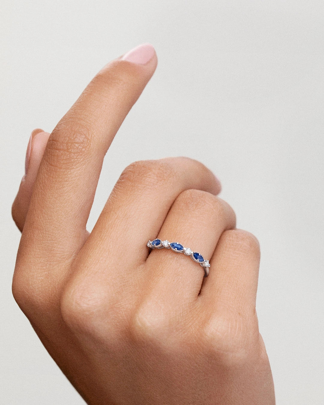 Anel Ondine com safiras e diamantes em ouro branco 18 quilates. A coleção Ondine tem uma personalidade distintavintageo que se reflete em detalhes como o granulado discreto e elegante que percorre a silhueta das peças que o compõem. Majestosamente nostálgico, o anel Ondine apresenta uma seleção requintada de safiras lapidadasmarquesa, iluminados pelo brilho dos diamantes que os ladeiam e emoldurados pela granulação do monte. Deixe-se seduzir pelo espírito enigmático e sofisticado do anel Ondine e combine-o com as outras peças da coleção para dar um toque retrô a qualquer look.