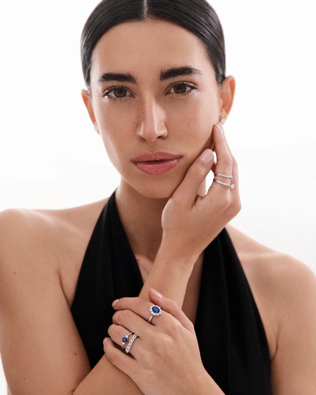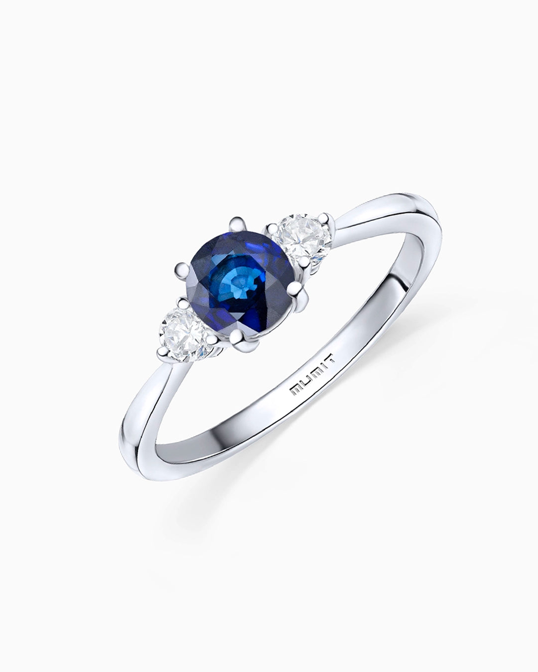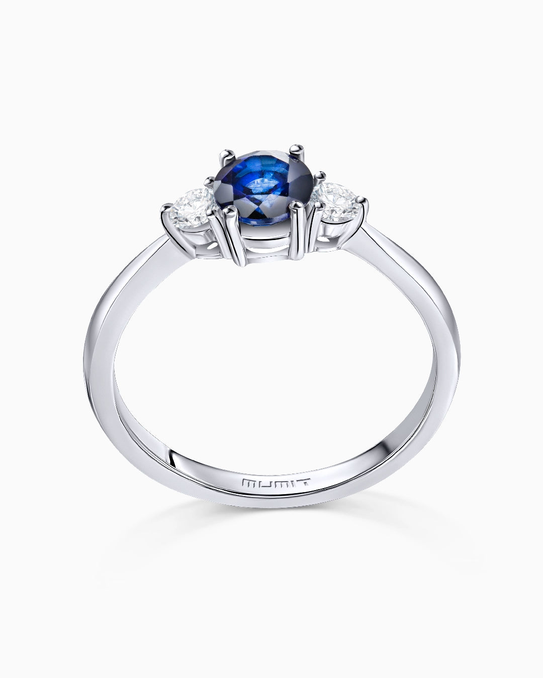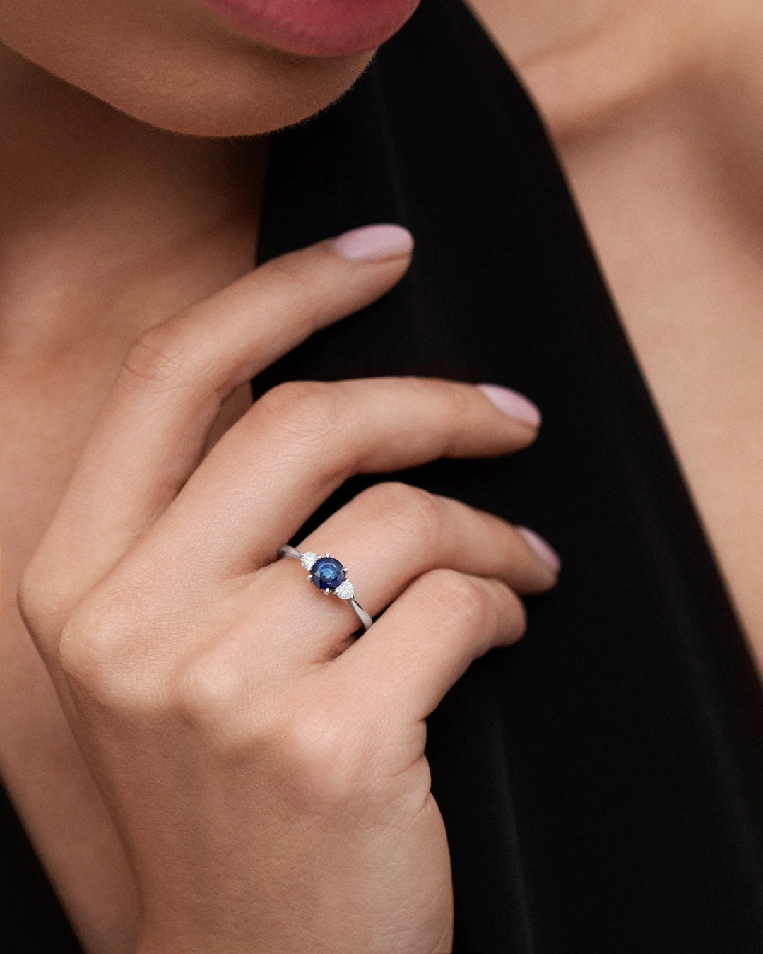 Anel de safira e diamante Tressa em ouro branco 18 quilates. Elegante e harmonioso, Tressa apresenta uma estrutura imensamente simbólica graças ao trio de safiras e diamantes que distingue o design, representando o passado, o presente e o futuro. A safira central de 0,50 quilates é a protagonista, simbolizando o momento atual e sua importância com uma cor que transmite a paz e a tranquilidade do infinito. Diamantes adjacentes amplificam seu brilho de todos os ângulos, contando a história deslumbrante de uma promessa única. Uma declaração de amor que refletirá todas as memórias e sonhos mais mágicos através de seu brilho eterno.
