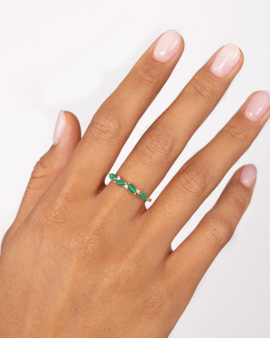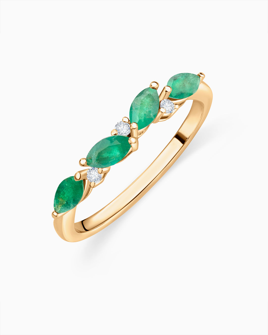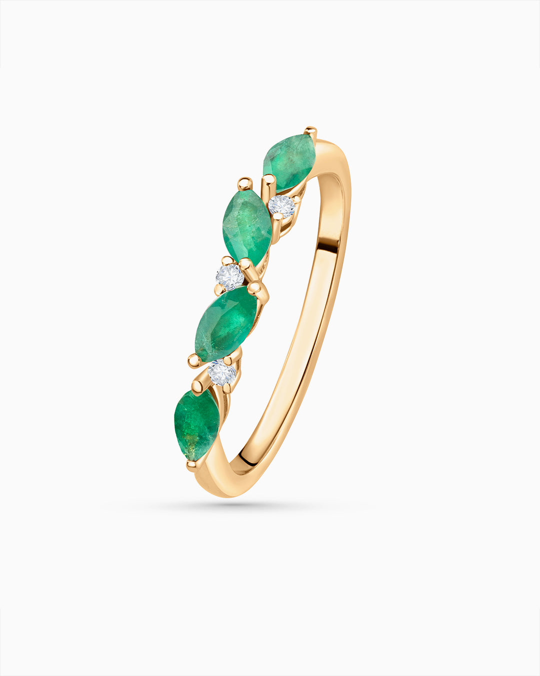 Anel Tri-Marquise de diamante e esmeralda em ouro amarelo 18K