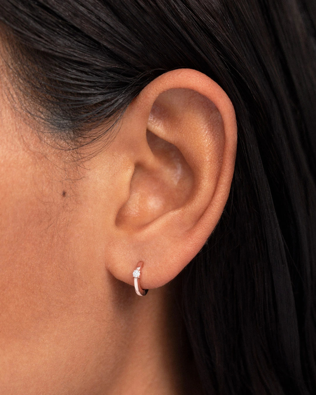 Brinco de argola Crax Piercing com diamantes em ouro rosa 18K. Um brilho ousado em formato de brinco que fará você se apaixonar à primeira vista. O brinco de piercing Crax eleva o design do brinco de argola tradicional, adicionando um toque extra de sofisticação por meio de seu diamante brilhante. Um design delicado e elegante que não pode faltar na sua orelha. Possui fecho tipo congo que facilita a colocação e o ajuste em qualquer piercing, tanto na cartilagem quanto no lóbulo. Cada piercing Mumit é uma criação única, deixe seu lado mais criativo fluir e descubra a magia dos piercings.O brinco Piercing Crax está disponível em três versões: ouro amarelo, rosa e branco de 18 quilates.