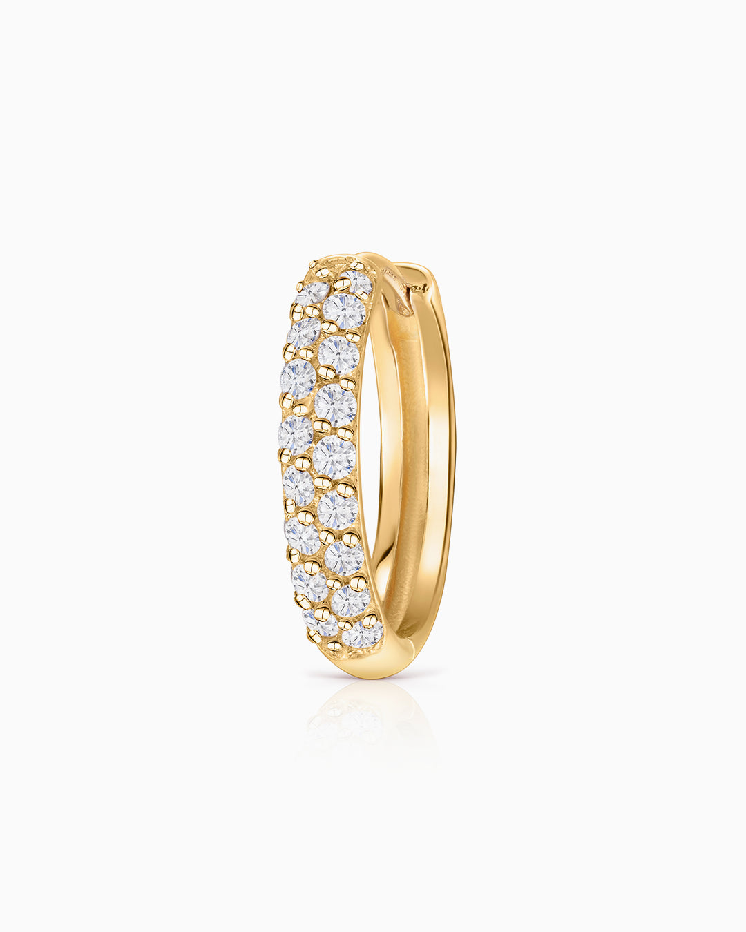 Brinco piercing com fatia de diamante em ouro amarelo 18K. Slice é um brinco de argola em estilo crioulo que não vai deixar você indiferente. A elegância de suas duas fileiras de diamantes cravejados em pavé, engastados em uma argola de ouro amarelo 18 quilates com 3 mm de espessura, faz deste brinco um item essencial e elegante em qualquer porta-joias. Ideal para combinar com outros brincos de argola, criando um jogo de formas na orelha, ou para usar sozinho com um penteado preso. Possui fecho tipo congo que facilita o ajuste e o fechamento. O brinco de argola Slice está disponível em três versões: ouro rosa 18K, ouro branco e ouro amarelo.