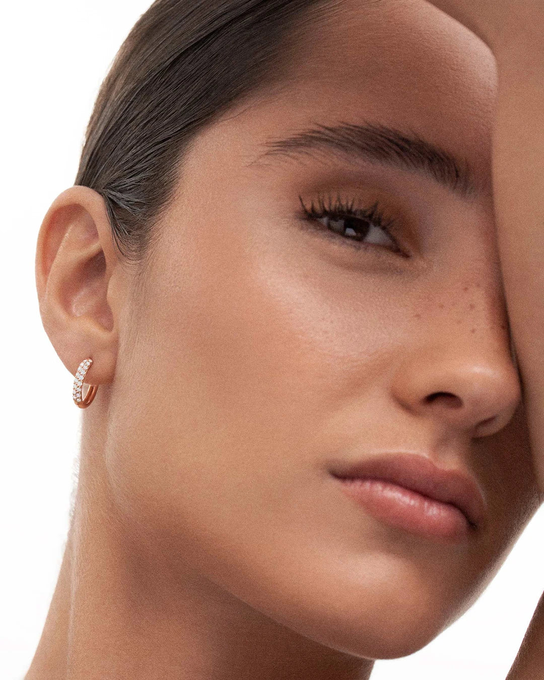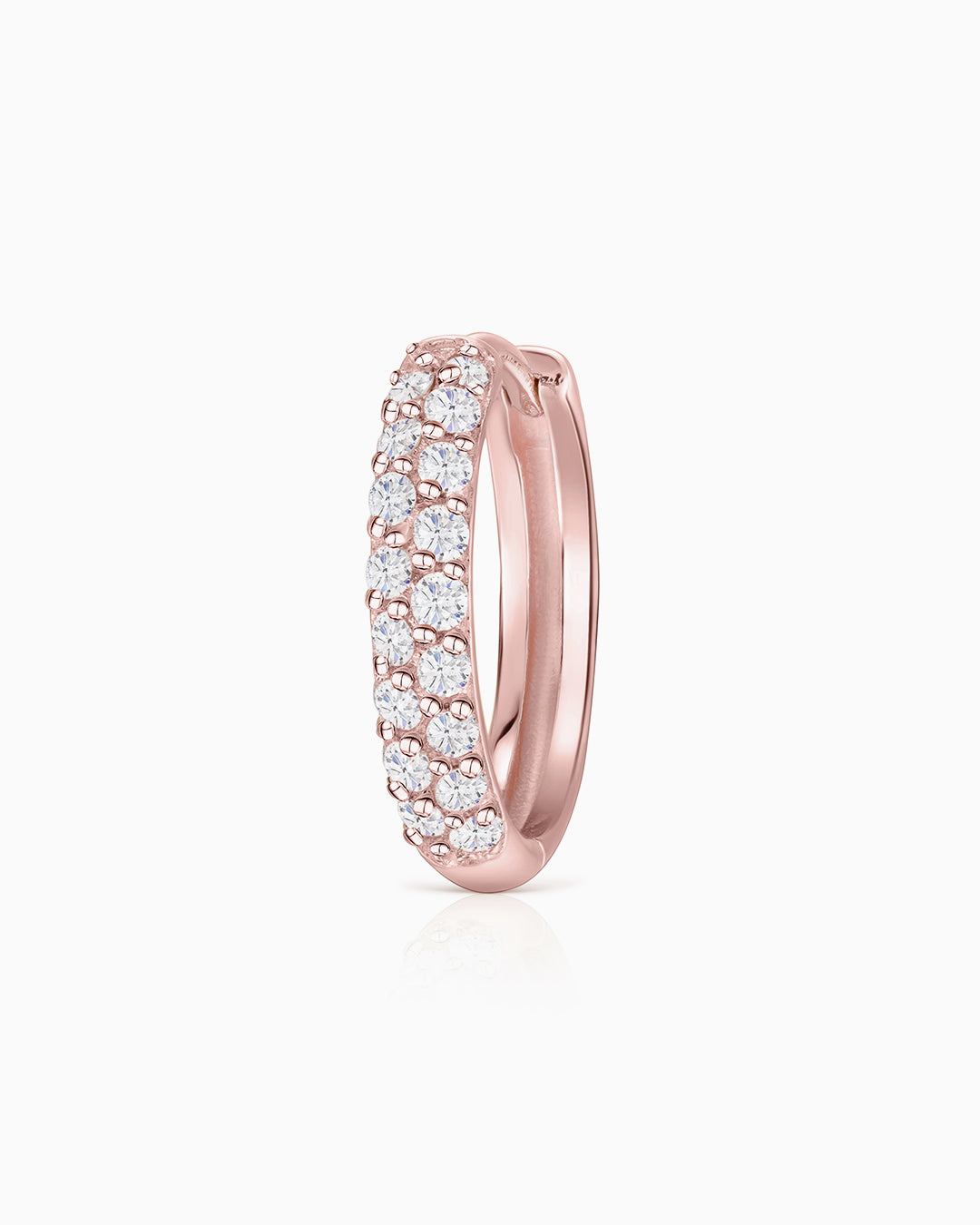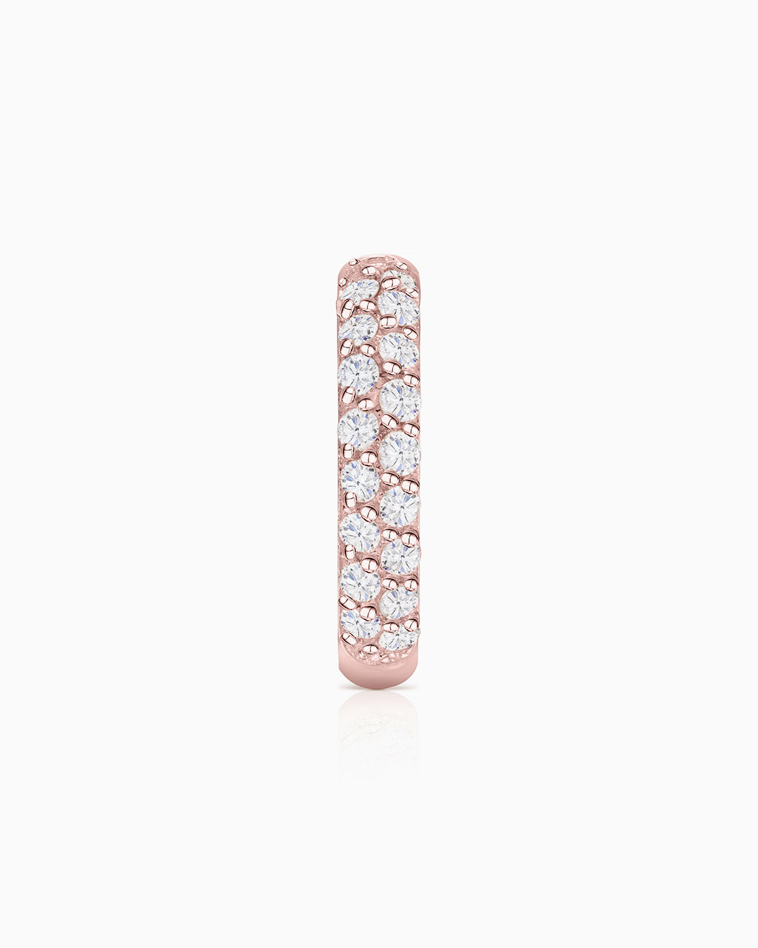 Brinco piercing com fatia de diamante em ouro rosa 18K. Slice é um brinco de argola em estilo crioulo que não vai deixar você indiferente. A elegância de suas duas fileiras de diamantes cravejados em pavé, engastados em uma argola de ouro rosa 18 quilates de 3 mm de espessura, faz deste brinco um item essencial elegante em qualquer porta-joias. Ideal para combinar com outros brincos de argola, criando um jogo de formas na orelha, ou para usar sozinho com um penteado preso. Possui fecho tipo congo que facilita o ajuste e o fechamento.O brinco de argola Slice está disponível em três versões: ouro rosa 18K, ouro branco e ouro amarelo.