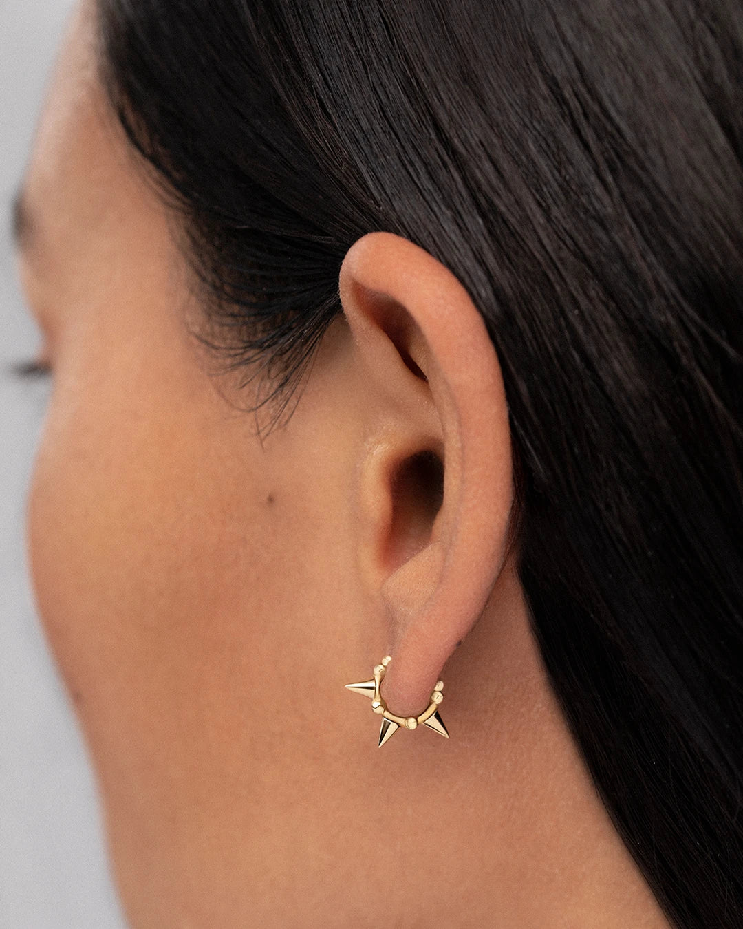 Brinco de argola Rox feito em ouro amarelo 18 quilates. Um design refinado com um sutil toque "punk" totalmente diferente. Este é um brinco tipo piercing projetado para se ajustar a qualquer ângulo, graças à largura de sua ponta e seu inovador fecho tipo clicker, este brinco pode ser usado em hélice, septo, tragus, torre, snug e anti-hélice. Feito em ouro amarelo 18 quilates, ele se caracteriza por seu design original com três pontas intercaladas com pequenas bolas marcantes, um toque extra de modernidade que vai te cativar. Possui um diâmetro interno de 6,5 mm, o que o ajuda a se encaixar perfeitamente nas áreas mais difíceis.O brinco de argola Rox está disponível em três versões: ouro amarelo 18 quilates, ouro rosa e ouro branco. Junte-se à tendência da moda e crie seu look de orelha com Mumit!