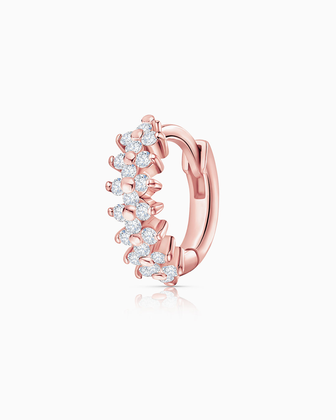 Brinco piercing em cruz com diamantes engastados em ouro rosa 18K. Inspirado em um dos formatos m...