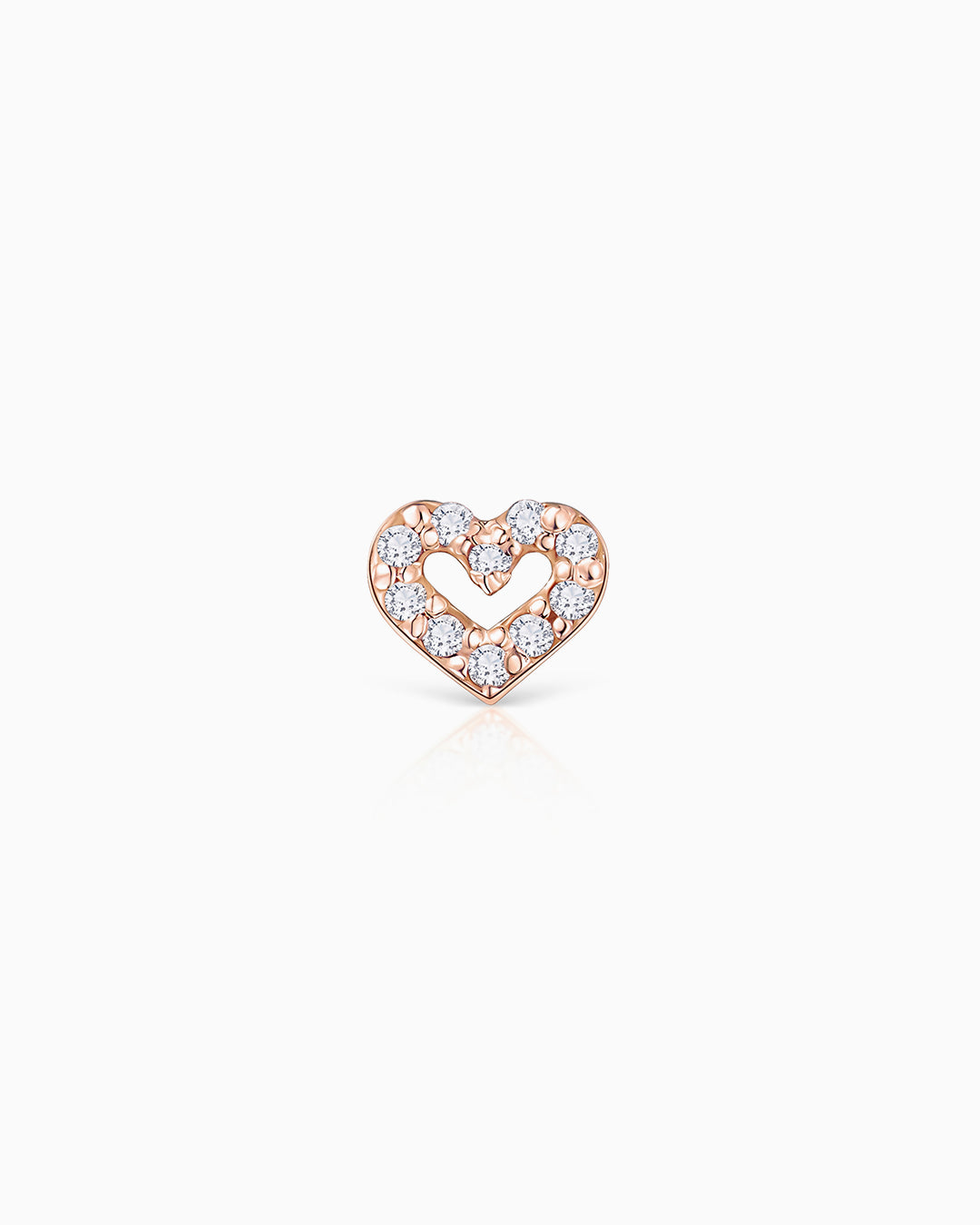 Brinco de piercing com diamante Cheri em ouro rosa 18 quilates. O piercing Cheri é tão cativante e deslumbrante quanto o amor à primeira vista. Na Mumit, queríamos elevar o símbolo icônico do amor adicionando nossos diamantes requintados e, ao mesmo tempo, transformá-lo no acessório perfeito para iluminar qualquer visual do dia a dia. Projetado para combinar perfeitamente com uma grande variedade de brincos, este piercing romântico se tornará um amuleto que você vai querer carregar sempre com você. O brinco piercing Cheri está disponível em três versões: ouro amarelo 18 quilates, ouro branco e ouro rosa.Se desejar, você pode encomendá-lo com um fecho de parafuso especial para hélice ou cartilagem, selecionando-o no menu acima (este extra tem um custo adicional de € 6). Além disso, você pode encomendá-lo com um fecho especial para o tragus (este extra tem um custo adicional de € 25). Junte-se à tendência da moda e crie seu look de orelha com Mumit!
