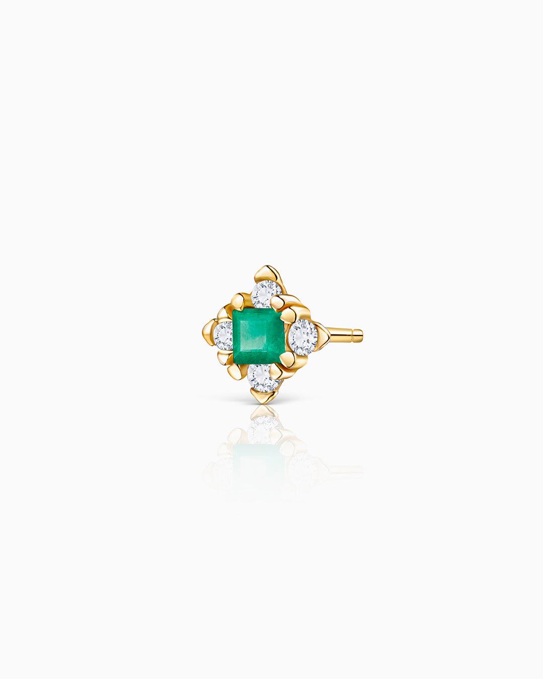 Brinco de piercing com esmeralda e diamante da Princesa Herdeira em ouro amarelo 18K. A famosa coleção Crown é inspirada na história da realeza, contada através do brilho das joias mais preciosas, coroas reais e tiaras. As peças desta coleção distinta são uma interpretação minimalista requintada das imponentes pedras preciosas que adornam as Joias da Coroa. Cheio de cor e brilho, o design do piercing Crown Princess se destaca pela esmeralda central magnética em lapidação princesa, protegida por quatro diamantes em lapidação brilhante, resultando em uma fusão perfeita de elegância e modernidade. O brinco piercing Crown Princess está disponível em três versões: rubi, esmeralda e safira.Se desejar, você pode encomendá-lo com um fecho de parafuso especial para hélice ou cartilagem, selecionando-o no menu acima (este extra tem um custo adicional de € 6). Além disso, você pode encomendá-lo com um fecho especial para o tragus (este extra tem um custo adicional de € 25). Junte-se à tendência da moda e crie seu look de orelha com Mumit!