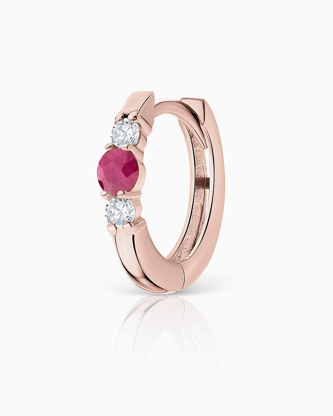 Brinco de argola Memphis Piercing com rubi e diamantes cravejados em ouro rosa 18K. Ideal para dar um toque de luz e cor ao visual da sua orelha, o piercing Memphis é um brinco que não pode faltar na sua orelha. Disponível em três cores cativantes, este piercing original é caracterizado por seu anel inteiro adornado com um rubi rodeado por dois diamantes. Um design minimalista que causará um grande impacto. Possui fecho tipo congo para facilitar a colocação e o ajuste em qualquer piercing. Você pode usá-lo tanto no lóbulo quanto na cartilagem, criando combinações surpreendentes.O piercing Memphis está disponível em uma versão em ouro branco com três diamantes marcantes e em três versões adicionais que combinam diamantes com esmeralda, rubi e safira.