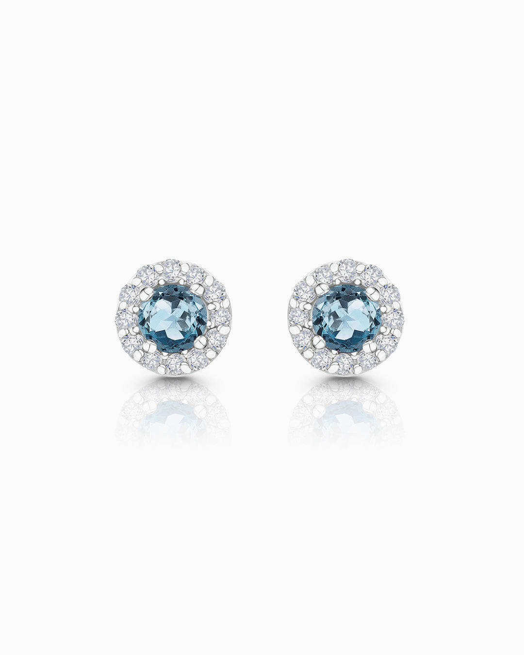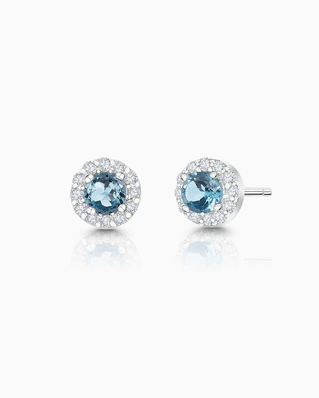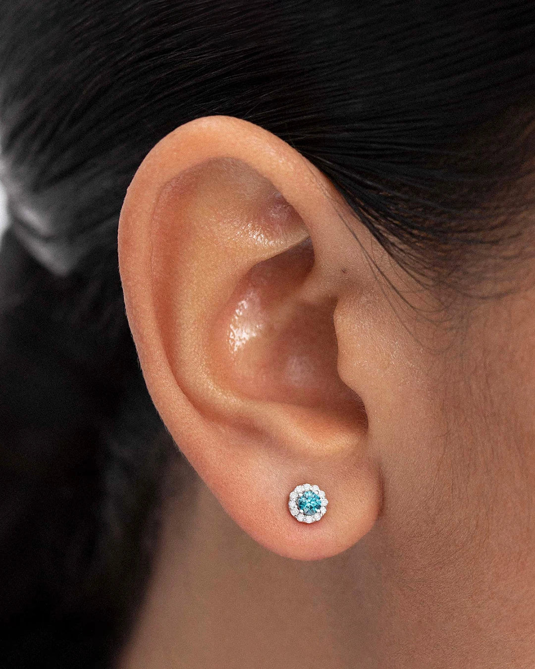 Brincos Anette Mini de água-marinha e diamante em ouro branco 18 K. Um toque de cor que combina com todos os estilos, com uma água-marinha central cercada por uma coroa de diamantes de lapidação brilhante. Um design que pode ser combinado com outros brincos e piercings da marca para criar um visual de orelha perfeito.