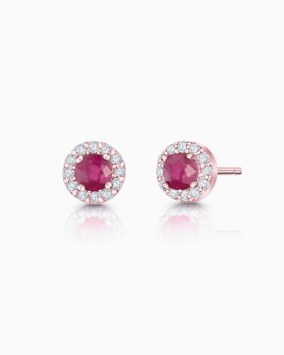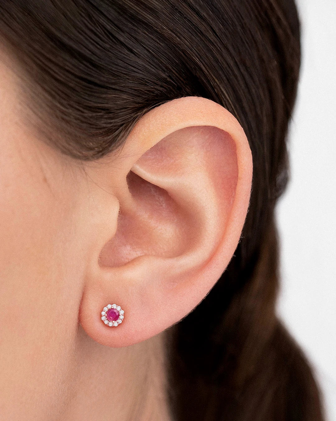 Brincos Anette Mini Rubi e Diamante em Ouro Rosa 18K. Um toque de cor que combina com todos os estilos, com um rubi central rodeado por uma coroa de diamantes lapidação brilhante. Um design que pode ser combinado com outros brincos e piercings da marca para criar um visual de orelha perfeito.