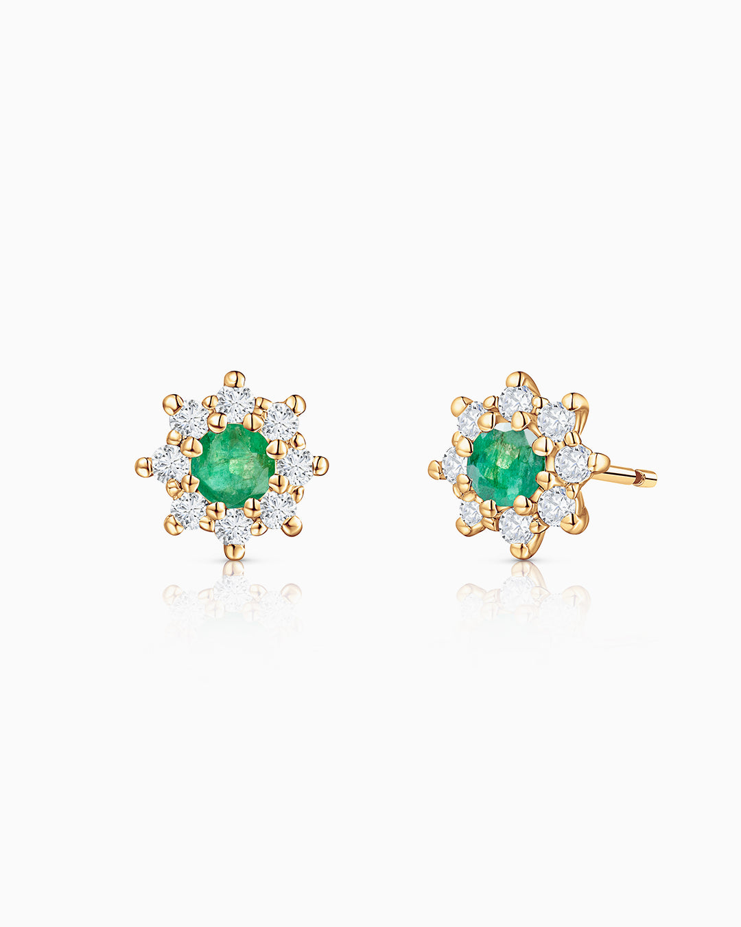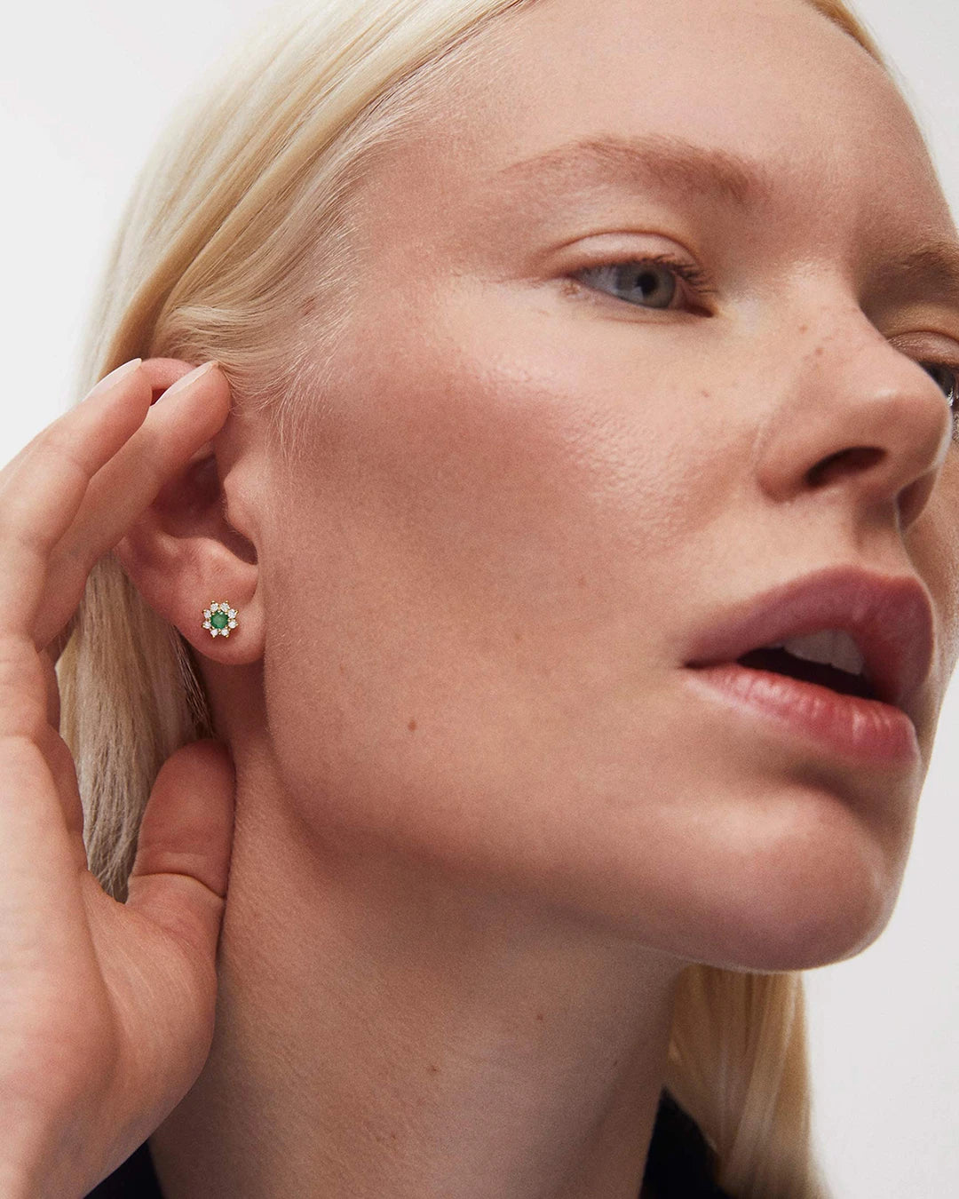 Brincos de esmeralda e diamante Astrid feitos em ouro amarelo 18 quilates. O design dos brincos Astrid funde a estética romântica das rosetas e o espírito moderno que distingue a Mumit, resultando em uma expressão inesquecível de elegância atemporal. O tom verde característico da esmeralda contrasta perfeitamente com o brilho claro dos diamantes ao redor, criando um impacto visual único. Além disso, a borda de diamante aumenta o tamanho percebido da pedra central, realçando sua silhueta delicada e tornando-a o centro das atenções. Versáteis e sofisticados, são uma joia perfeita tanto para o dia a dia quanto para combinar com o restante das peças da coleção e elevar o seu visual.olharem qualquer evento especial. Os brincos Astrid estão disponíveis em três versões: ouro amarelo 18 kt com esmeraldas e diamantes, ouro branco 18 kt com safiras e diamantes e ouro rosa 18 kt com rubis e diamantes.