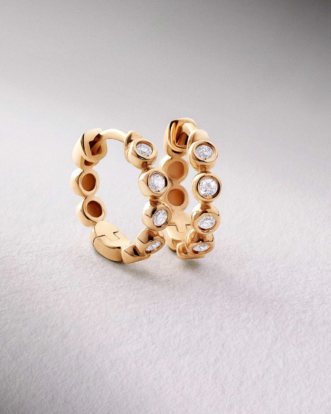 Os brincos Origine da Mumit homenageiam o bisel, a primeira técnica de engaste na tradição da ourivesaria. Seu design de aro se distingue por uma sucessão de diamantes engastados na luneta que parecem fluir perfeitamente, alcançando um equilíbrio perfeito entre técnica e criatividade. As formas arredondadas que caracterizam esse tipo de ambiente reforçam a continuidade do design e, ao mesmo tempo, conferem um toque moderno inconfundível. Como um fio de luz, a pureza do ouro 18kt e o brilho dos diamantes naturais se unem em uma declaração de sofisticação que transcende tendências. Uma peça essencial que celebra o legado da joalheria fina, reinterpretando-o por meio de uma estética refinada e contemporânea.