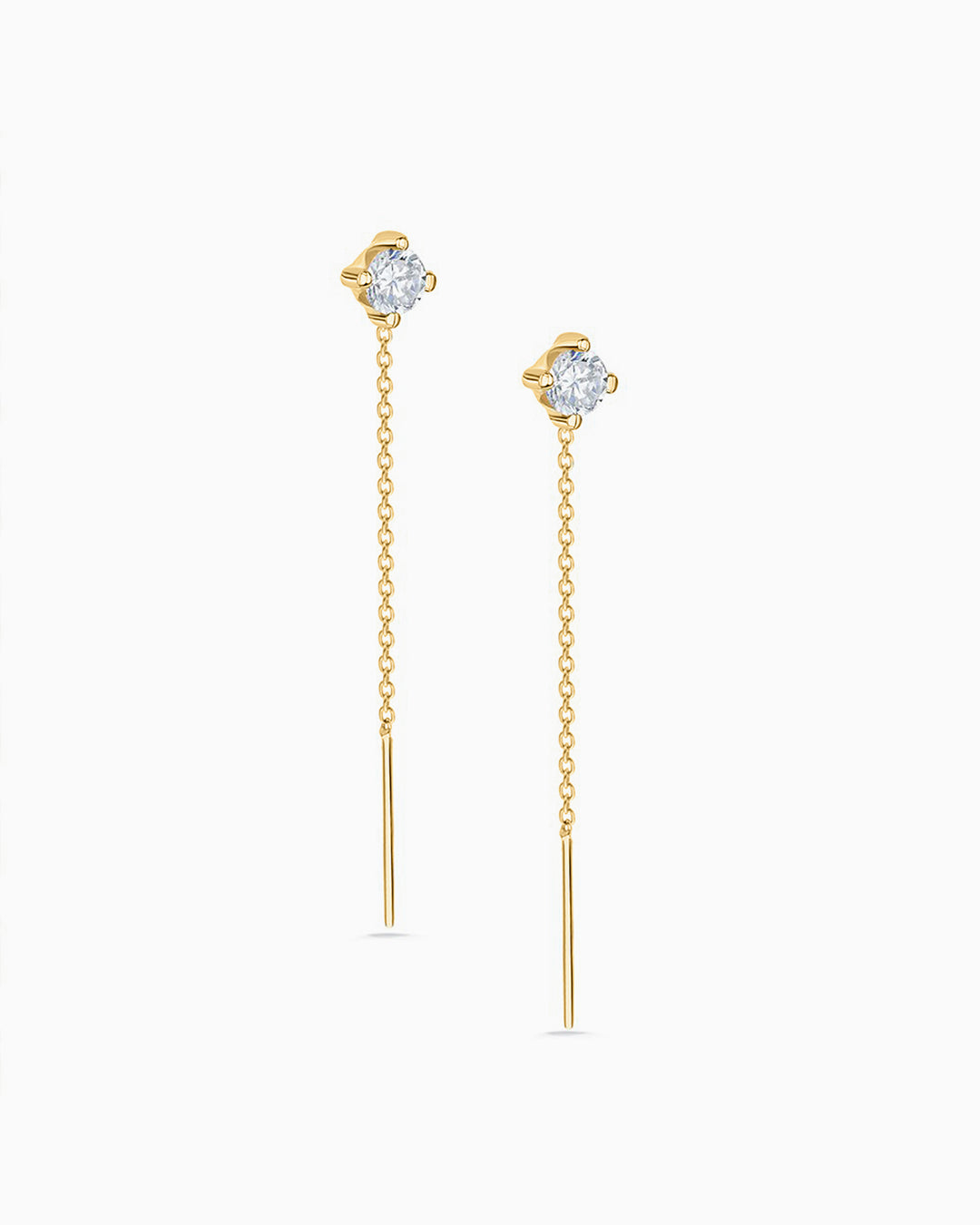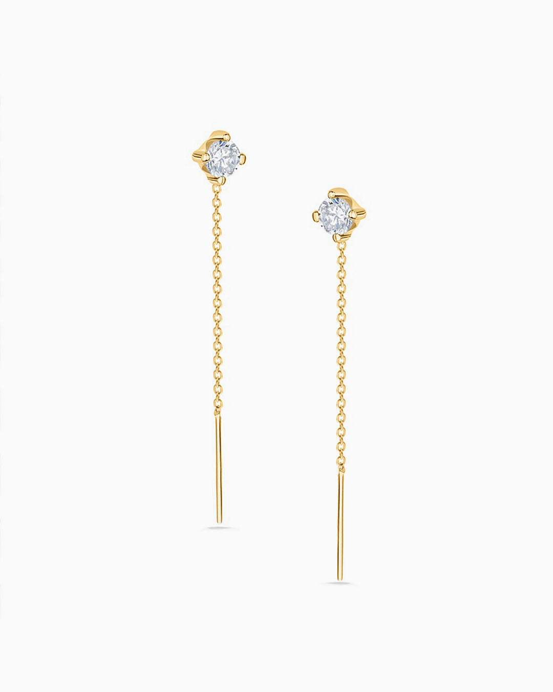 Brincos Catena em ouro amarelo 18K e chaton de topázio branco. Um item básico reinventado, estes brincos apresentam um design de corrente e barra coberto com um chaton de topázio branco. O comprimento é ajustado esticando suavemente a corrente através do lóbulo. Se você tiver mais de um buraco, você pode tentar passar de diferentes maneiras de um para o outro. Essa versatilidade é o que os torna tão populares!