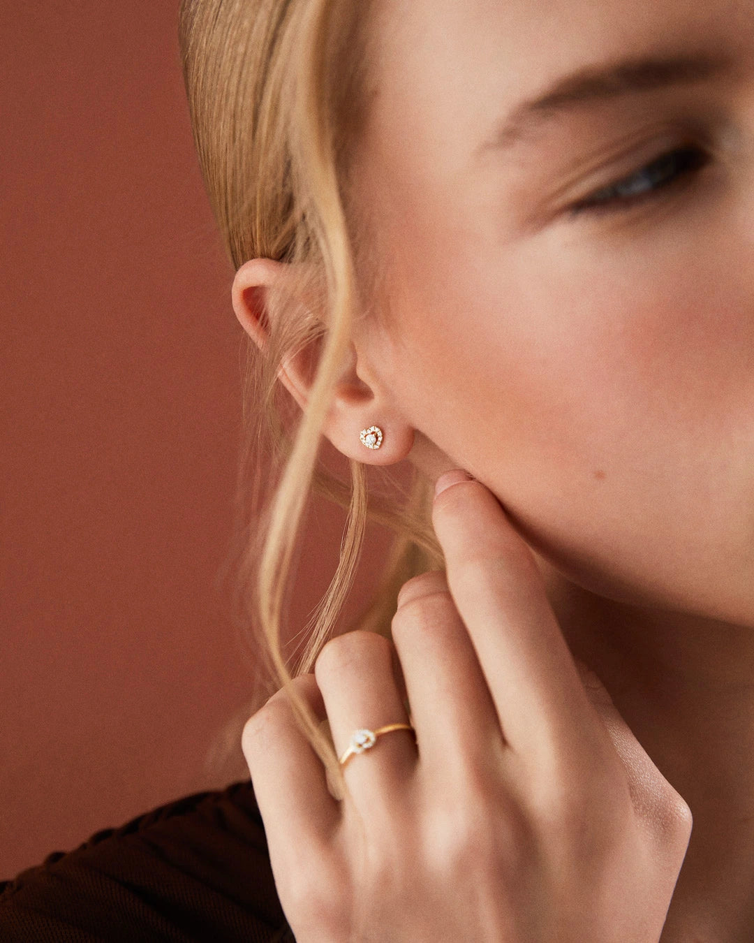 Inspirados na beleza misteriosa do céu noturno, os brincos Ariadne fundem simbolismo antigo com sofisticação contemporânea. Ariadne, princesa de Creta, ajudou Teseu a escapar do labirinto do Minotauro por meio de uma coroa luminosa. Segundo a lenda, este símbolo de amor e coragem foi posteriormente lançado ao céu, formando a constelação de Corona Borealis. O design dos brincos reflete o esplendor desta magnífica tiara de estrelas graças a um requintado solitário de lapidação brilhante, acompanhado por um halo de diamantes em formato de coração. O espaço entre a pedra central e o halo de luz que a envolve cria o efeito óptico de uma coroa flutuante, criando uma silhueta etérea e delicada. Feitos em ouro 18 quilates, os brincos Ariadne são uma homenagem à natureza universal das histórias que contamos para explicar os mistérios do universo e sua conexão com nossas vidas. Uma joia que combina elegância atemporal e brilho eterno, perfeita para revelar os poemas escondidos nas estrelas.