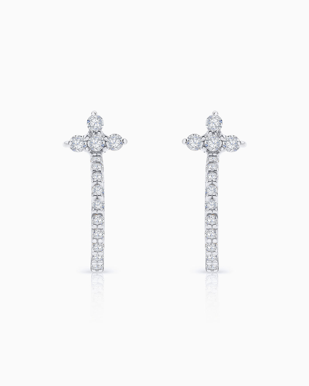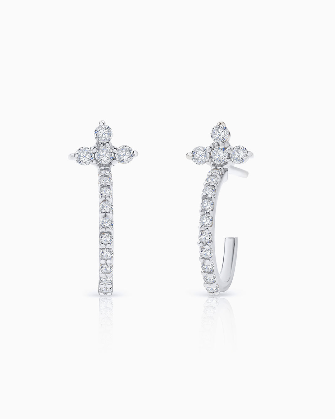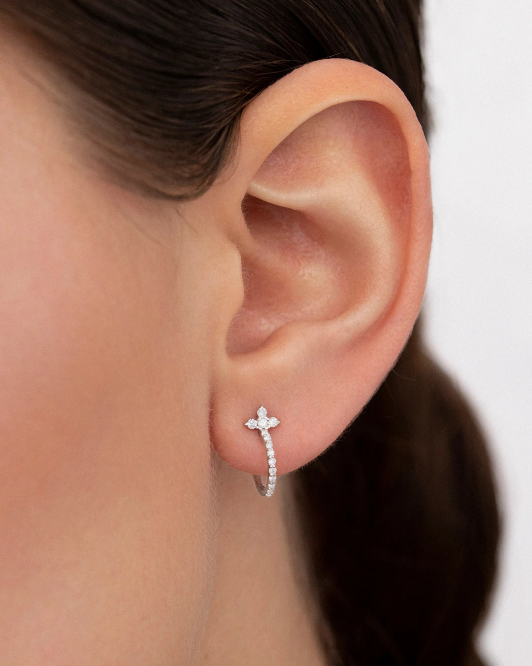 Brincos de argola Milett com diamantes pavé cravejados em ouro branco 18 quilates. Seguindo a essência da coleção Milett, estes brincos homenageiam o tradicional brinco de argola reinventando-o em três cores surpreendentes: ouro rosa 18 quilates, branco e amarelo. Seu design é caracterizado pela espetacular exibição de luz criada pelo anel de diamantes pavé que culmina em um característico formato de trevo. Os brincos Milett são ideais para usar em qualquer ocasião, além de terem um toque extra de elegância e originalidade que vão fazer você sonhar. Eles incorporam um fecho de pressão ou porca borboleta na parte superior do arco, contribuindo para seu conforto e ajuste à orelha. Cada brinco Mumit é uma criação única, deixe-se levar pelo seu lado mais criativo e descubra sua magia.