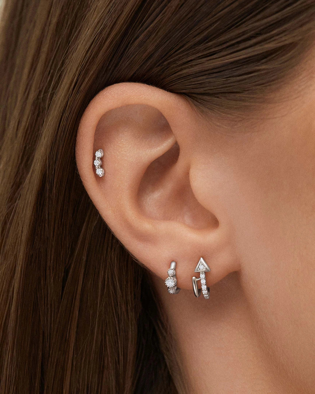 Brincos de diamante Milgrain Trilogy em ouro branco 18 quilates. A coleção Milgrain é inspirada em uma estética vintage minimalista, refletida na sutil referência ao passado de sua estrutura granulada original. Esta técnica única é caracterizada por uma gravação requintada que, com delicadeza e maestria, consegue um efeito através do qual os diamantes brilham e flutuam ao mesmo tempo, elevando sua beleza e pureza. A silhueta dos brincos Milgrain Trilogy originais se distingue por um refinado trio de diamantes que ganha forma através da granulação da configuração. Eles são perfeitos para combinar com os outros brincos da coleção graças ao fecho de pressão que proporciona segurança e conforto. Brincos com um toque retrô sutil que você vai adorar usar. Os brincos Milgrain Trilogy estão disponíveis em três versões: ouro rosa 18K, ouro amarelo e ouro branco.