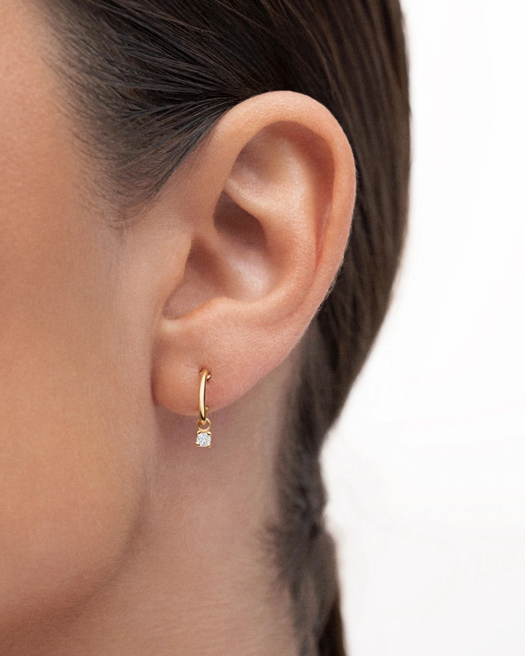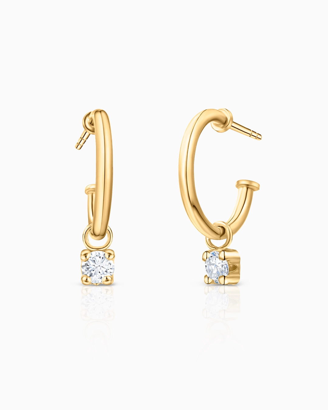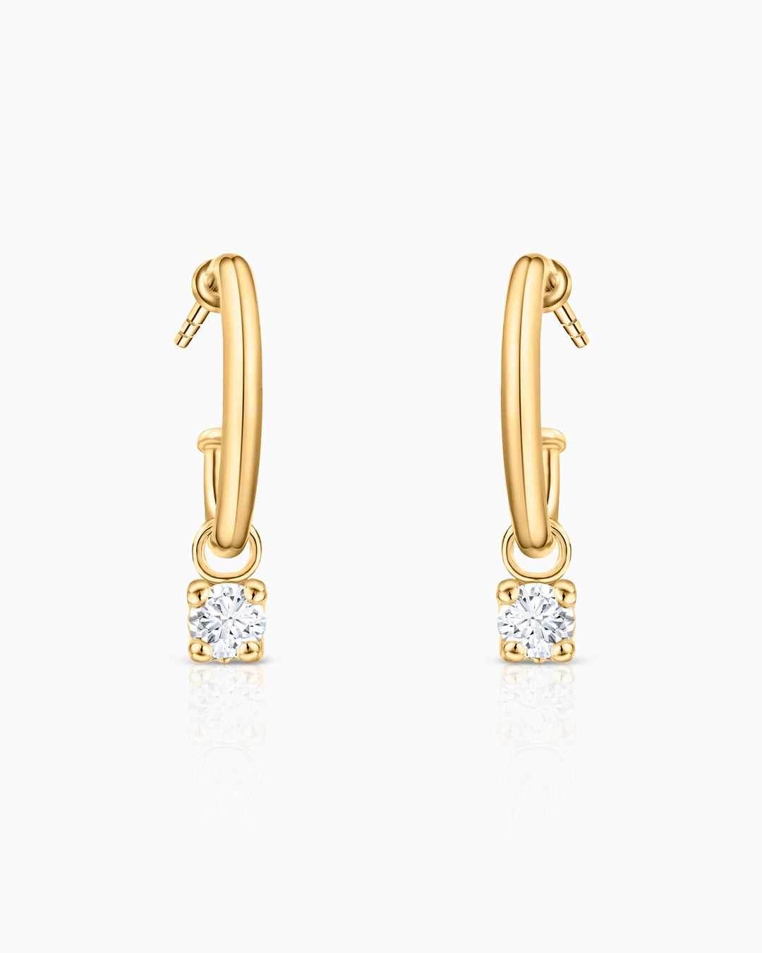 Brincos de meia argola Dot Diamonds com pingente de diamante em ouro amarelo 18K. Projetados em t...