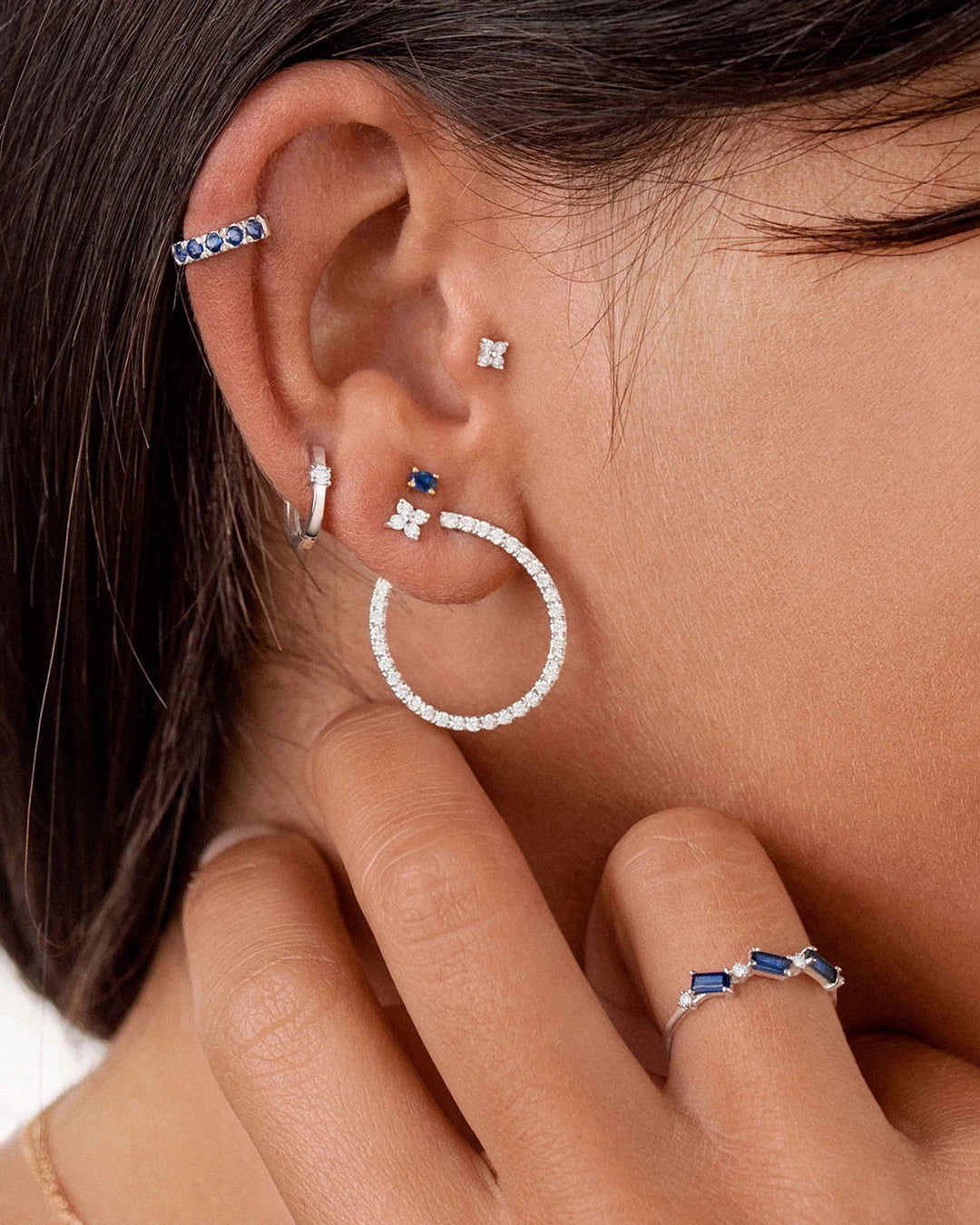 Brincos de safira ousados Eternity Colors montados em ouro branco 18 quilates. Projetados em três cores sublimes, esmeralda, safira e rubi, estes brincos são a versão sem diamantes de uma das nossas coleções mais icônicas. Estes são brincos originais que são sobre cor e positividade. Eles têm um aro um pouco mais largo do que o modelo Eternity Colors Hoop, um detalhe único que lhes dá um ponto diferenciador que você vai adorar. Perfeitos para usar em pares e também para criar jogos de cores no ouvido graças ao seu tamanho, ideais para se adaptarem perfeitamente a qualquer local. Combine-os com os outros brincos da coleção!Os brincos Eternity Colors Bold estão disponíveis em três versões: ouro amarelo com esmeraldas, ouro rosa com rubis e ouro branco 18 quilates com safiras.