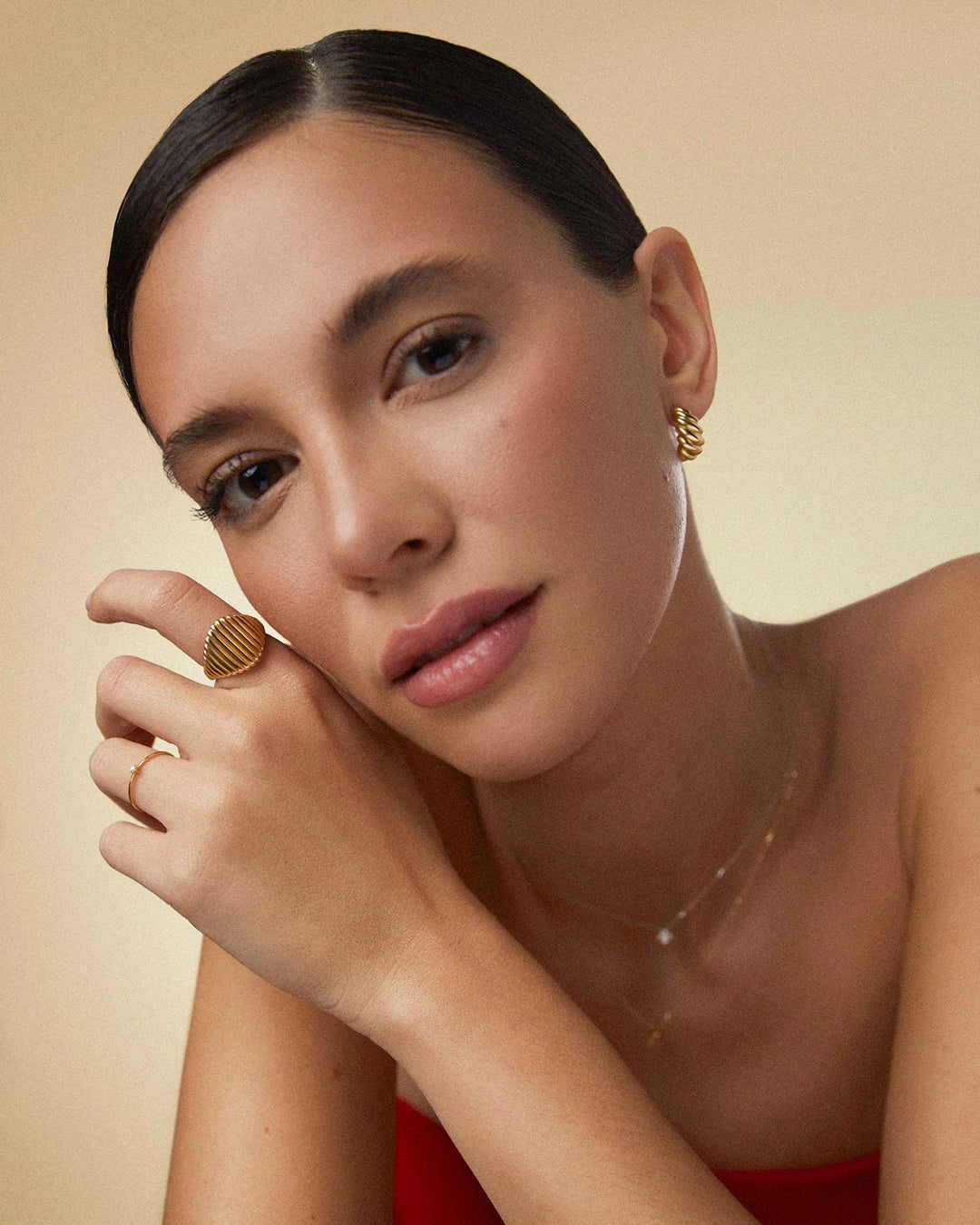 Descubra o poder expressivo do ouro no Duomo, uma coleção de joias inspiradas na arquitetura que reflete o espírito inovador da Mumit em cada brilho. Esta ode à cúpula se destaca por peças marcantes com linhas geométricas e acabamentos refinados, ideais para elevar qualquer visual. Explore os diferentes designs disponíveis para combiná-los entre si e criar contrastes de texturas e volumes que não deixarão ninguém indiferente.