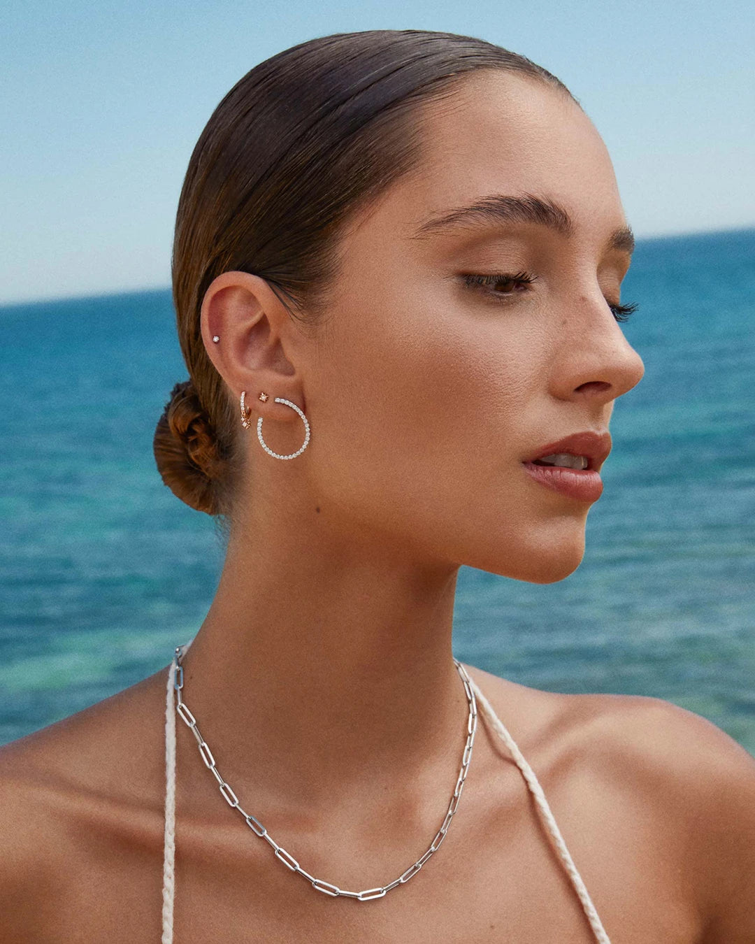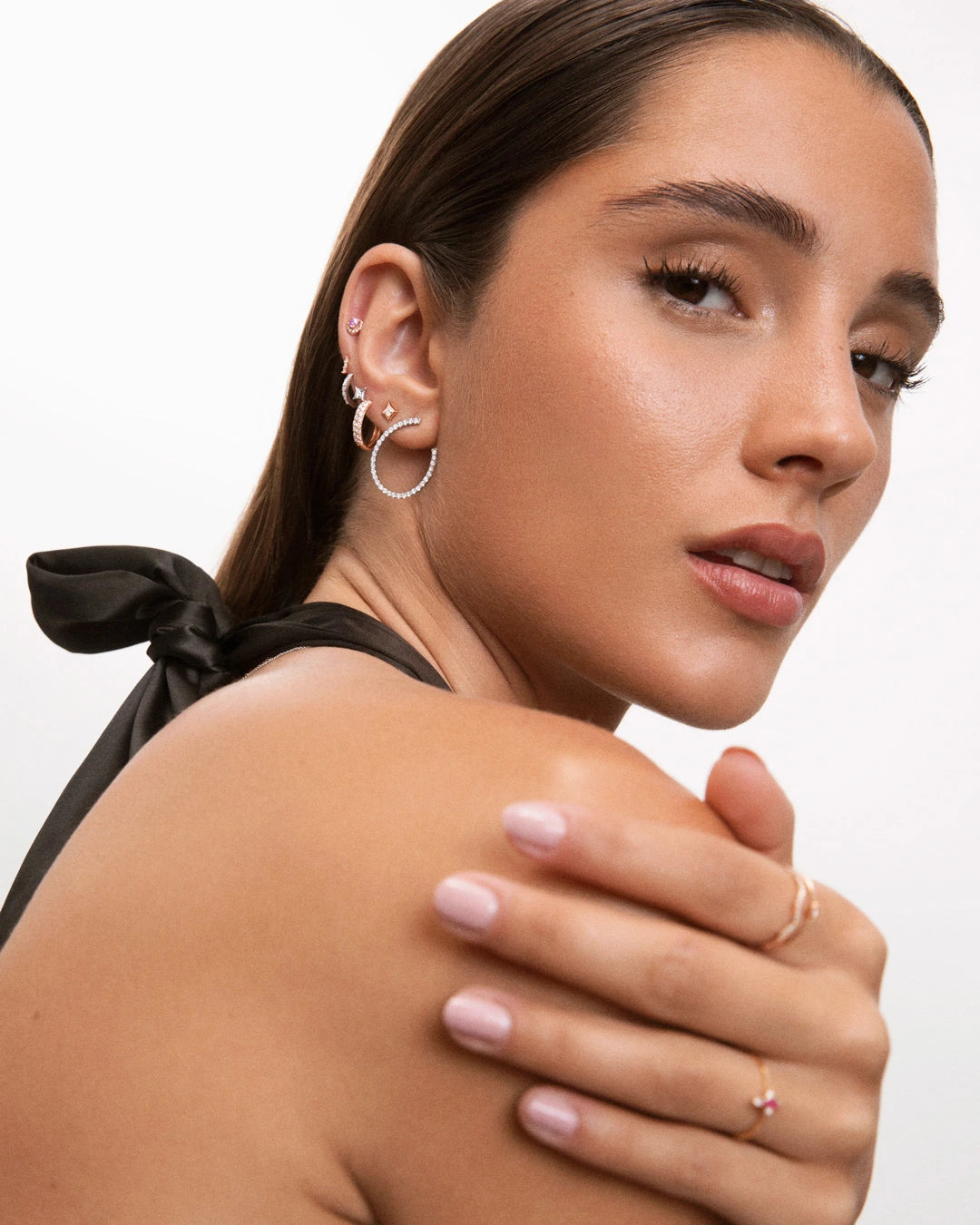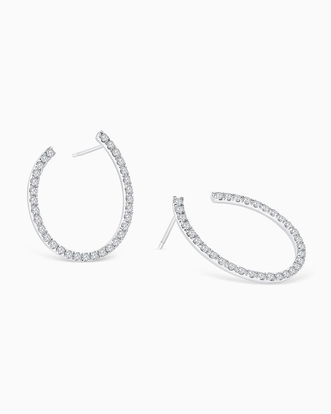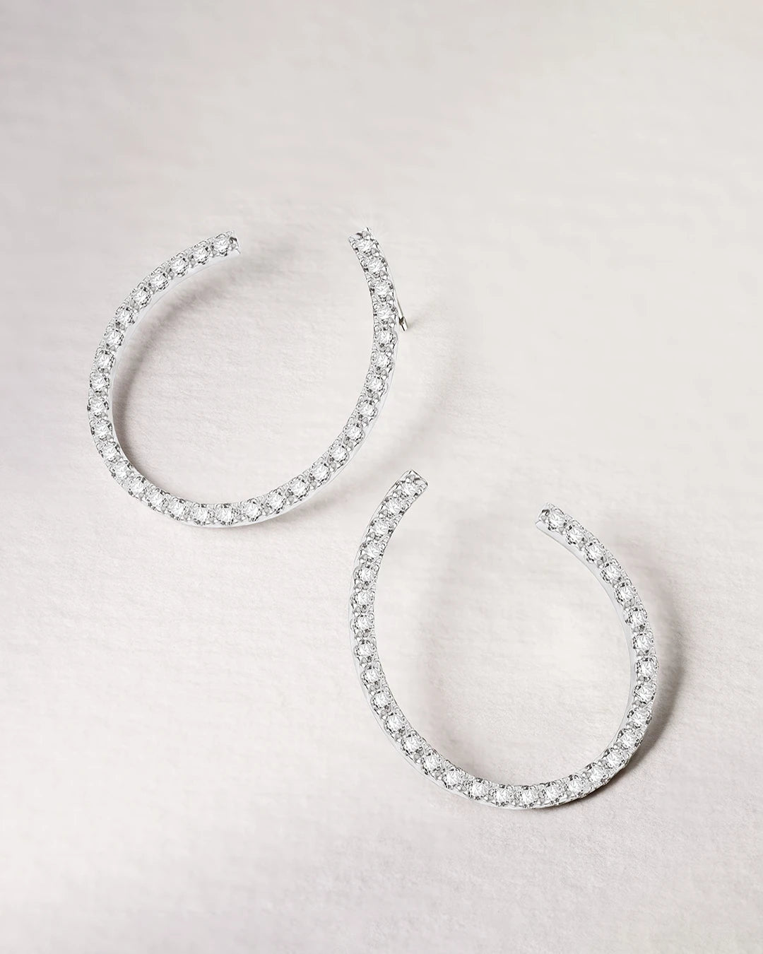 Brincos Glam Diamonds feitos em ouro branco 18 K. Inspirada na essência do diamante, símbolo de força, singularidade e elegância, uma das peças mais exclusivas da empresa ganha vida: os brincos Glam Diamonds. O design desses brincos toma sua forma original a partir da figura abstrata de uma gota d'água que se une ao lóbulo por uma de suas extremidades. Esses brincos exclusivos com diamantes de lapidação brilhante cuidadosamente engastados alcançam o equilíbrio perfeito entre elegância e estética contemporânea, que são a marca registrada da marca. Um design fascinante com linhas limpas que realçam a beleza de cada um dos seus diamantes, com um peso total de um quilate. Pare de sonhar com elas e adicione-as à sua caixa de joias!