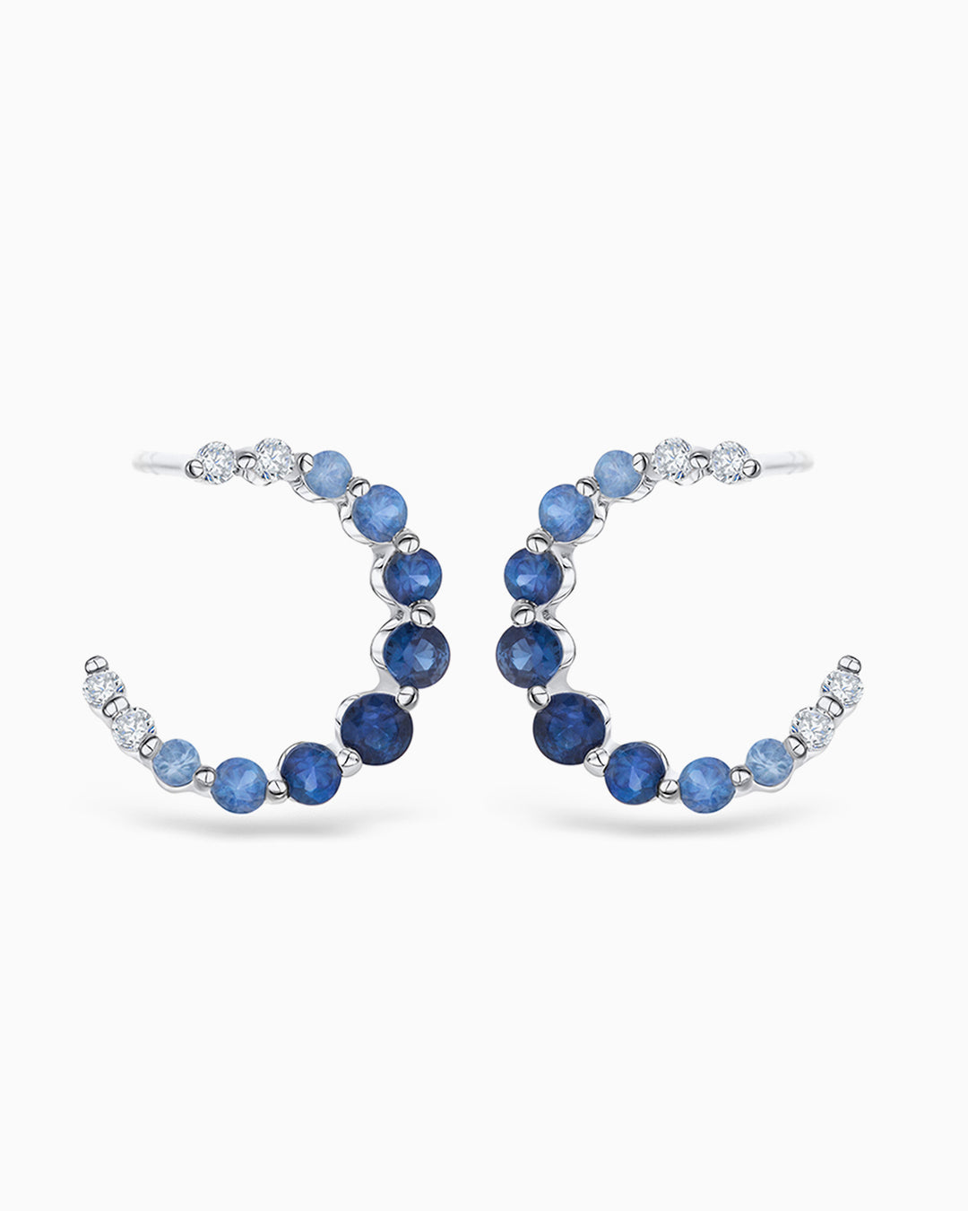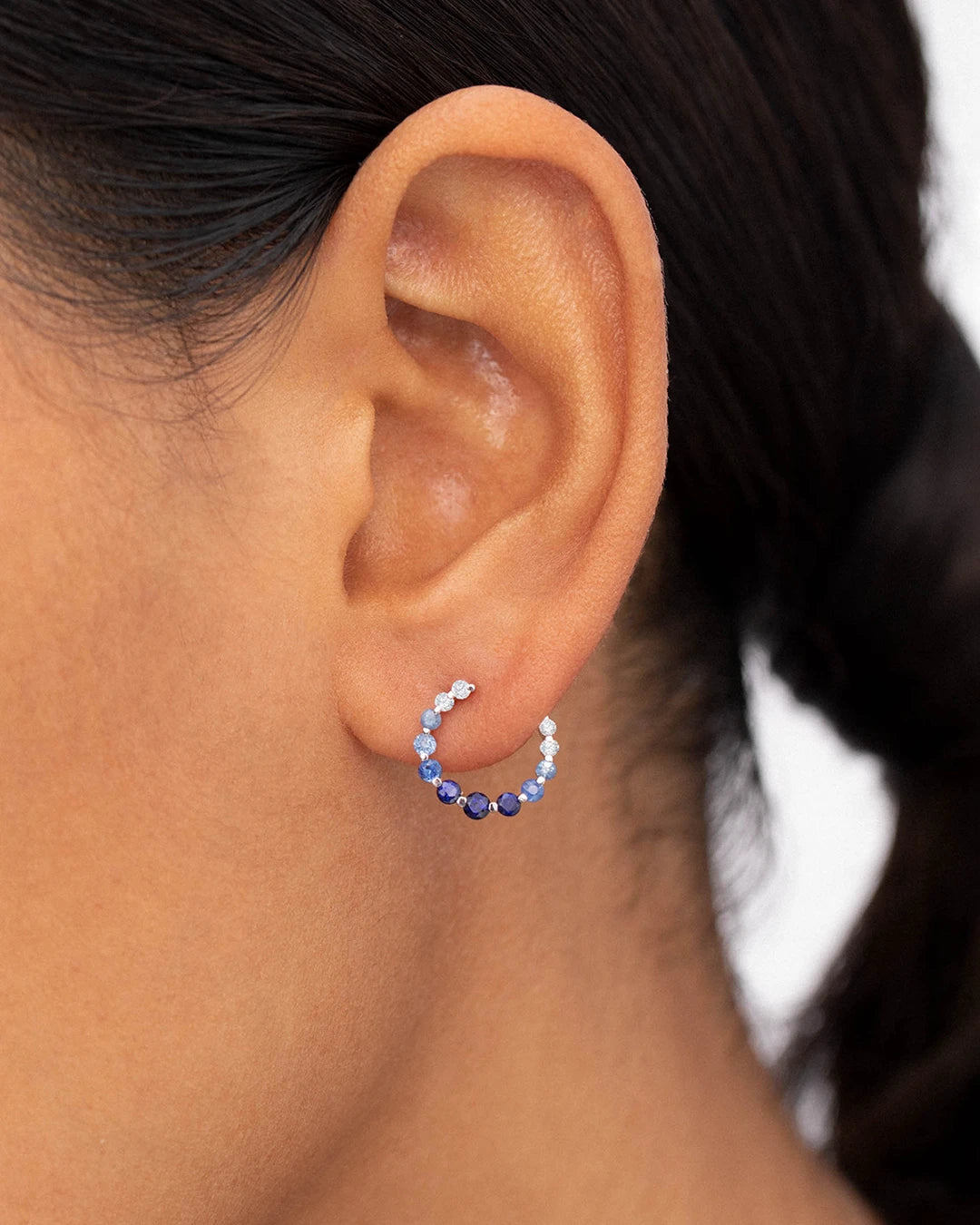 Brincos Lucie com safiras azuis degradê e diamantes cravejados em formato de argola em ouro branc...