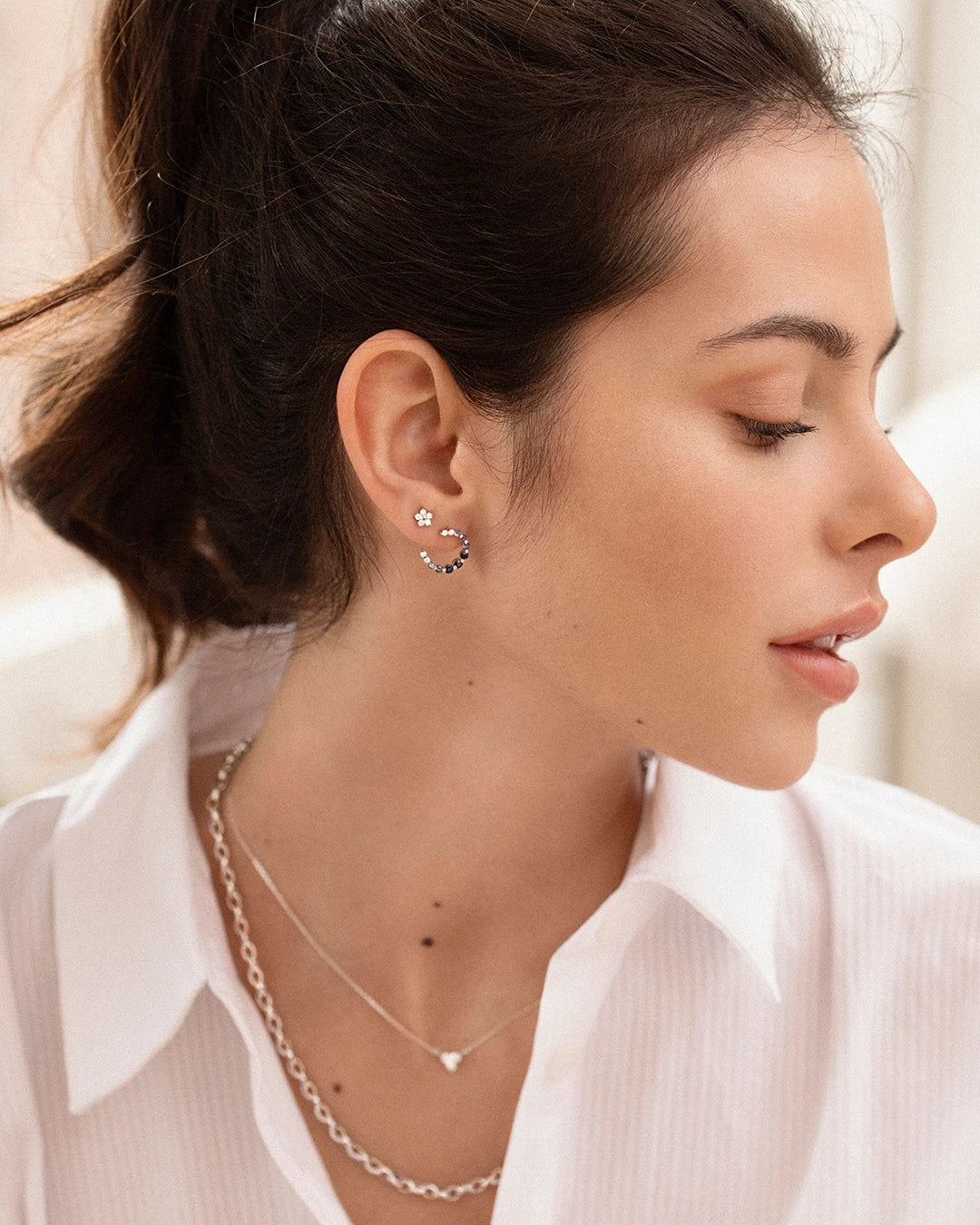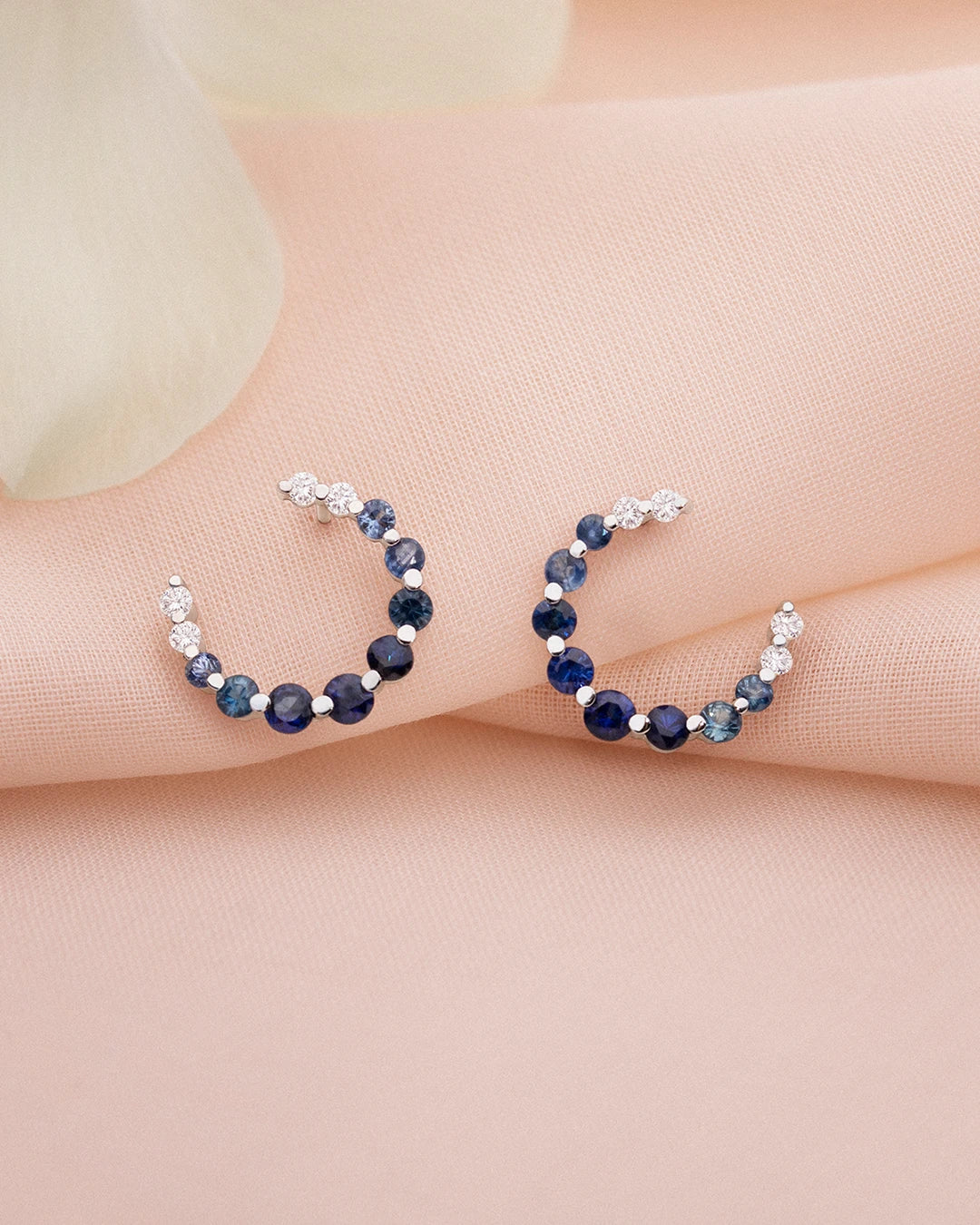 Brincos Lucie com safiras azuis degradê e diamantes cravejados em formato de argola em ouro branco 18 quilates. O mistério do céu estrelado e dos ciclos lunares inspiram o design dos brincos Lucie, uma joia que abraça a escuridão da noite oferecendo um ponto de luz. Suas oito safiras degradê evocam ciclos lunares através de seu brilho iridescente que muda dependendo do ângulo de visão do brinco. Eles apresentam um fecho borboleta e um pino localizado em uma extremidade do meio arco original, promovendo assim seu movimento maravilhoso e brilho único. Leve a revolução da joalheria fina para o seu ouvido com elegância e originalidade. Junte-se à tendência da moda e crie seu visual de orelha de diamante com Mumit!