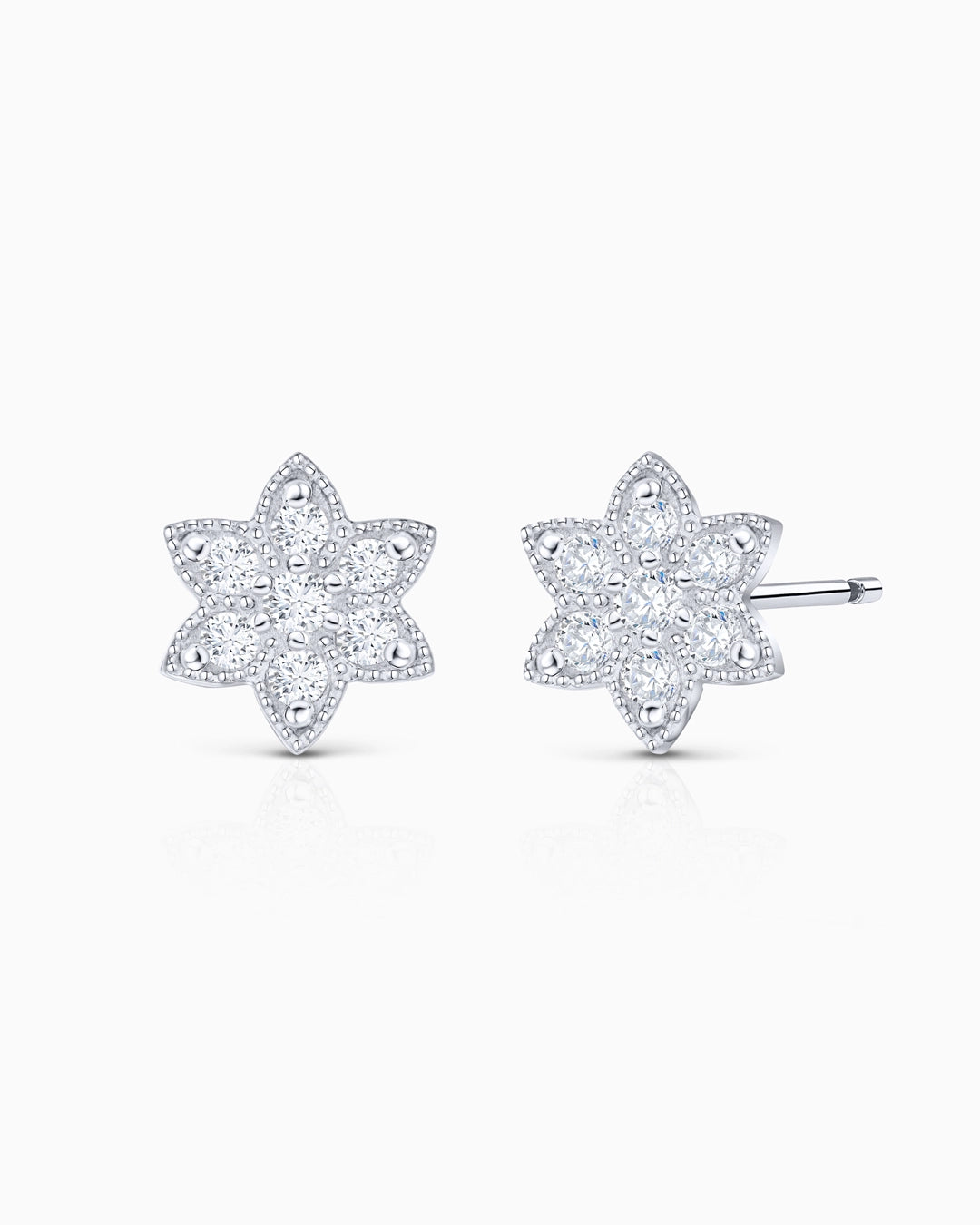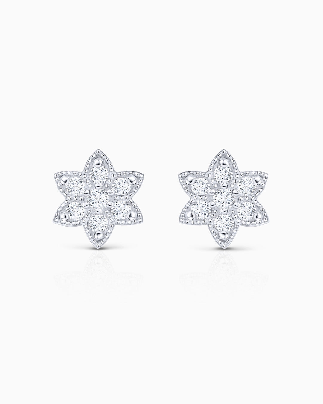 Brincos de diamante Milgrain Lotus em ouro branco 18 quilates. Milgrain, uma coleção inspirada em uma estética minimalista vintage com um sutil aceno ao passado por meio de sua armação granulada original. Este cenário único é caracterizado por uma granulação delicada que cria com delicadeza e maestria um efeito através do qual os diamantes brilham e flutuam ao mesmo tempo, fazendo com que a peça se adapte perfeitamente a cada diamante, realçando sua beleza e pureza. Os brincos Lotus originais, com inspiração retrô, traçam uma linda flor de lótus que ganha seu formato delicioso através do padrão pontilhado de sua configuração. Perfeitos para combinar com os outros brincos da coleção, eles possuem fecho de pressão que proporciona segurança e conforto. Brincos com um toque retrô sutil que você vai adorar usar.