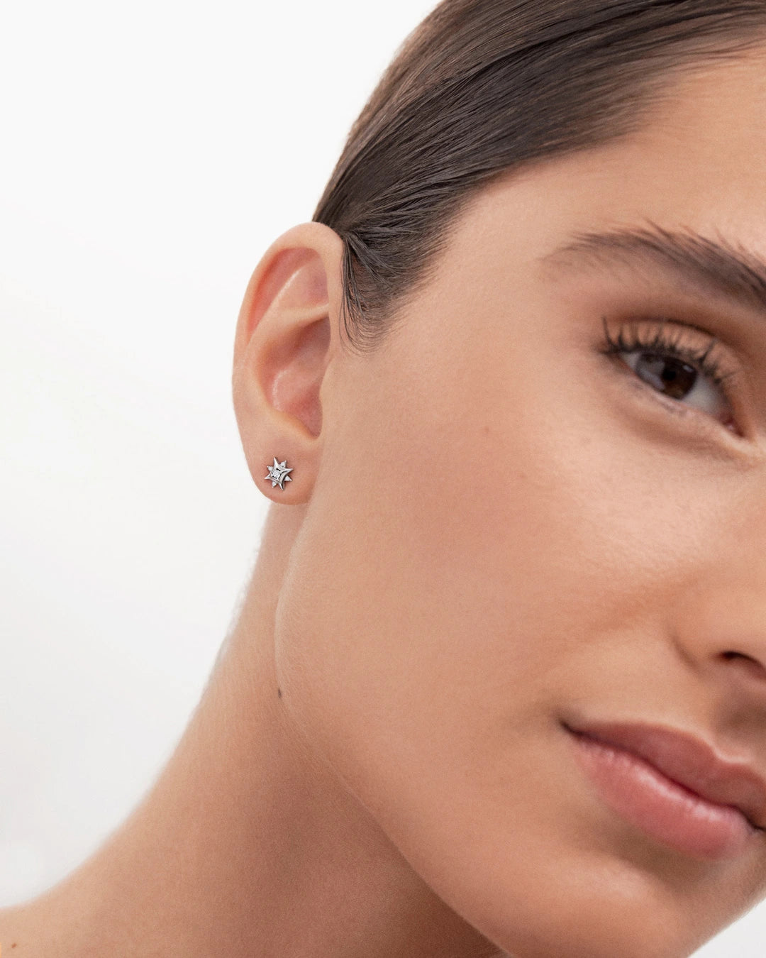 Brincos de diamante Mimosa Compass Rose feitos em ouro branco 18 quilates. Mimosa, uma coleção inspirada nas estrelas, seu brilho eterno que ilumina as noites mais escuras. Seu motivo, uma estrela que evoca a flor-de-lis e os quatro pontos cardeais característicos da Rosa dos Ventos, é representado por um diamante que culmina em um diamante central que representa a pessoa que o usa. Esses brincos originais simbolizam o início de uma jornada, tornando-se aquele guia necessário para sempre encontrar o caminho de volta. Para cada dia e para sempre, uma joia cheia de charme. Os brincos Mimosa Compass Rose estão disponíveis em três versões: ouro rosa 18 quilates, amarelo e branco.