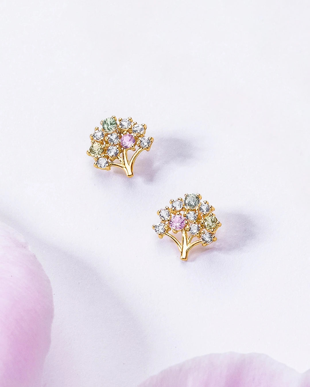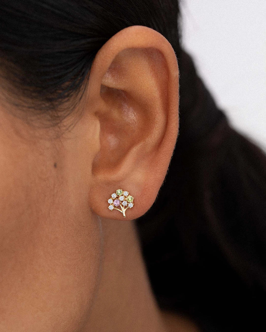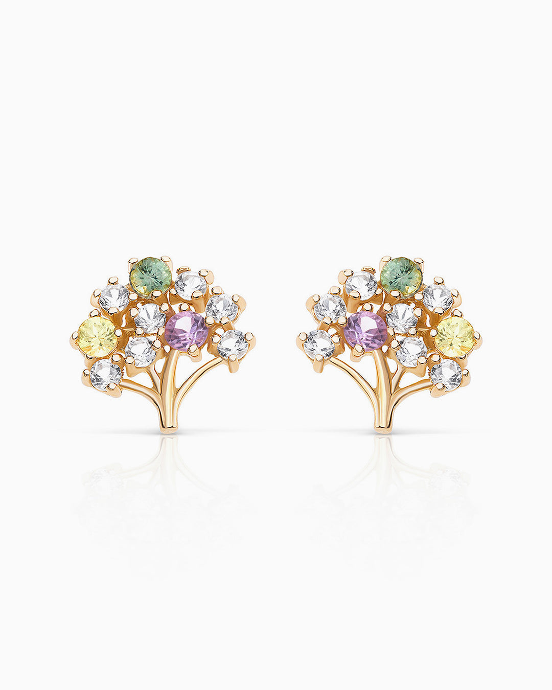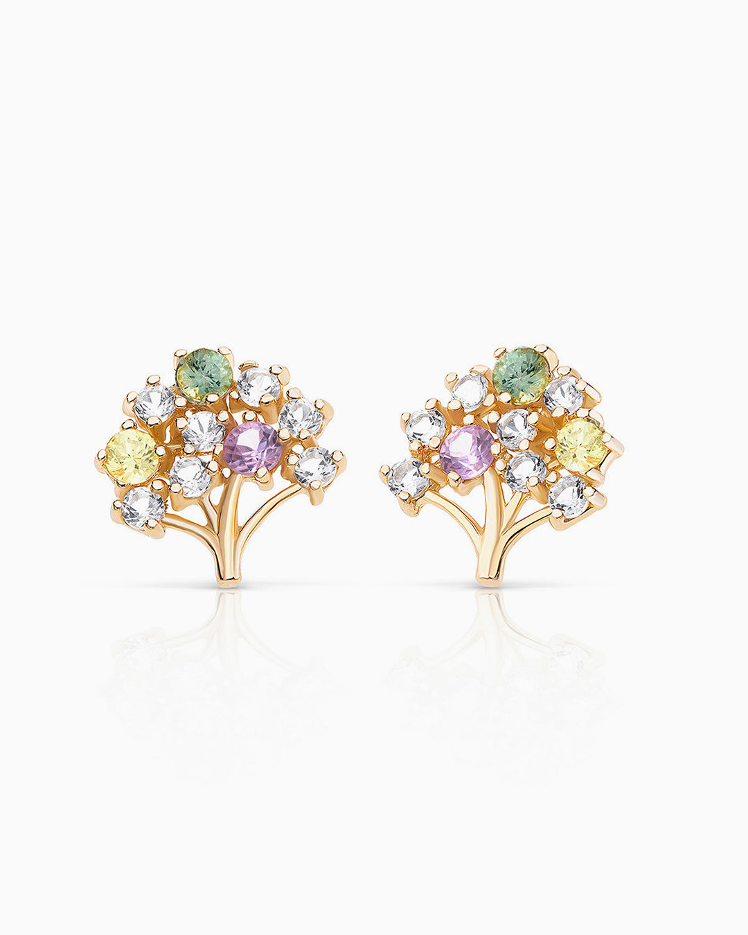 Os brincos Minzi Árvore da Vida feitos de safiras coloridas e topázios são um amuleto delicado e discreto. Seu design 'Árvore da Vida' incorpora o toque minimalista e moderno característico de todas as criações Mumit, transformando esses brincos em uma joia que você sempre vai querer usar. Lindas safiras coloridas (amarelo, rosa e verde) juntamente com topázio branco formam os ramos do design original feito em ouro amarelo 18 quilates que simboliza o Ciclo da Vida. Este design representa a essência da nossa existência, transmitindo força e positividade a todos que o usam. Você pode combiná-los com a gargantilha Minzi Tree of Life para um visual cheio de cor e magia.