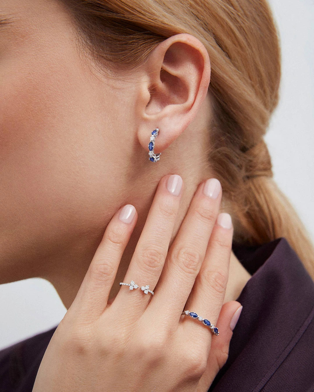 Brincos de safira e diamante Ondine em ouro branco 18 quilates. A coleção Ondine tem uma personalidade distintavintageo que se reflete em detalhes como o granulado discreto e elegante que percorre a silhueta das peças que o compõem. Majestosamente nostálgicos, os brincos Ondine apresentam uma seleção requintada de safiras lapidadasmarquesa, iluminados pelo brilho dos diamantes que os ladeiam e emoldurados pela granulação do monte. Deixe-se seduzir pelo espírito enigmático e sofisticado de Ondine e combine-a com as outras peças da coleção para dar um toque retrô a qualquer look.