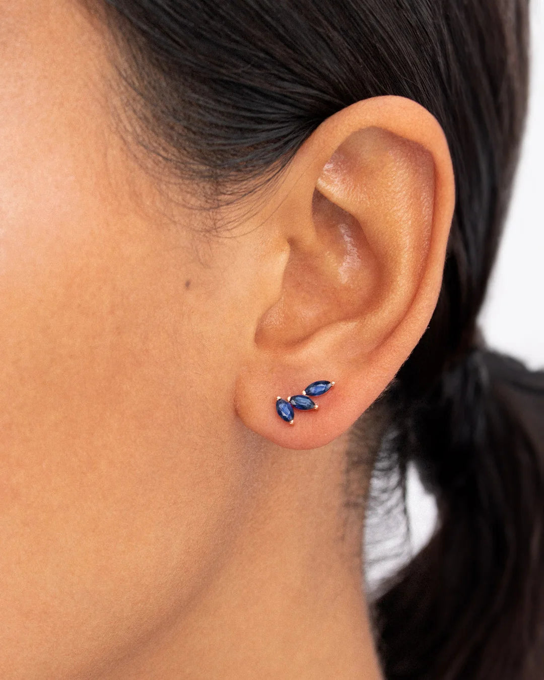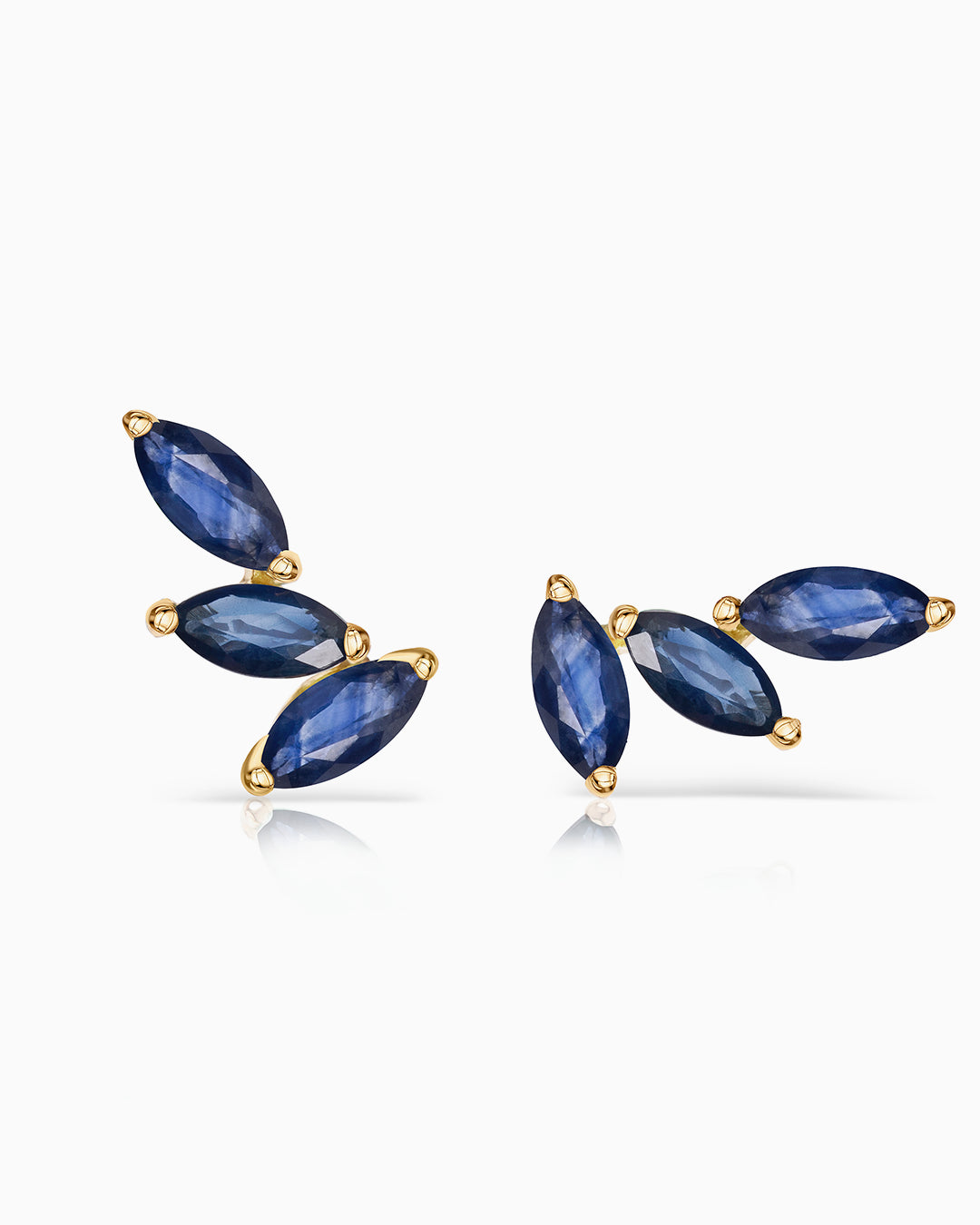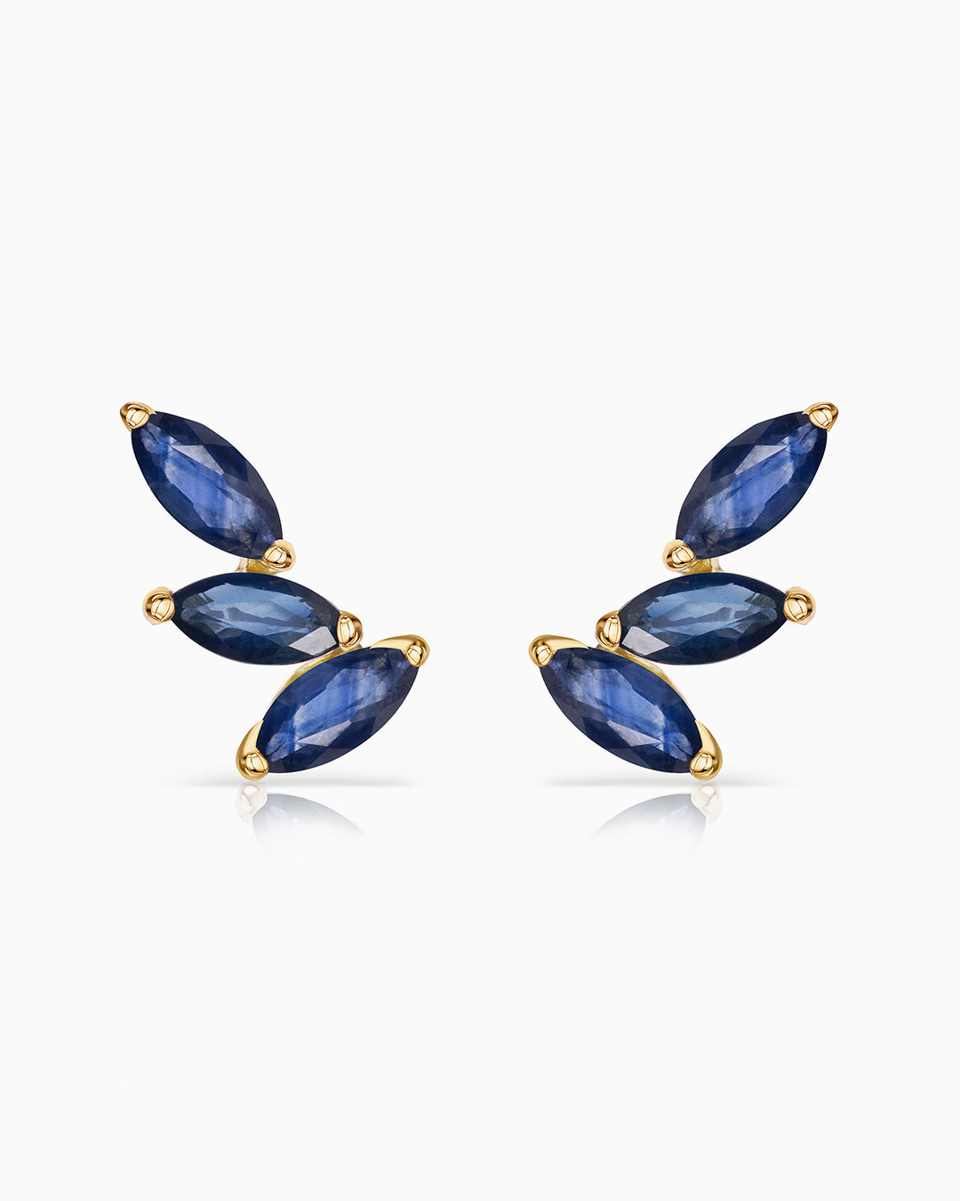 Brincos de safira com lapidação marquesa e cravejados em ouro amarelo 18 quilates. Inspirado nas formas da natureza e projetado para fazer você brilhar em qualquer ocasião. Este brinco original e versátil é composto por três safiras lapidadas em marquise que se juntam para traçar o formato delicado do lóbulo. Seu formato característico permite que sejam usados tanto no lóbulo quanto na hélice, criando looks surpreendentes. Eles incorporam um fecho de pressão ou porca borboleta no centro do brinco, contribuindo para seu conforto e ajuste.Os brincos de alpinista Tri-Marquise estão disponíveis em três versões com esmeralda, rubi ou safira engastadas em ouro amarelo 18 quilates.