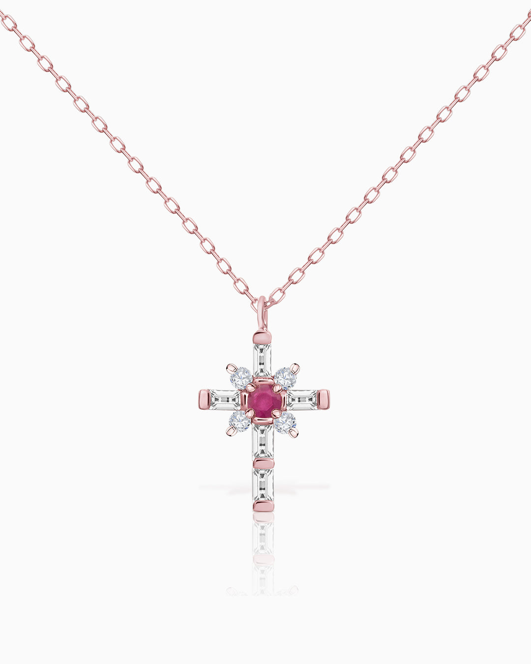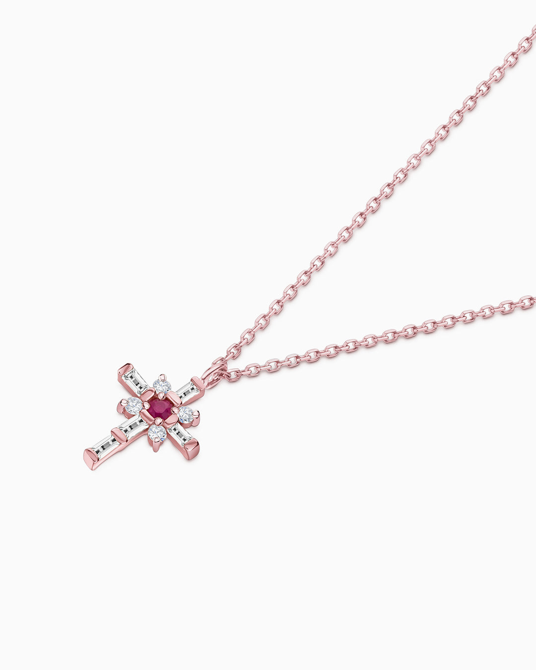 Gargantilha Brinna Cross com diamantes lapidação brilhante e baguete, com um rubi central engasta...