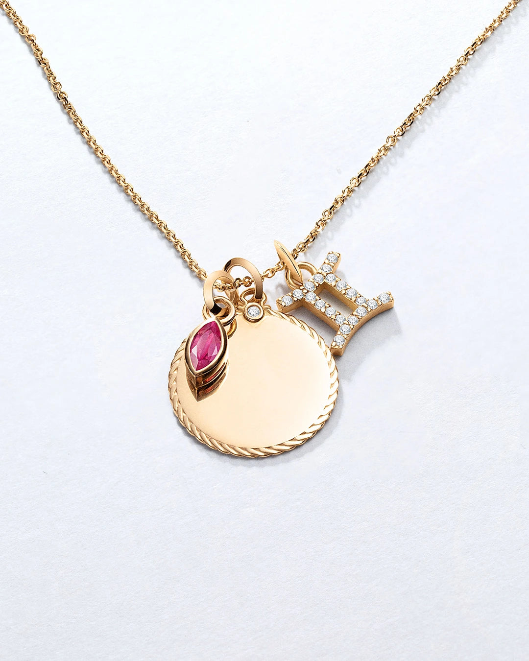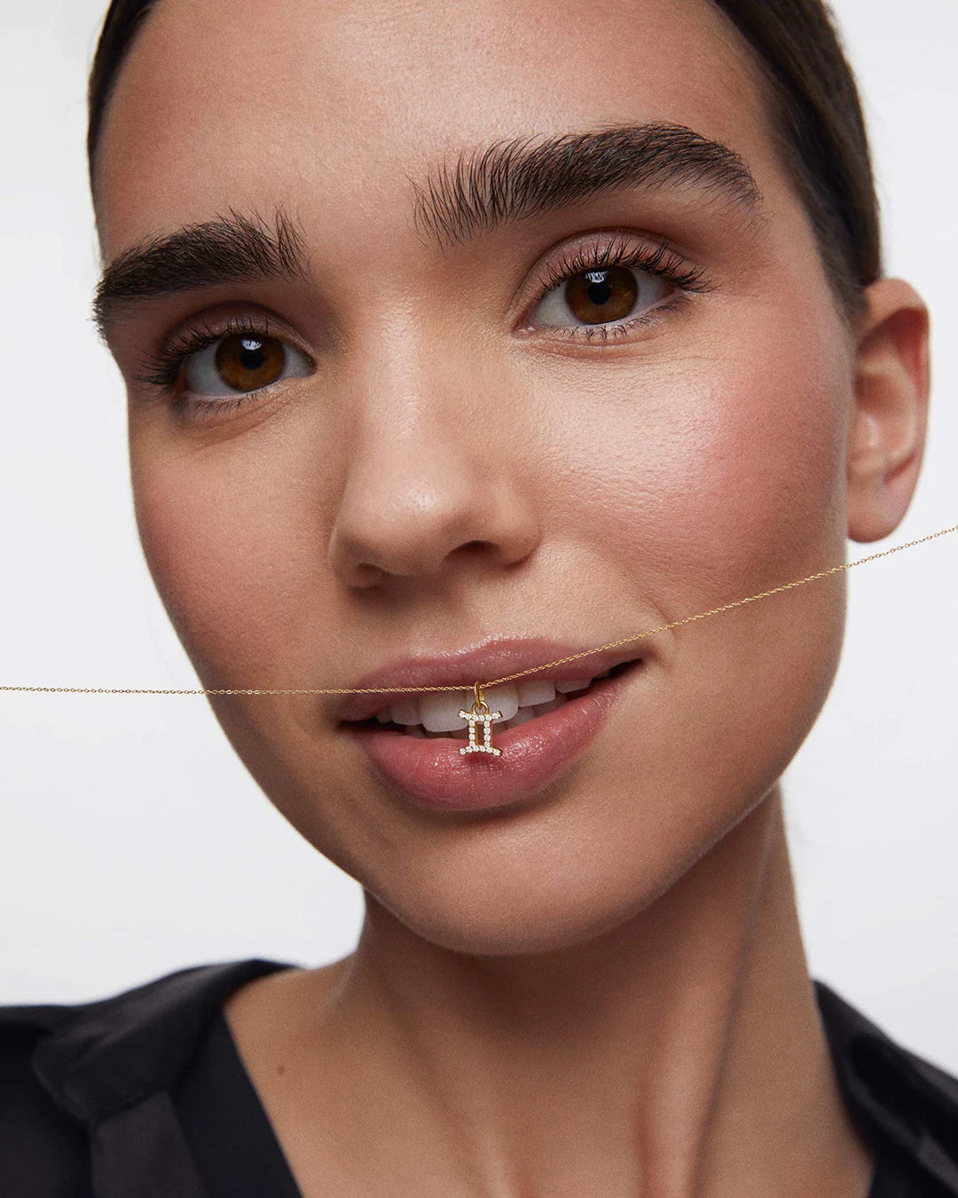 Charm com pingente de diamante Gemini Zodiac S em ouro amarelo 18k. Cada um dos Luxury Charms da Mumit é uma oportunidade de se conectar com suas memórias, seus sonhos mais profundos ou partes únicas de sua personalidade. Graças à durabilidade do ouro 18 quilates, este pequeno talismã de valor emocional incalculável acompanhará você por toda a vida. Além disso, o anel é um design exclusivo da Mumit, desenvolvido para obter um visual harmonioso ao combinar vários pingentes na mesma corrente. Comece sua coleção e explore o lado mais pessoal do mundo das joias. Gêmeos é um símbolo de: dualidade, comunicação, curiosidade, flexibilidade, engenhosidade.