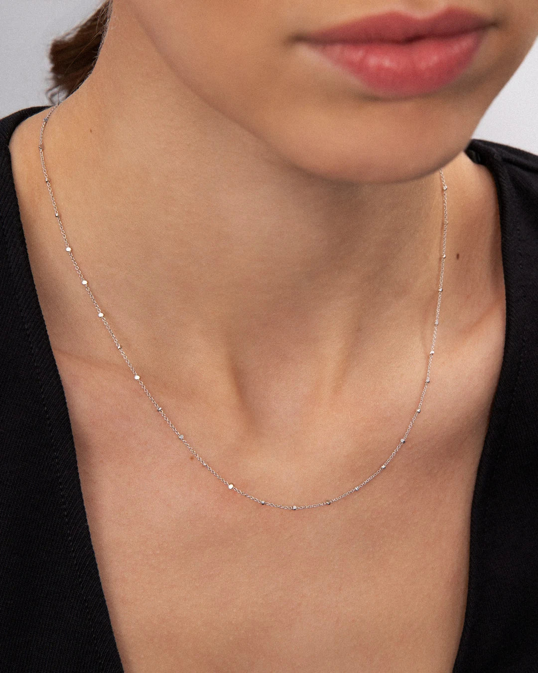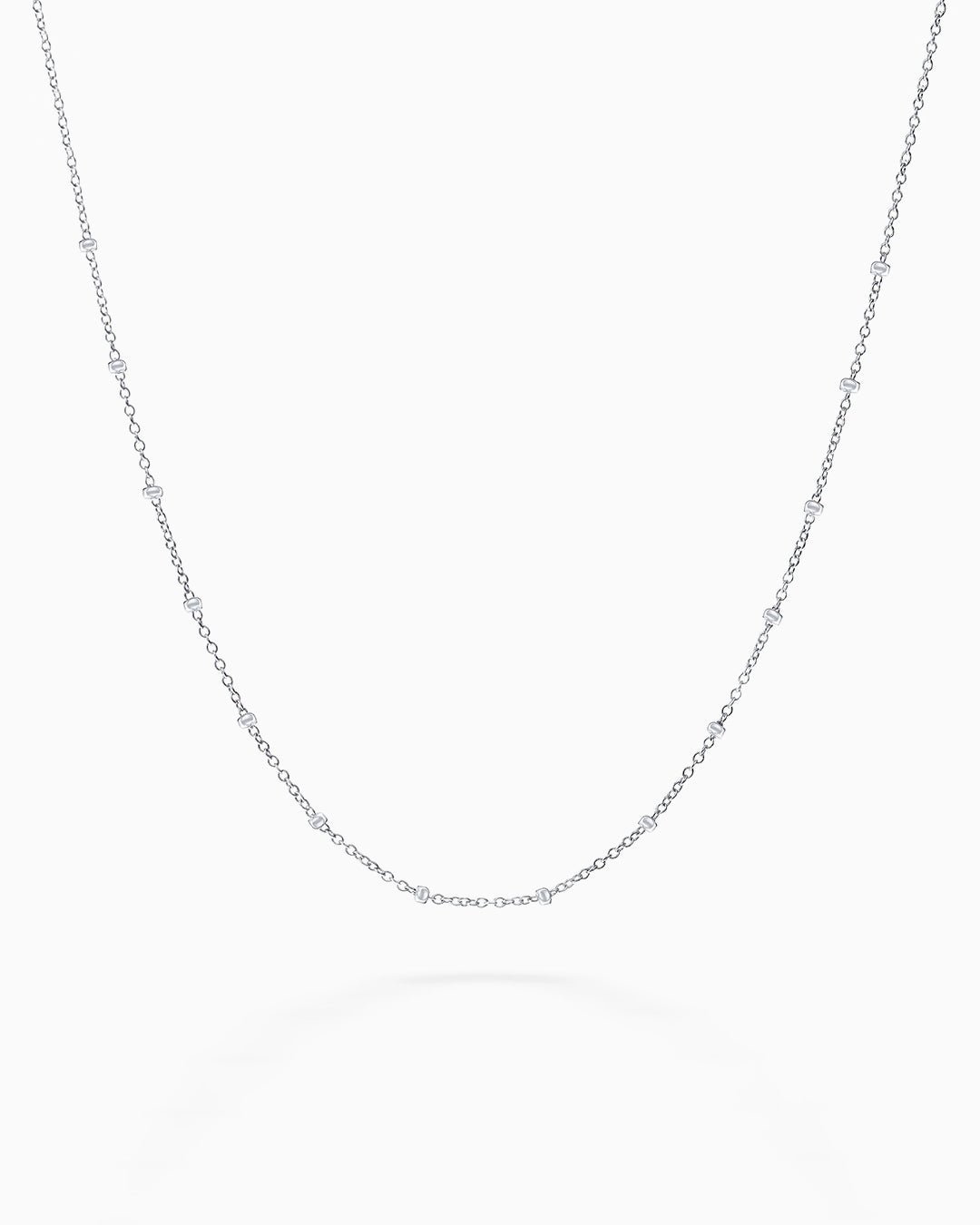 A corrente de contas de diamante feita de ouro branco 18 quilates combina delicadeza e tradição em joalheria em um design atemporal. Esta é uma corrente com um toque diferenciado, mas ao mesmo tempo confortável e versátil, pensada para ser combinada com todos os tipos de gargantilhas em diferentes alturas. Seu design permite a sobreposição de colares, oferecendo infinitas possibilidades. É composto por pequenas bolas em formato de diamante que são unidas por uma delicada corrente, refletindo a luz de uma forma inigualável. Possui fecho em argola não ajustável com medida padrão de 45 cm, o que contribui para seu conforto. A corrente de contas douradas com diamantes é um item básico que você vai adorar combinar.